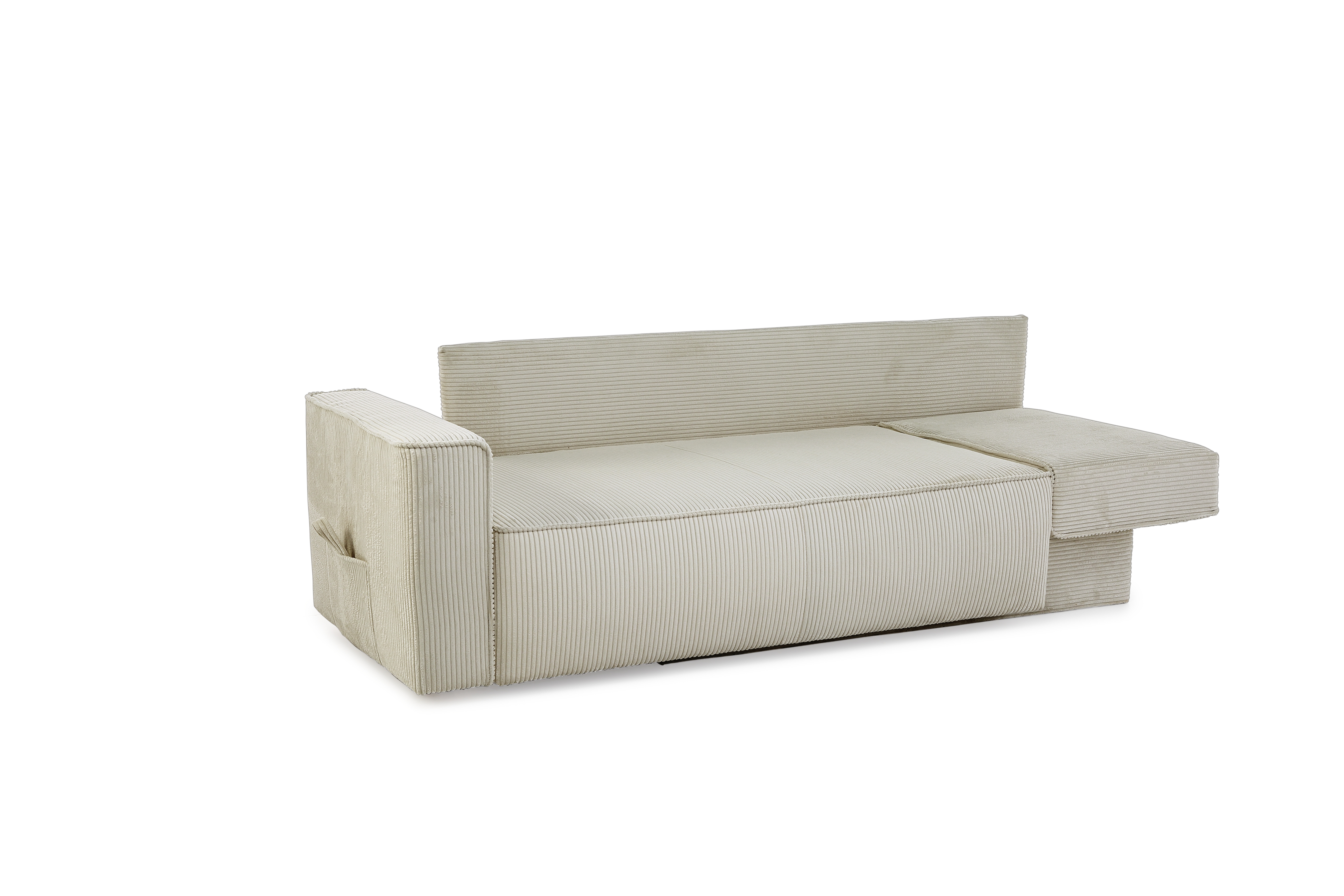 Le canapé se transforme facilement en lit en faisant coulisser l’assise latéralement à l’aide de la dragonne et en basculant l’accoudoir.
