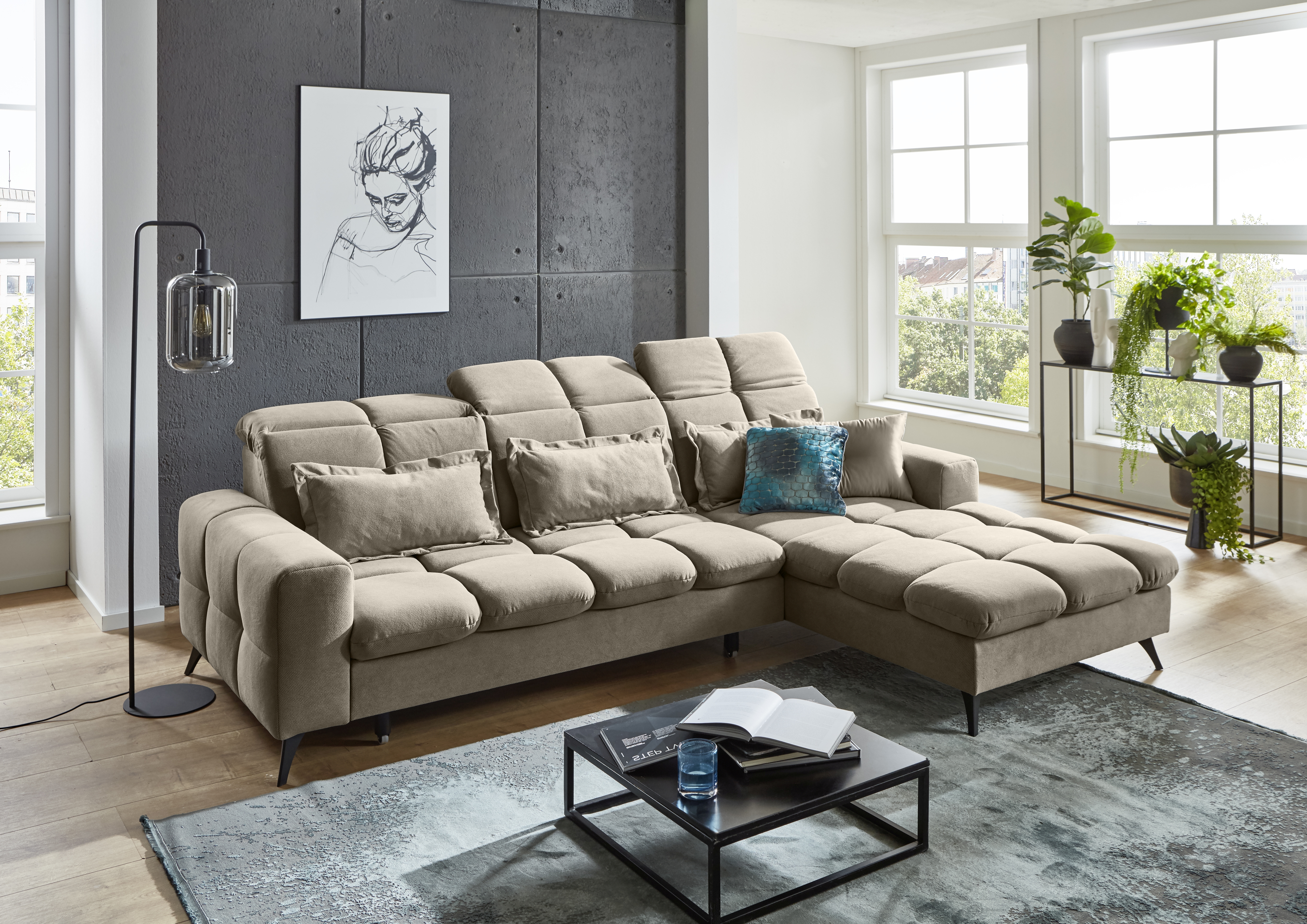 | Equipement canapés: | Appuie-tête(s), Dos habillé, Méridienne à droite, Prolongement de l'assise manuellement, incl. coussins | ||