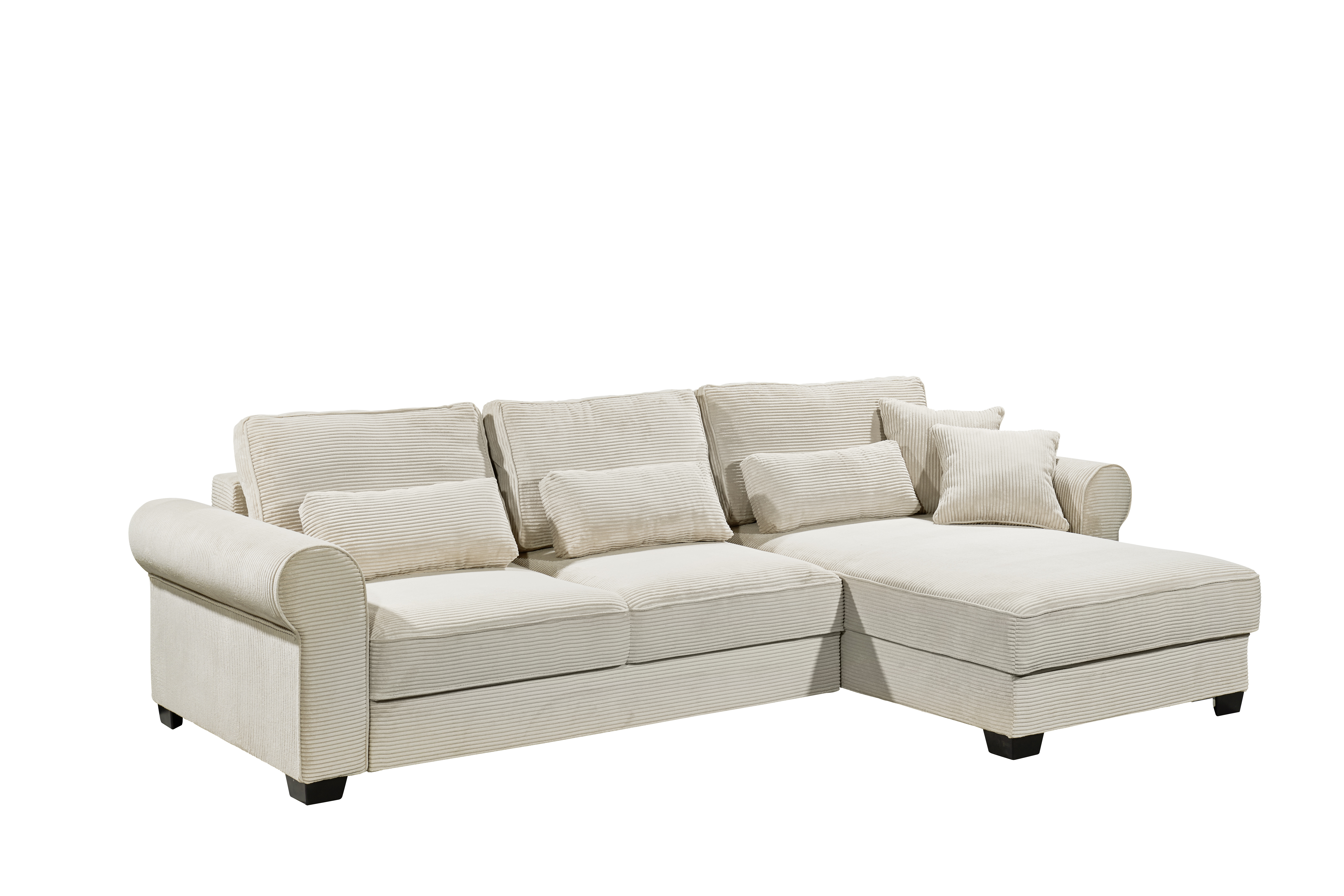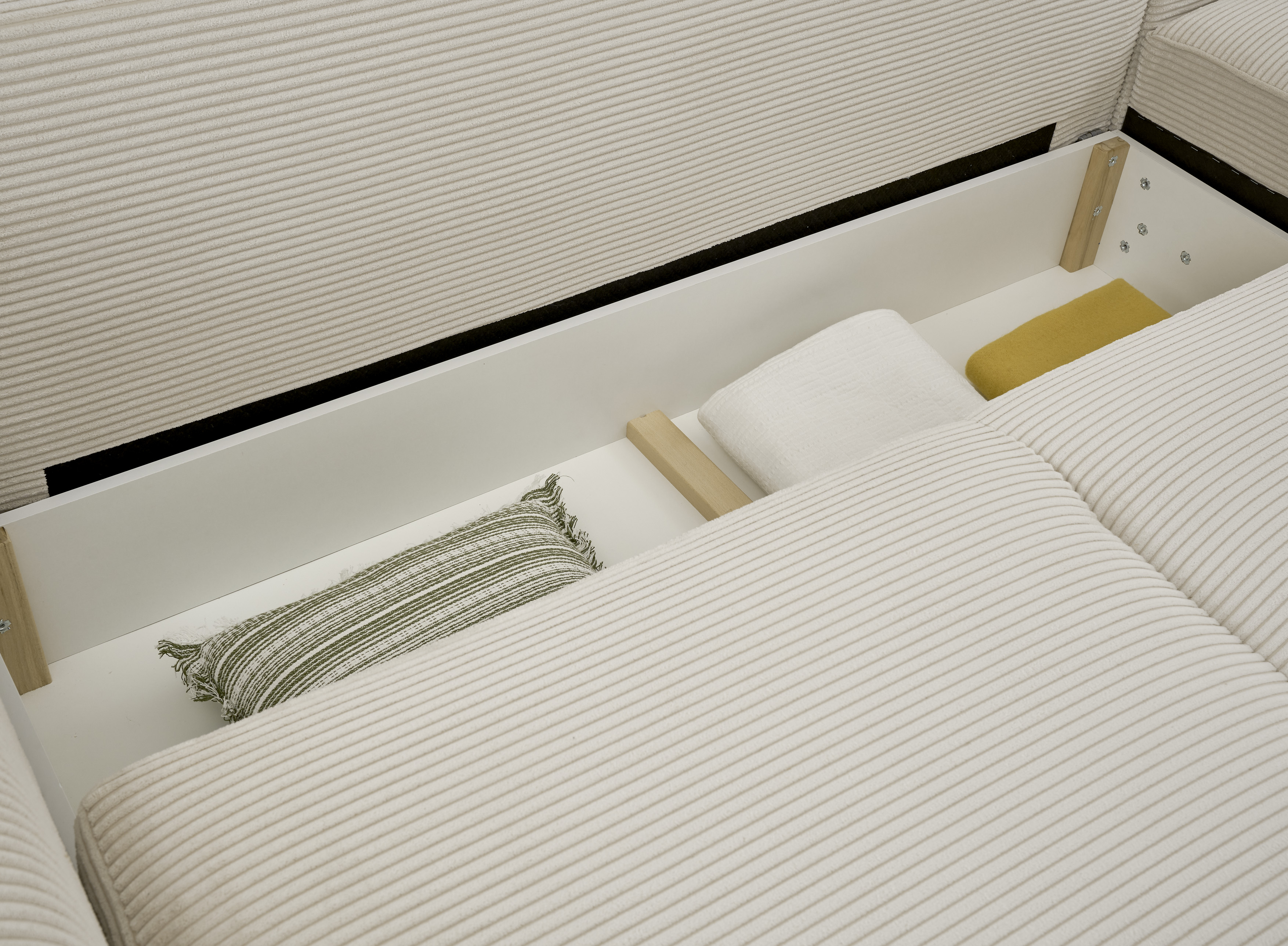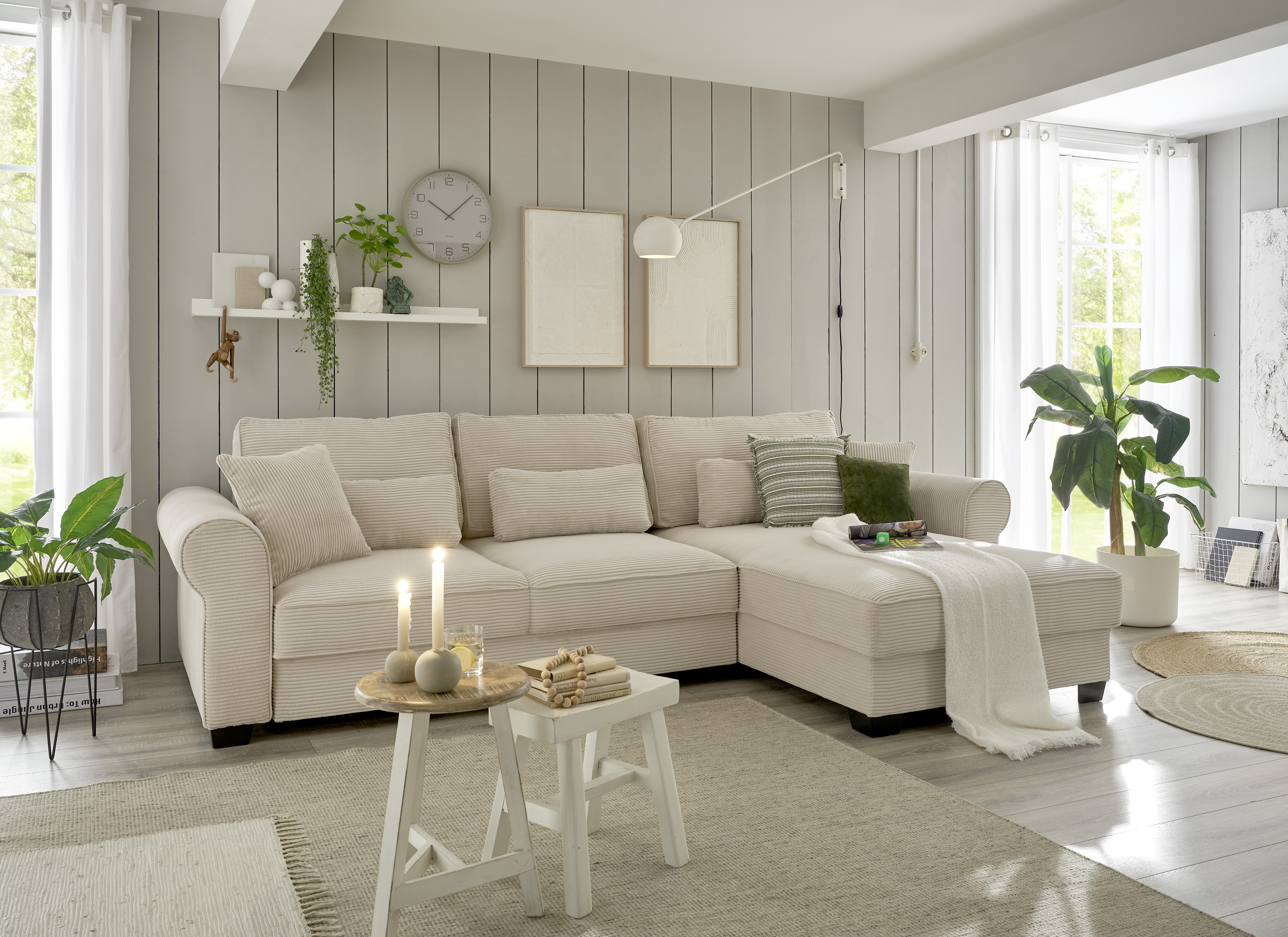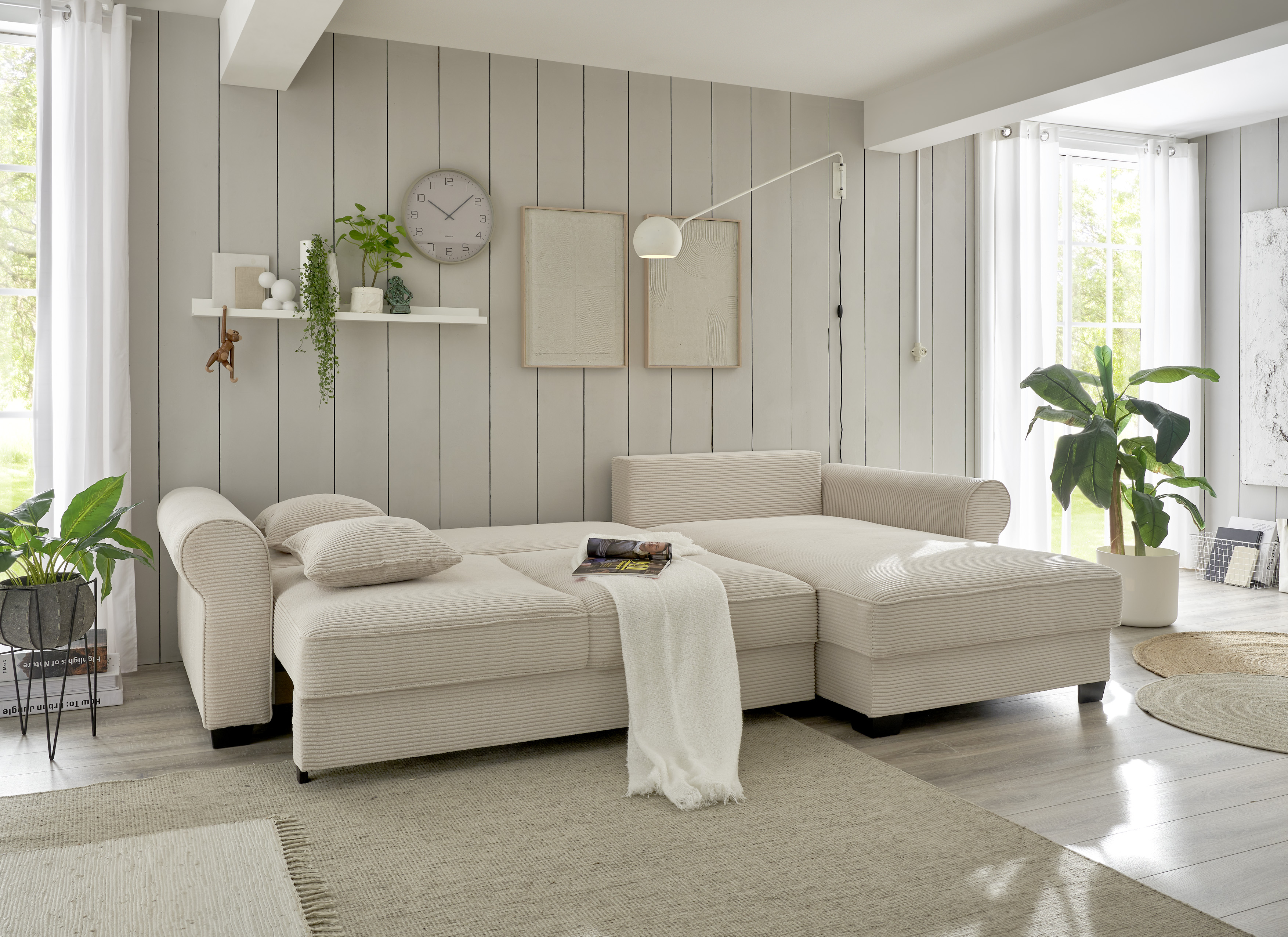 Equipement canapés: | Dos habillé, Méridienne à droite ou à gauche, incl. coffre de lit, incl. coussins |