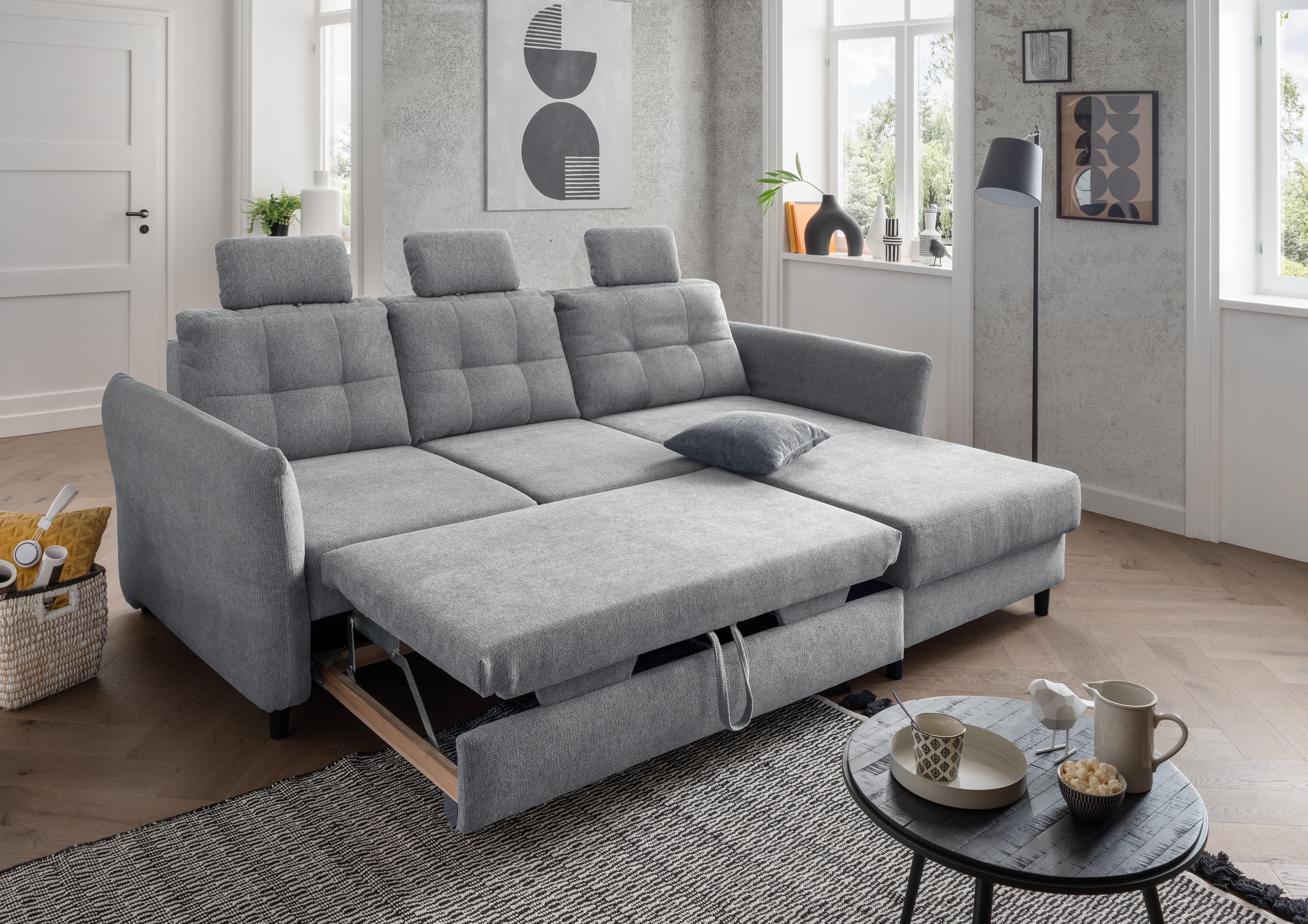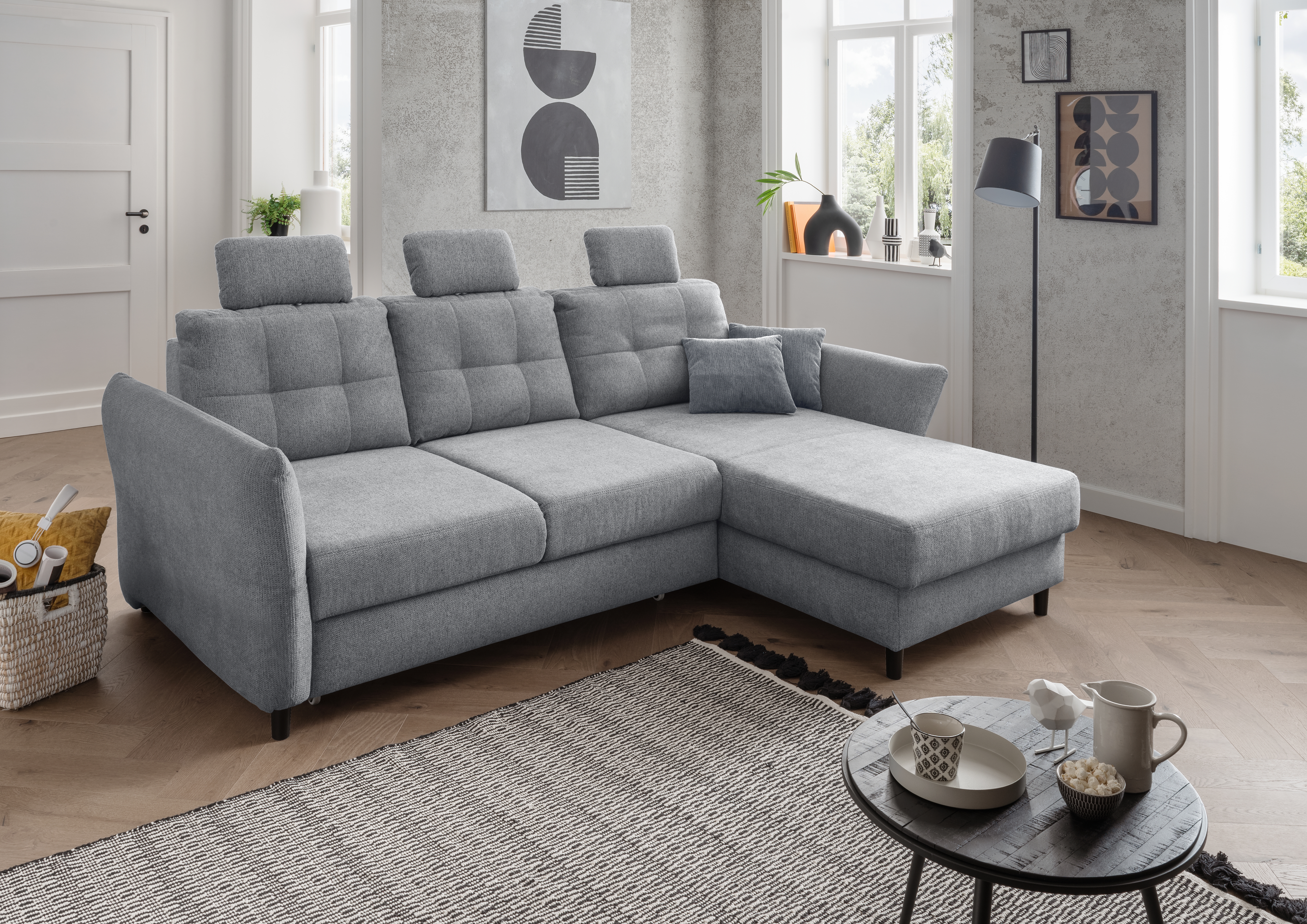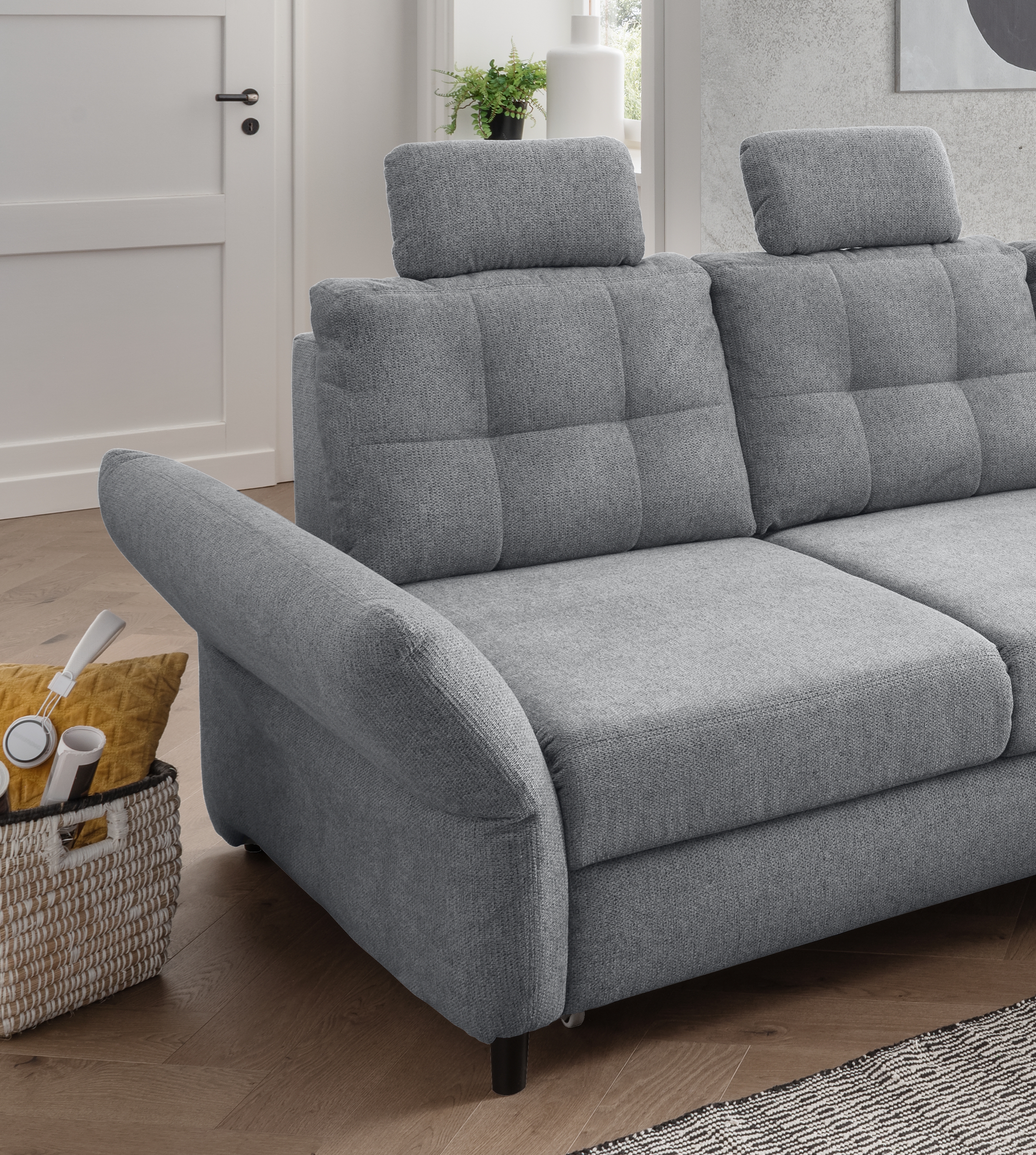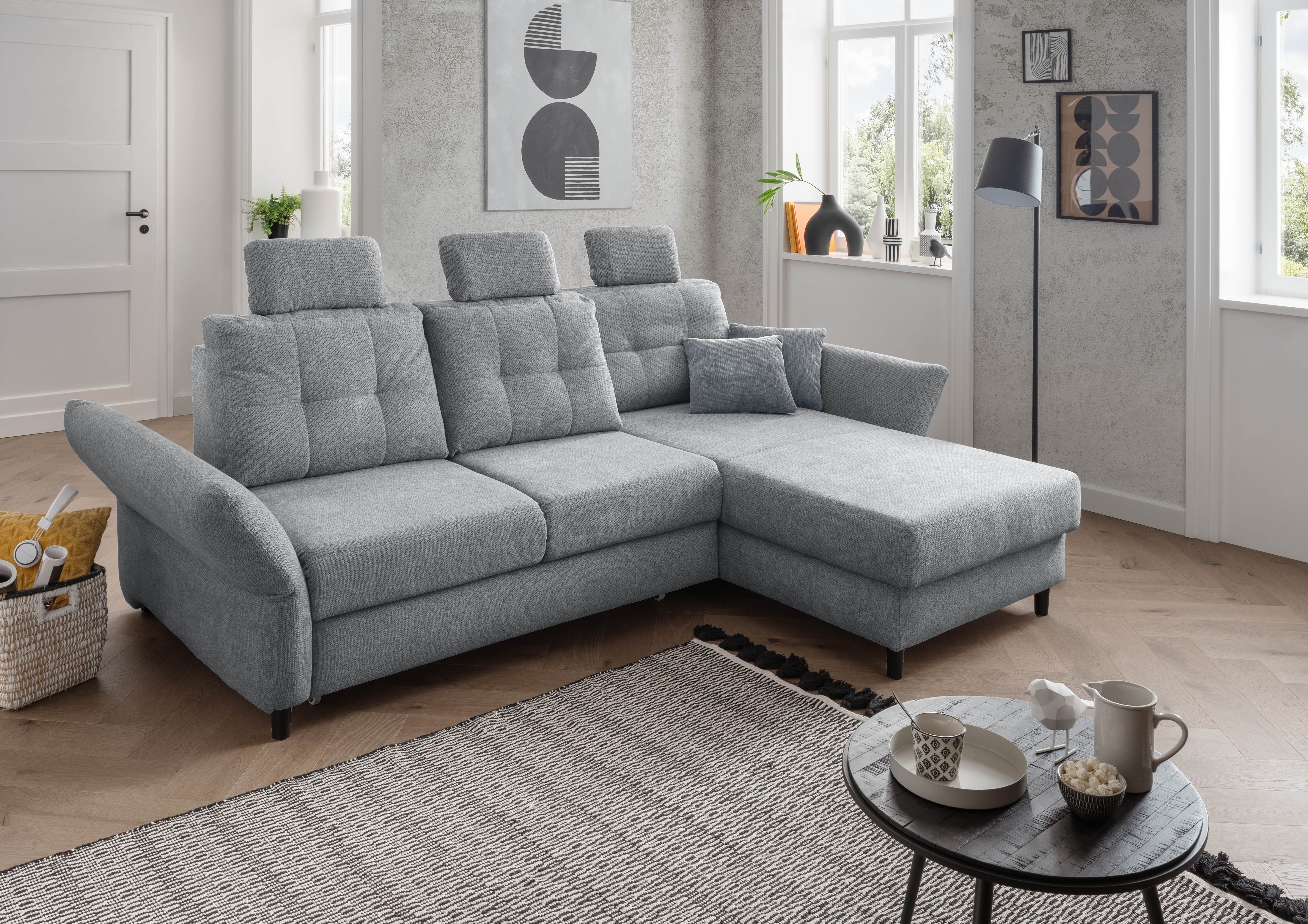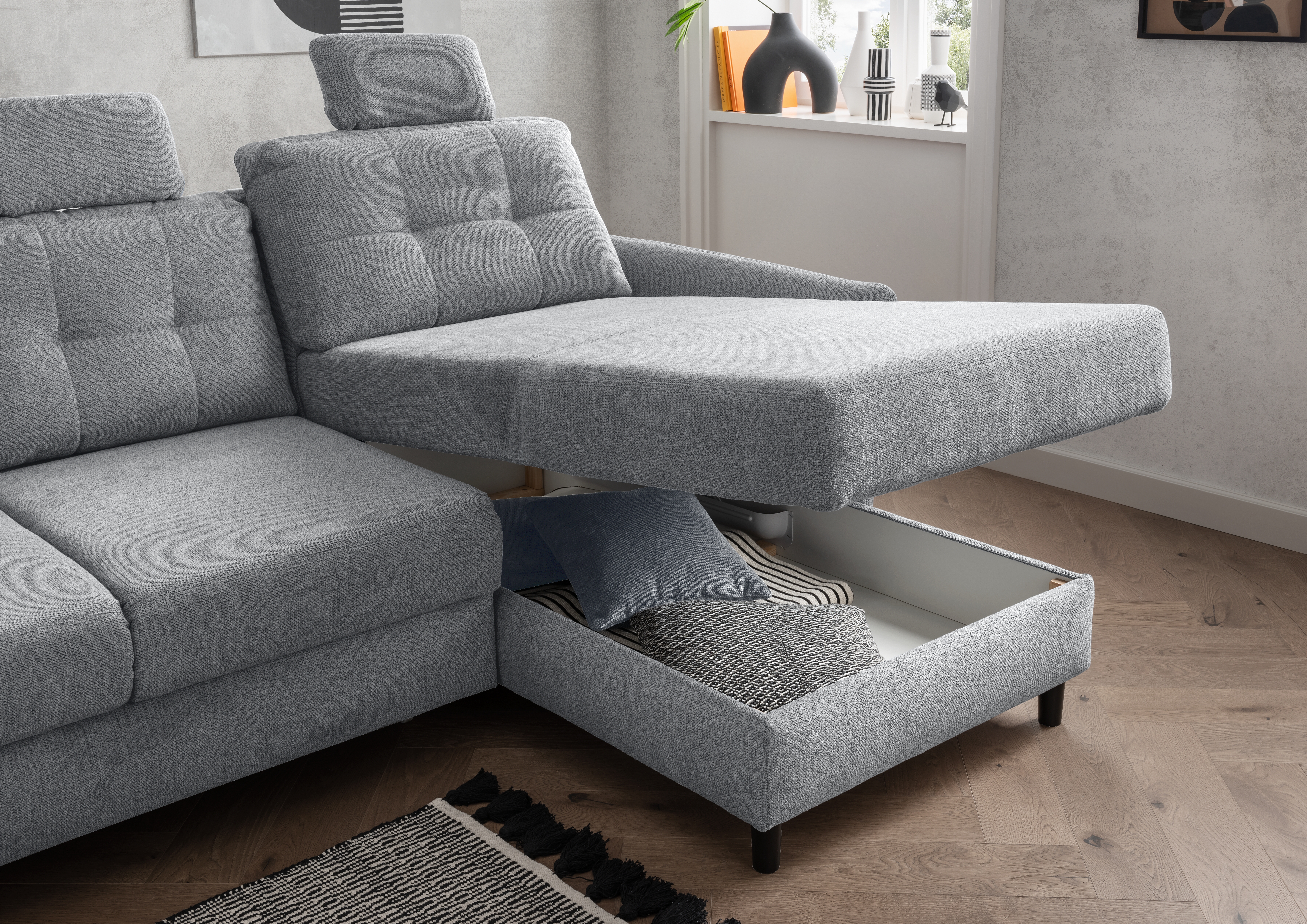 | Equipement canapés: | Dos habillé, Méridienne à droite, incl. coffre de lit, incl. coussins | ||