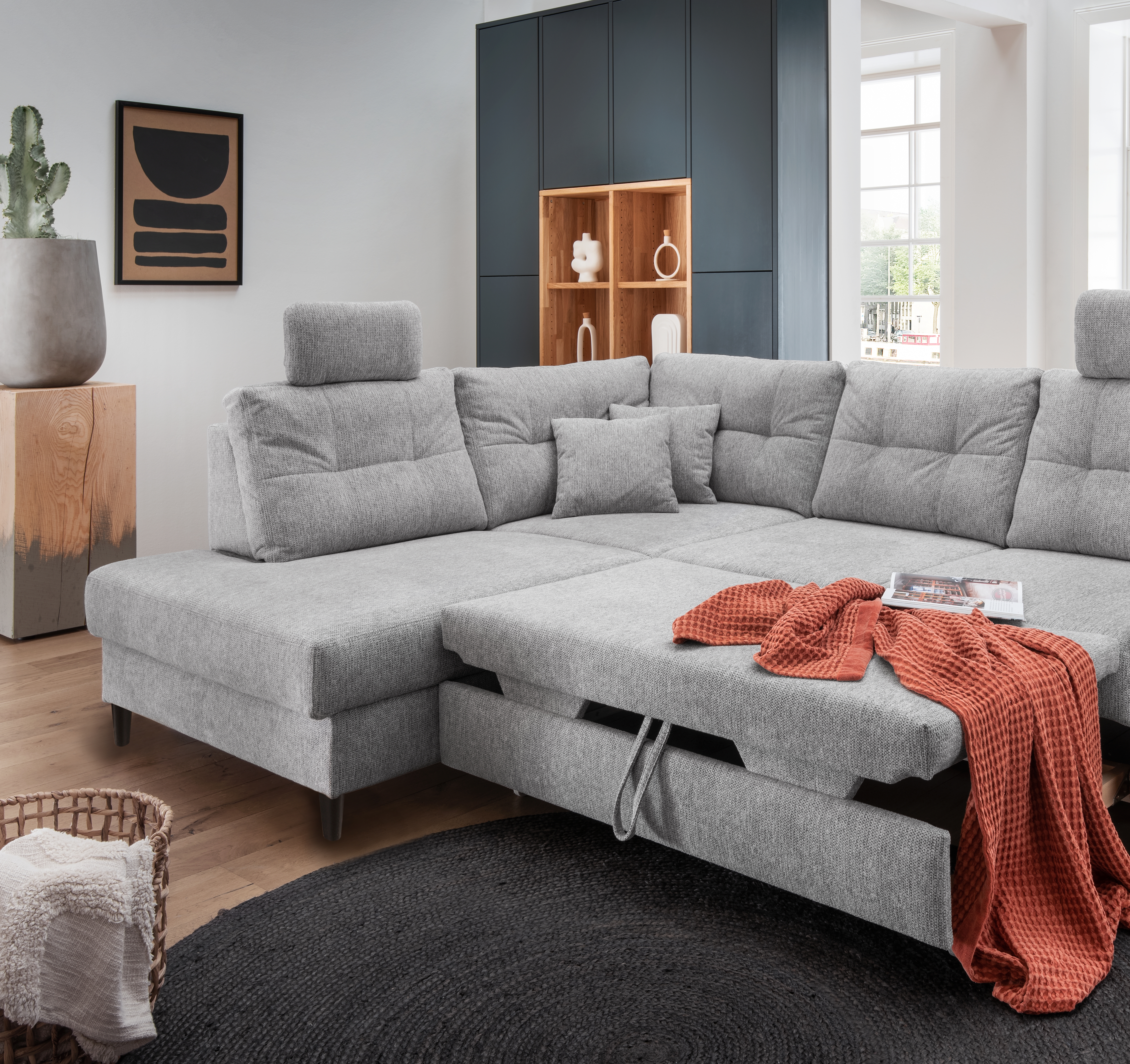 | Equipement canapés: | Appuie-tête(s), Dos habillé, Méridienne à gauche, incl. coffre de lit, incl. coussins | ||