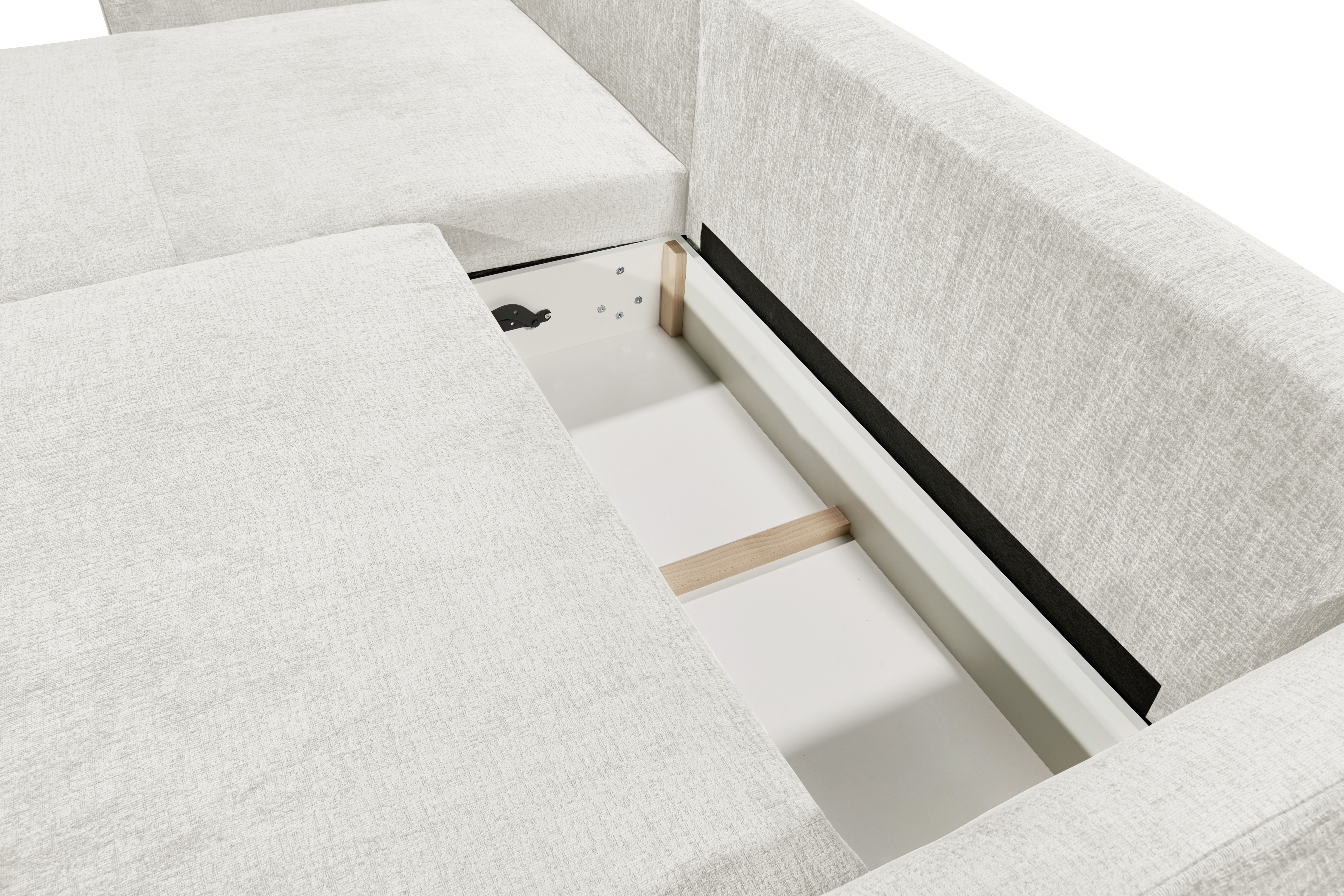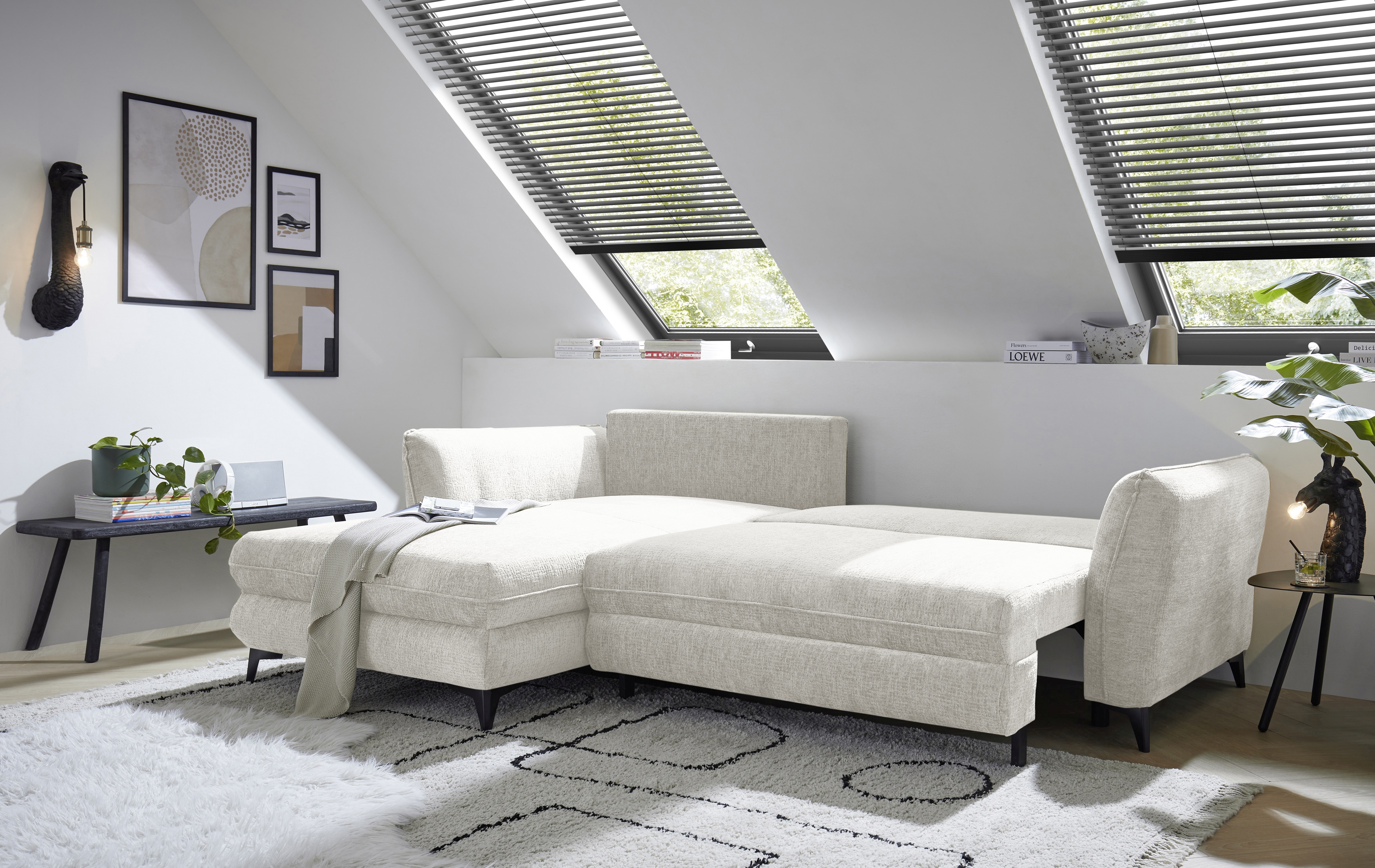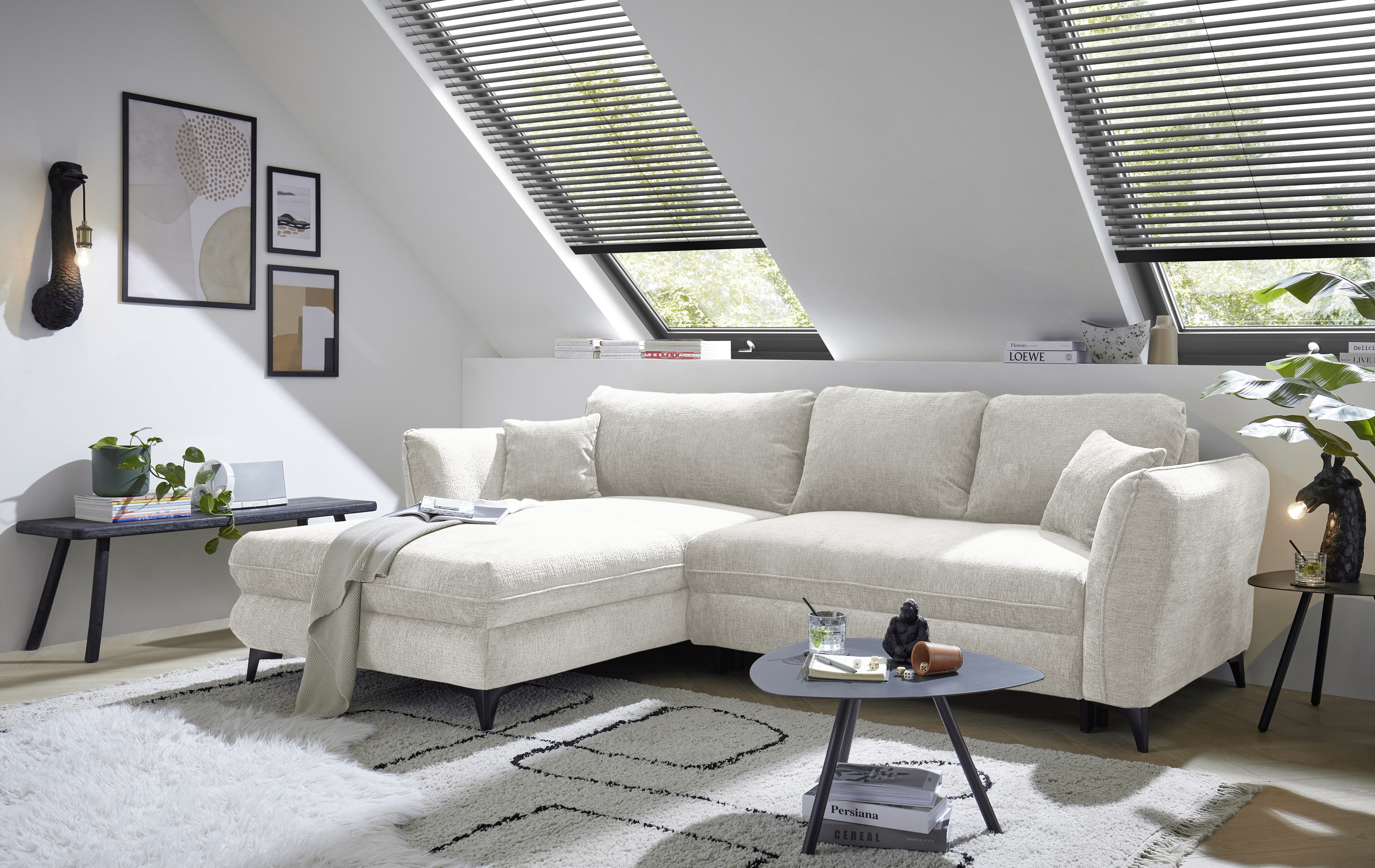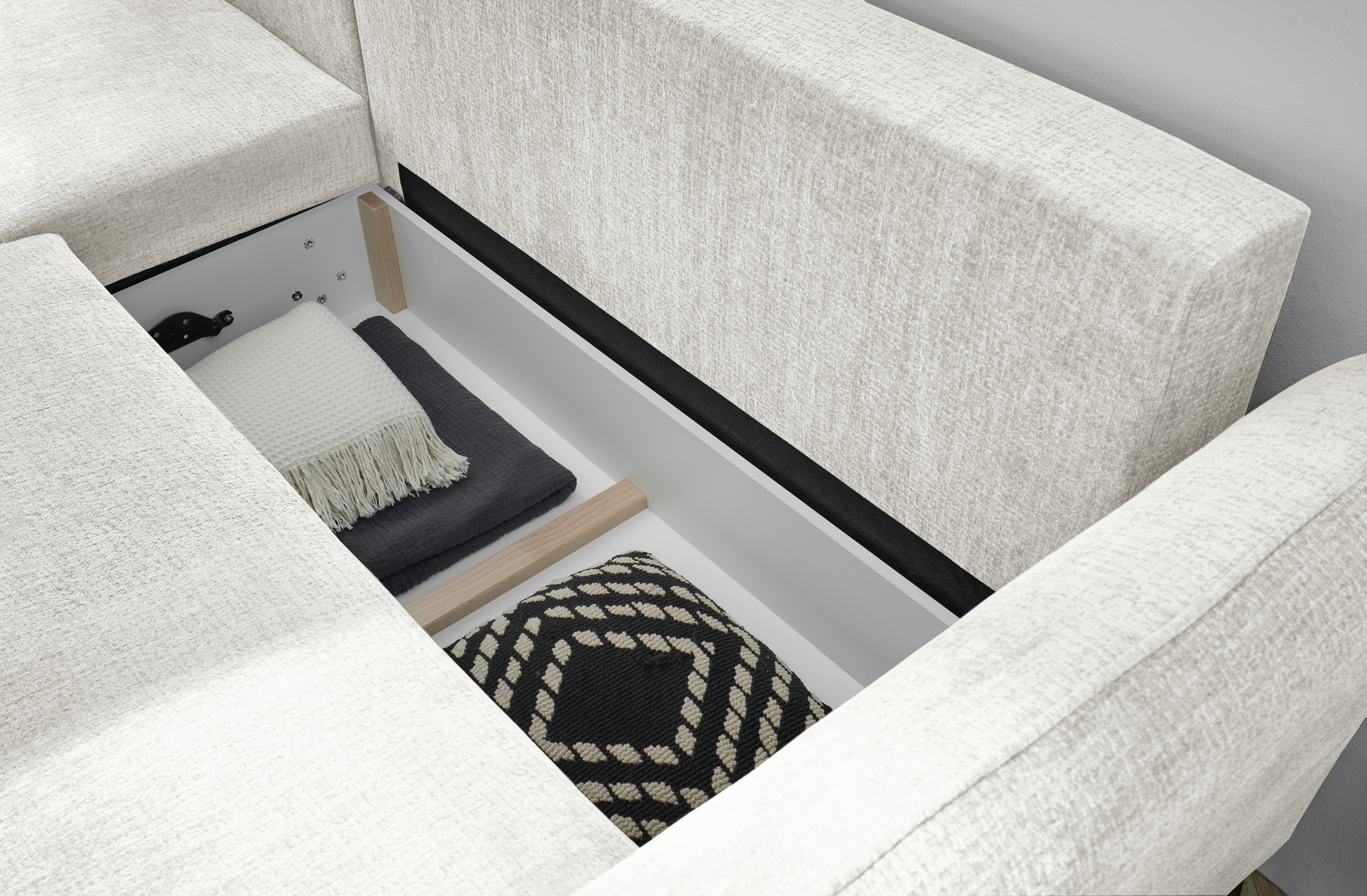 Equipement canapés: | Dos habillé, Méridienne à gauche, incl. coffre de lit, incl. coussins |