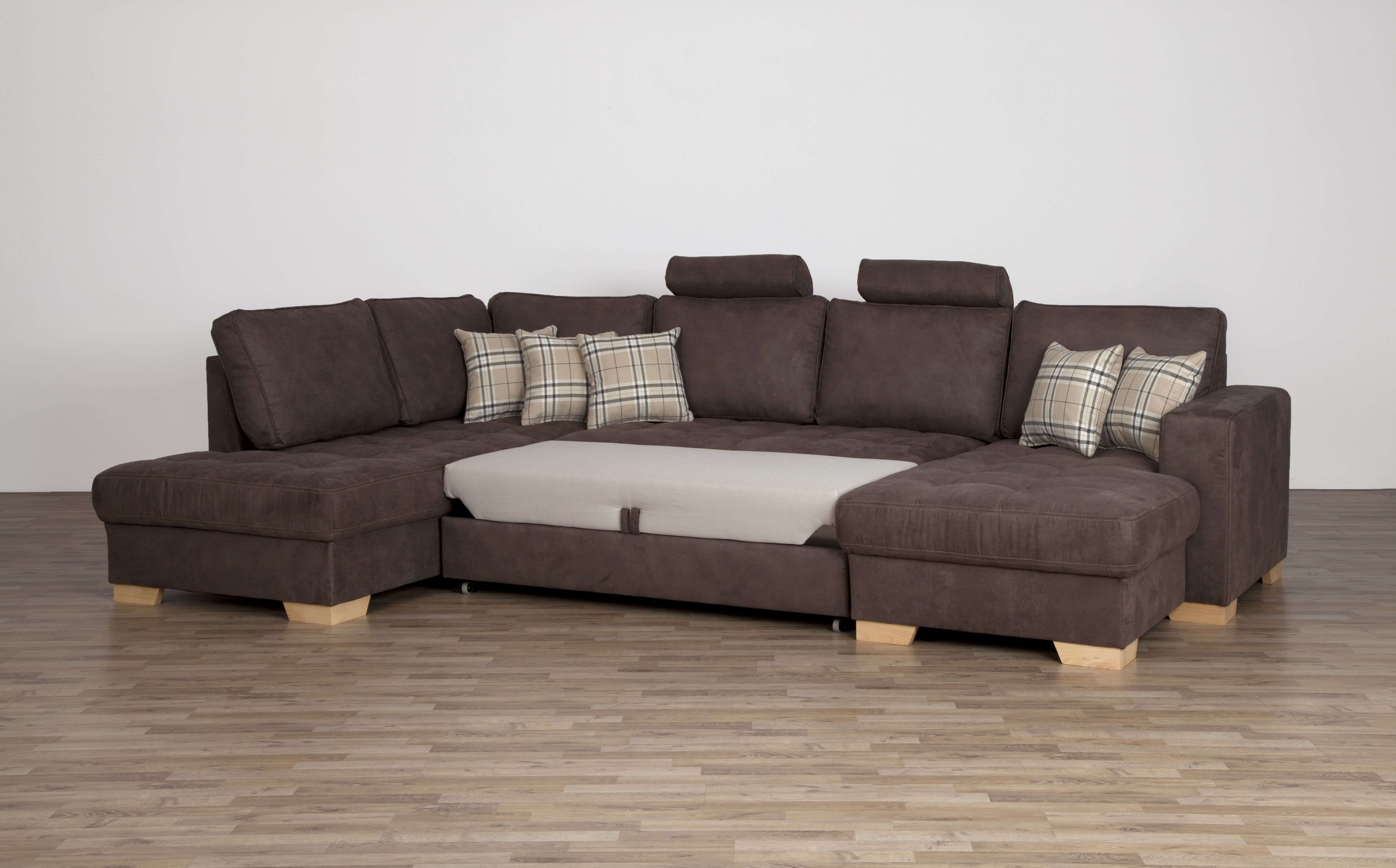 Revêtement : canapé en tissu 6053 ton chocolat/marron laiteux 100% polyester ; couture décorative ton beige clair ; coussins décoratifs en tissu 720 ton beige / à carreaux marron 100% polypropylène