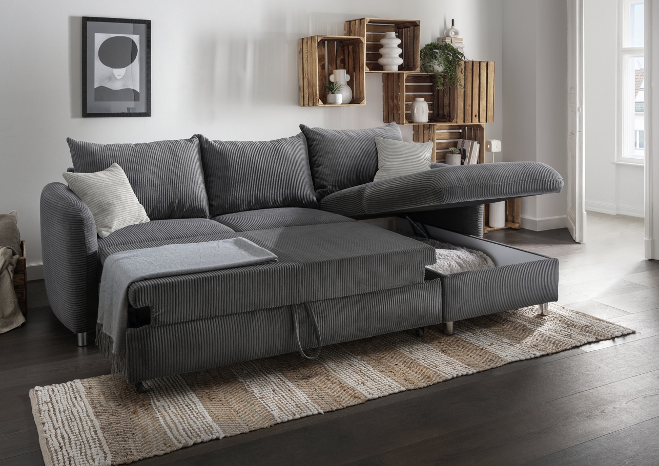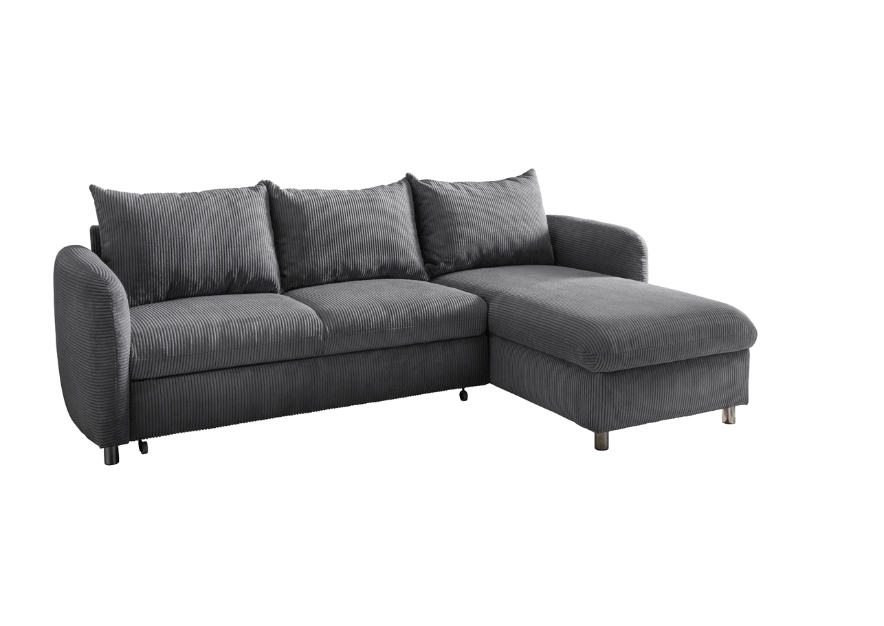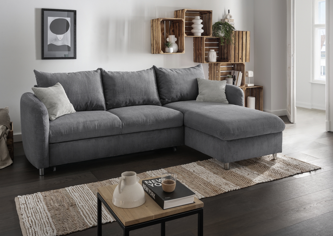 Revêtement : canapé d’angle en velours côtelé gris 4801, 100% polyester; coussins décoratifs en velours côtelé ton argent 4802, 100% polyester