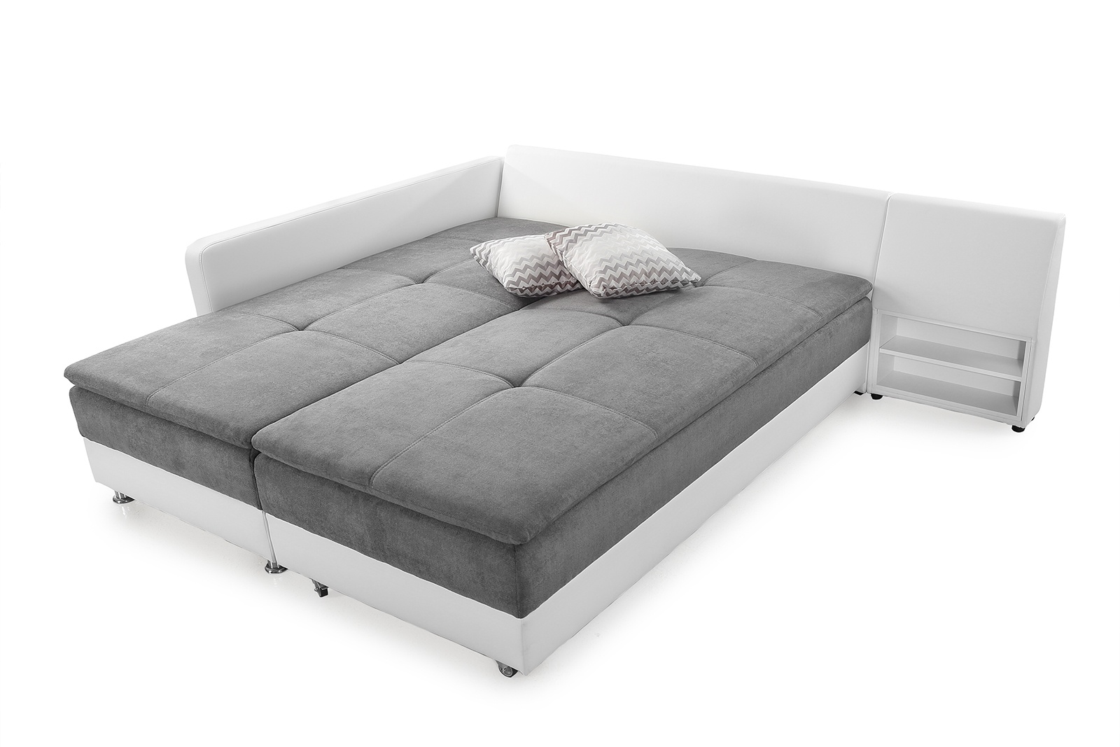 Canapé d'angle ultra tendance avec un garnissage de qualité et système boxspring. Ce canapé peut être utilisé tous les jours comme lit grâce à son garnissage avec suspension nosag et sa surface de couchage 7 zones avec ressorts ensachés en forme de tonneaux. Il garantit un excellent confort d'assise et de couchage grâce à son surmatelas en mousse haute résilience intégré. En faisant pivoter la méridienne, on crée une surface de couchage plus importante. Un chevet pratique avec deux casiers est intégré dans le dossier.