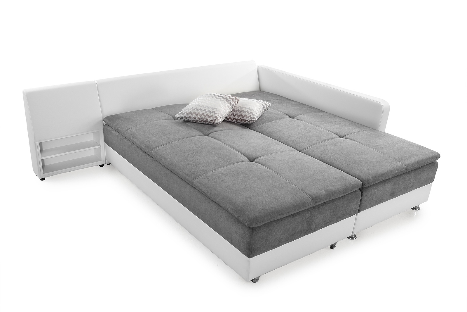 Canapé d'angle ultra tendance avec un garnissage de qualité et système boxspring. Ce canapé peut être utilisé tous les jours comme lit grâce à son garnissage avec suspension nosag et sa surface de couchage 7 zones avec ressorts ensachés en forme de tonneaux. Il garantit un excellent confort d'assise et de couchage grâce à son surmatelas en mousse haute résilience intégré. En faisant pivoter la méridienne, on crée une surface de couchage plus importante. Un chevet pratique avec deux casiers est intégré dans le dossier.