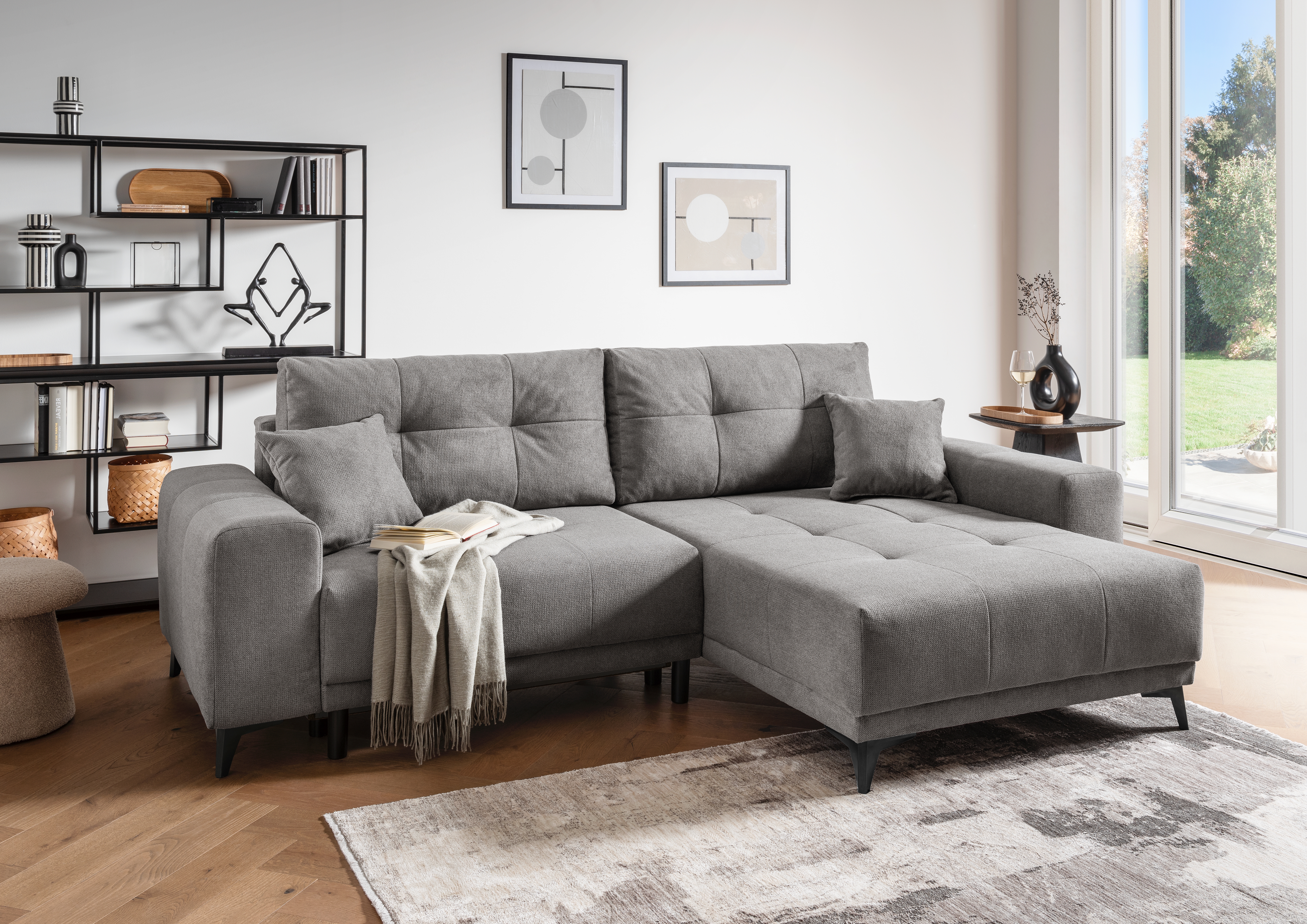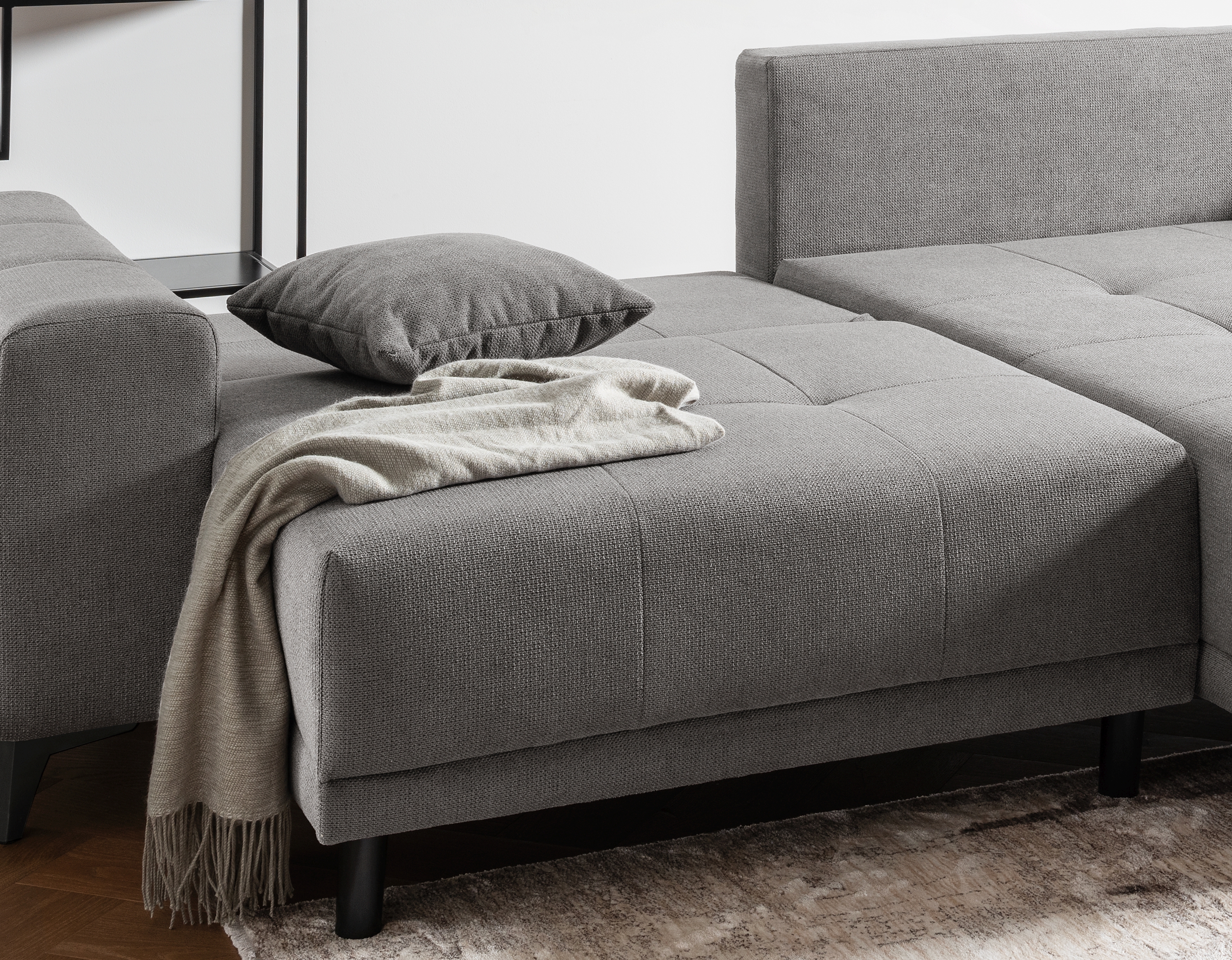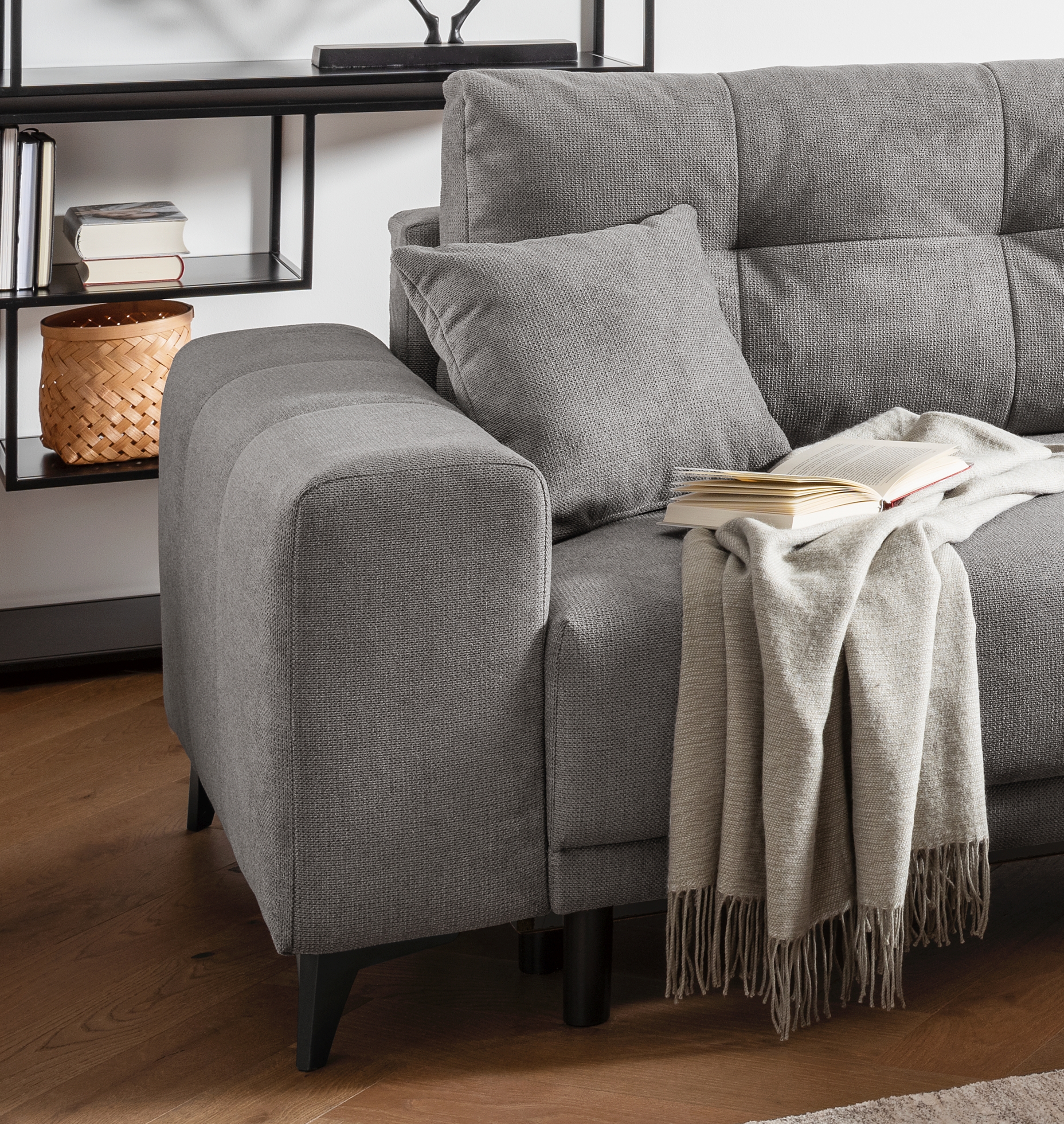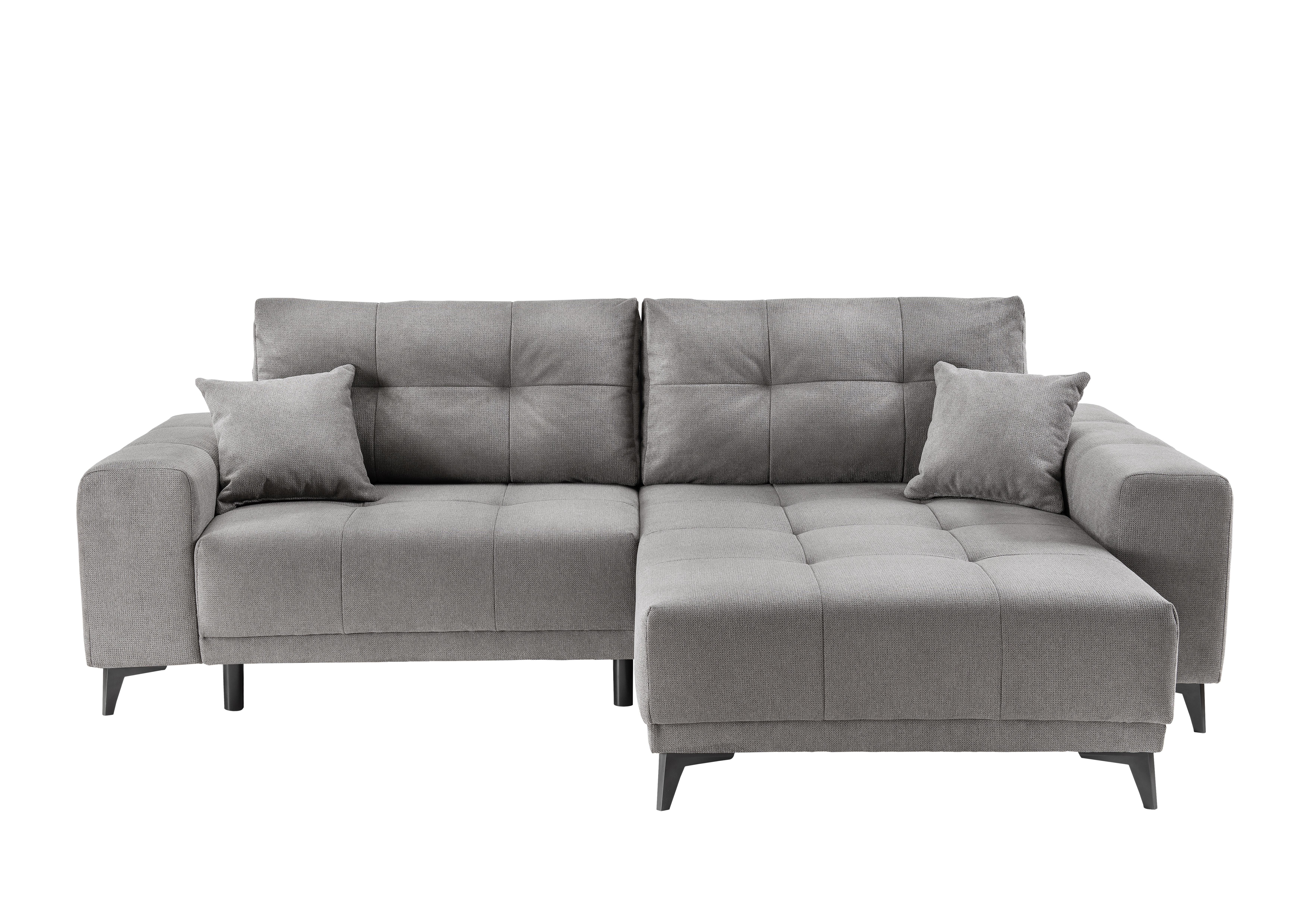 Ce coin canapé pratique en tissu gris foncé offre une solution fonctionnelle pour s'asseoir et s'allonger confortablement au quotidien. Le canapé 2 places dispose d'une fonction d'inclinaison intégrée et d'un coffre de rangement pour les couvertures ou les coussins. Le pouf situé à droite agrandit la surface d'assise et offre un confort supplémentaire. La combinaison d'un sommier à ressorts et d'une mousse confortable garantit une assise agréable. Deux coussins de dossier et deux coussins décoratifs sont inclus dans la livraison. Grâce à son dossier recouvert de tissu, ce meuble peut être placé librement dans la pièce. Idéal pour tous ceux qui recherchent une solution d'ameublement peu encombrante et économique.