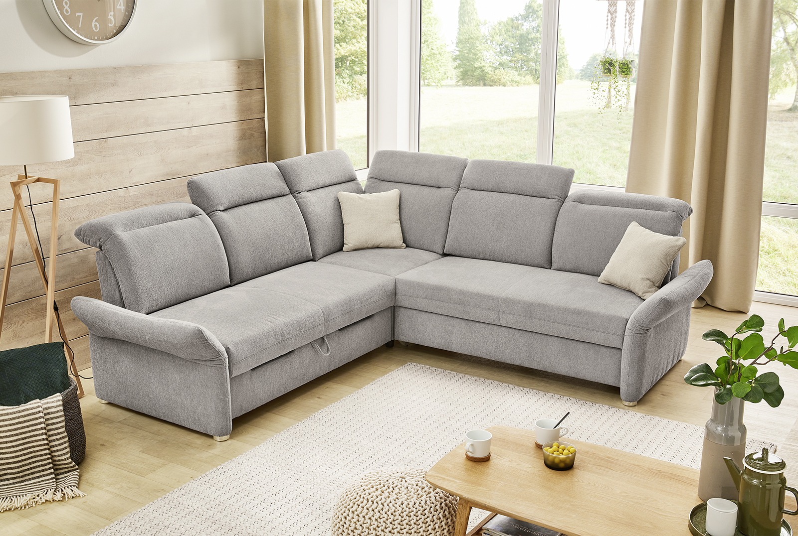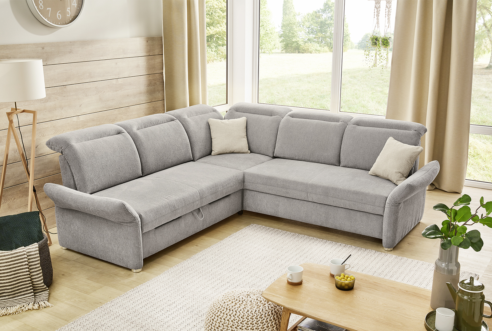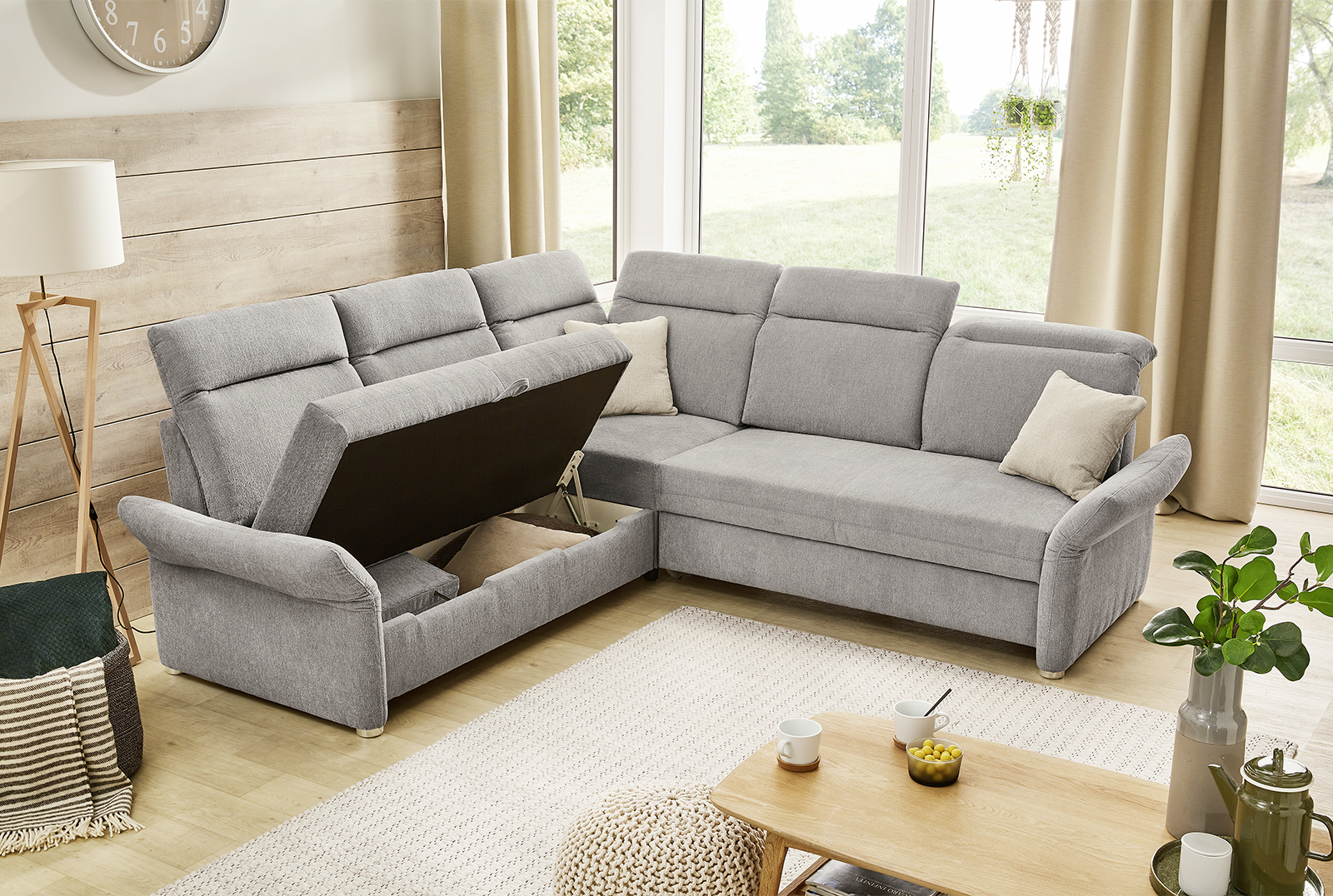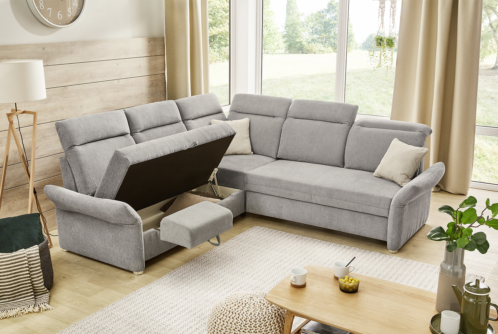 | Equipement canapés: | Dos habillé, Méridienne à droite ou à gauche, incl. coffre de lit, incl. coussins | ||