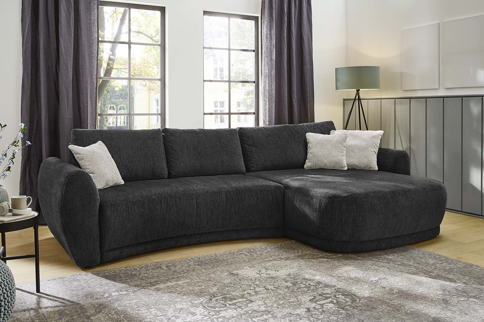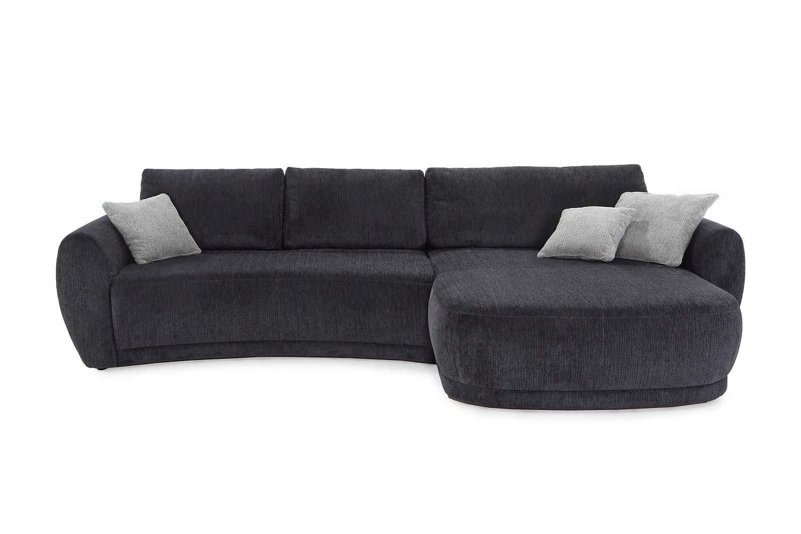 Revêtement : canapé d’angle dans un tissu chenille 443/06 ton noir 100% polyester; coussins décoratifs en tissu chenille ton gris clair 443/29, 100% polyester