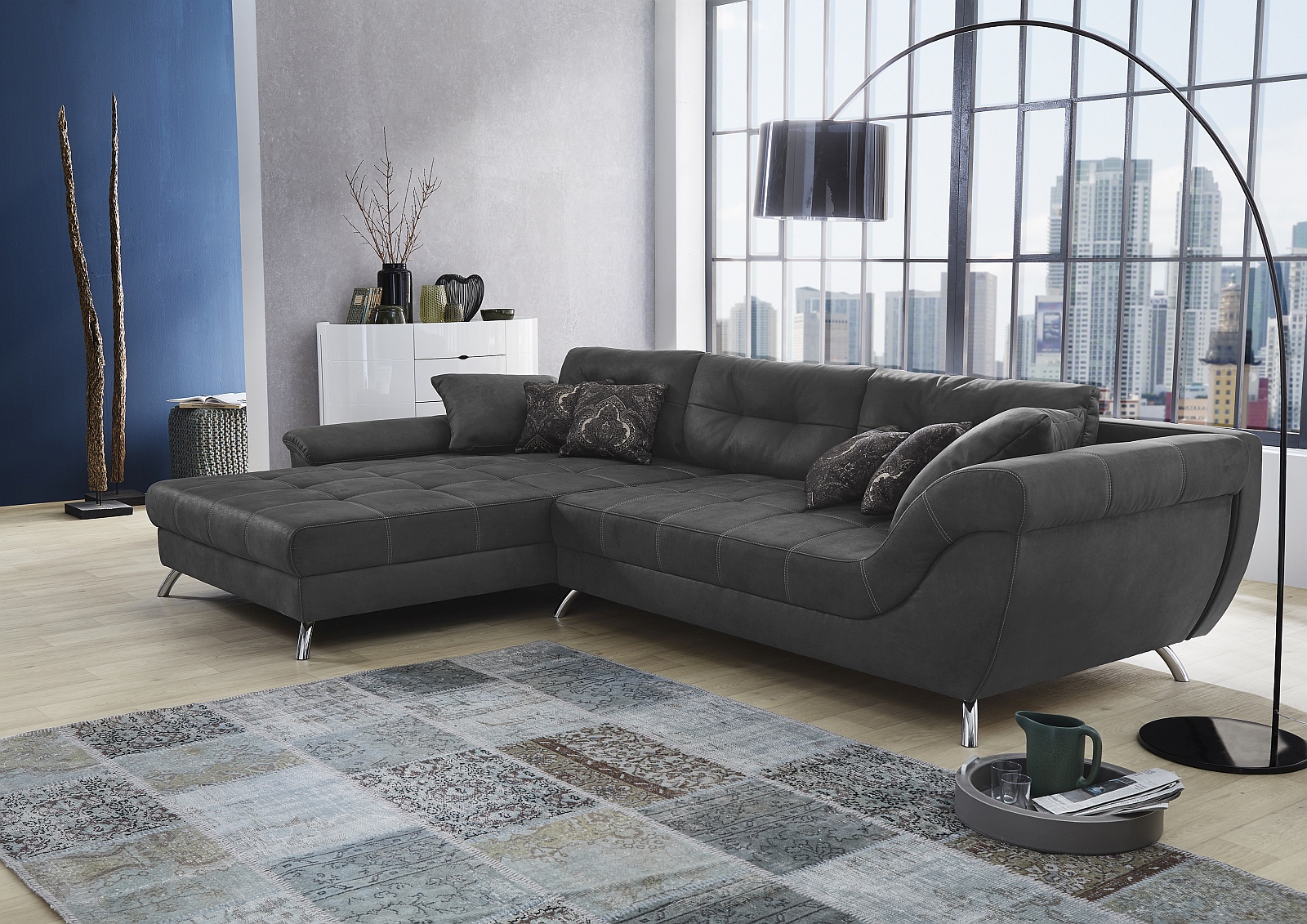 Canapé d'angle ultra tendance aspect nubuck avec une surpiqûre attrayante dans l'assise. Le garnissage de qualité avec suspension nosag, mousse polyéther et couche de mousse haute résilience intégrée garantit un excellent confort d'assise. Grâce à son dos habillé, ce canapé peut être positionné librement dans la pièce.