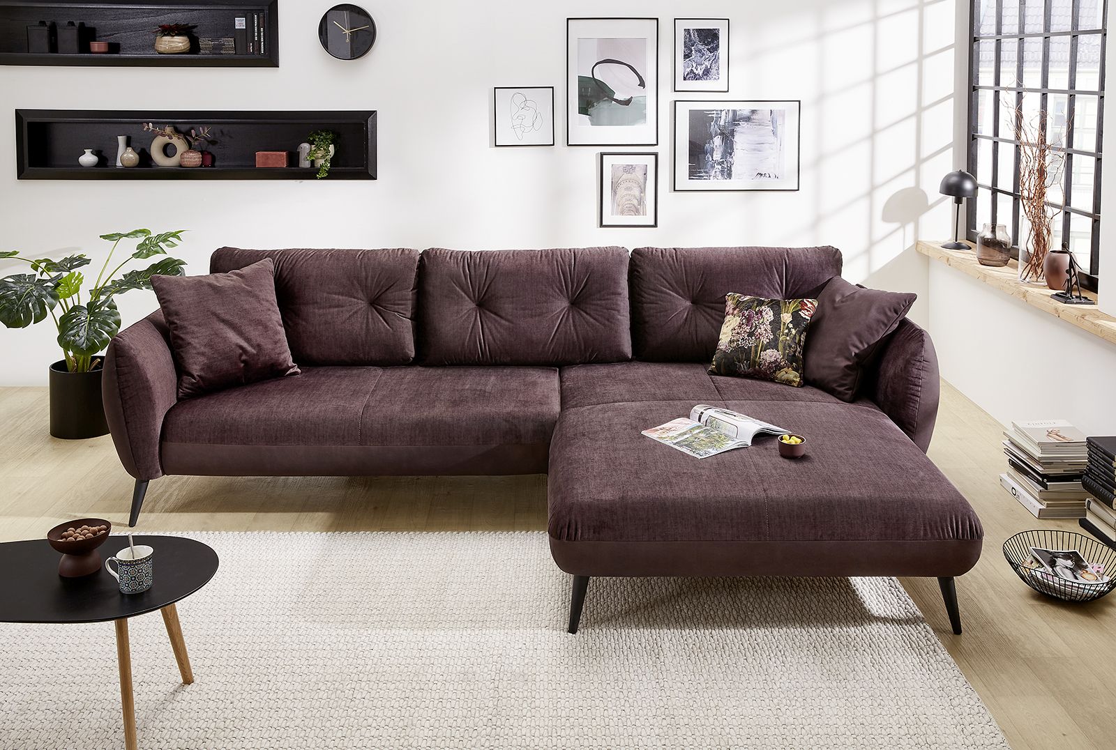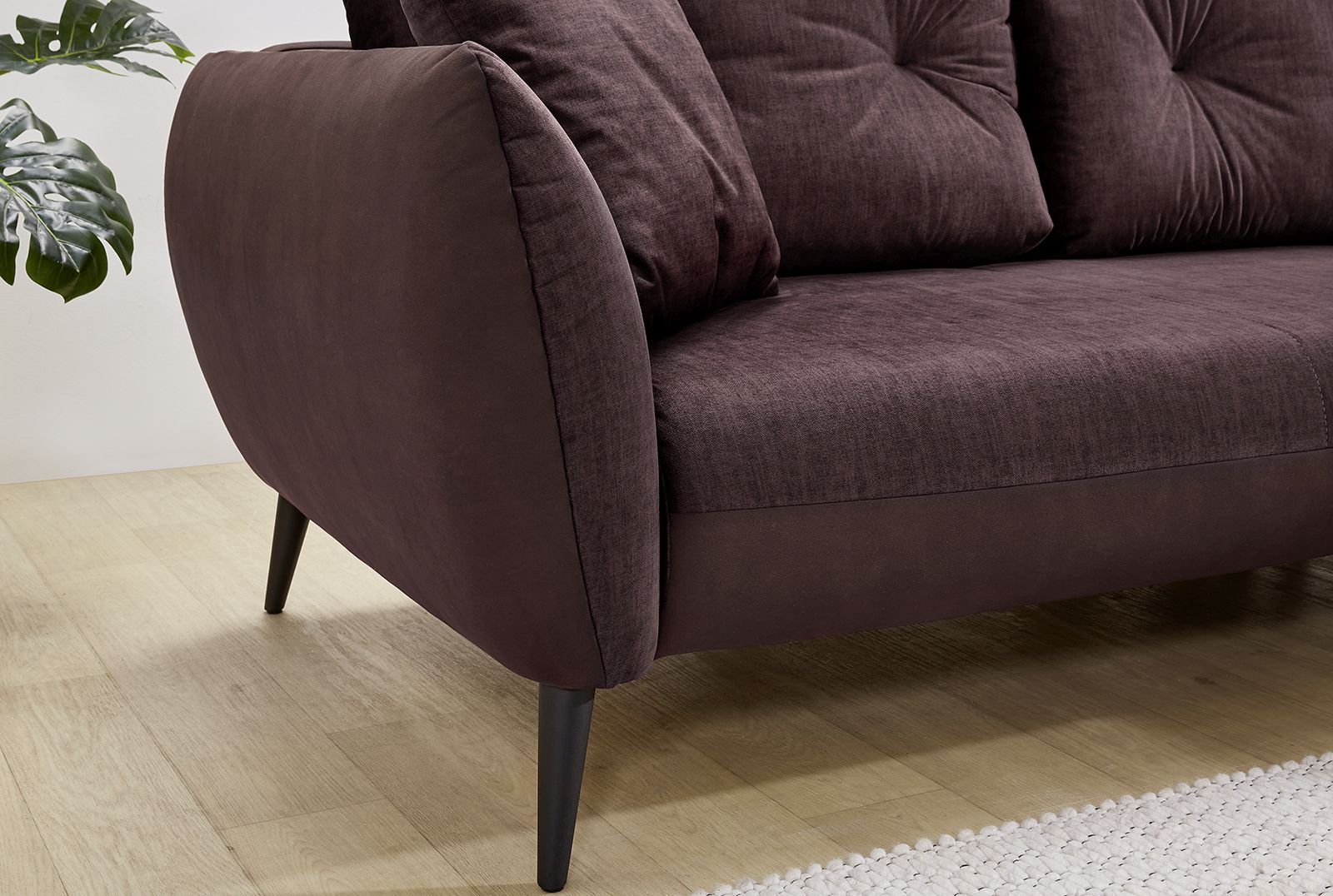 Revêtement : corps dans un tissu ton aubergine 100% polyester ; assise, grands coussins et coussins de dos dans un tissu aspect velours ton aubergine 100% polyester ; coussins décoratifs dans un tissu microfibre à motif floral 100% polyester