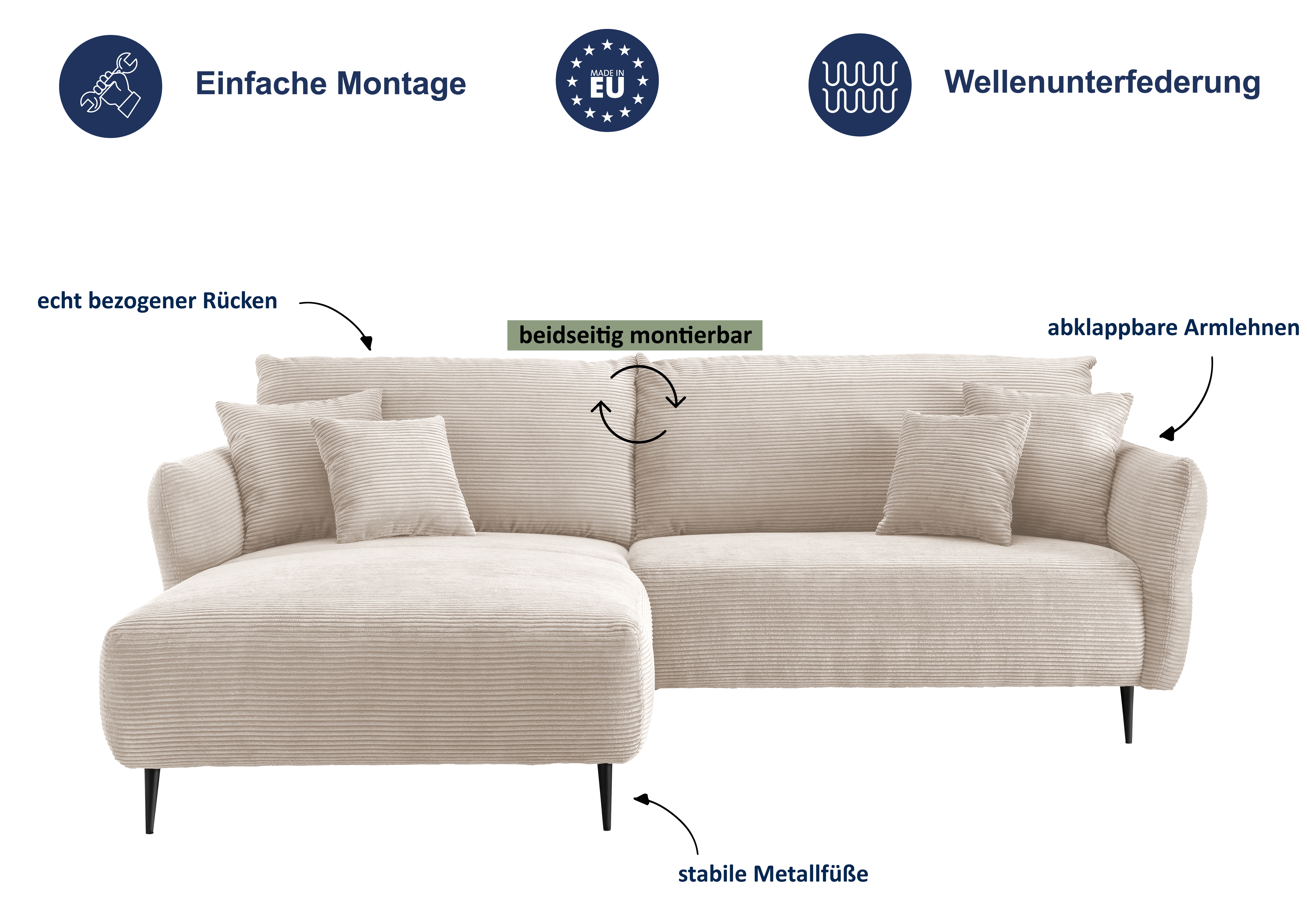 | Equipement canapés: | Méridienne à droite ou à gauche, incl. coussins | ||