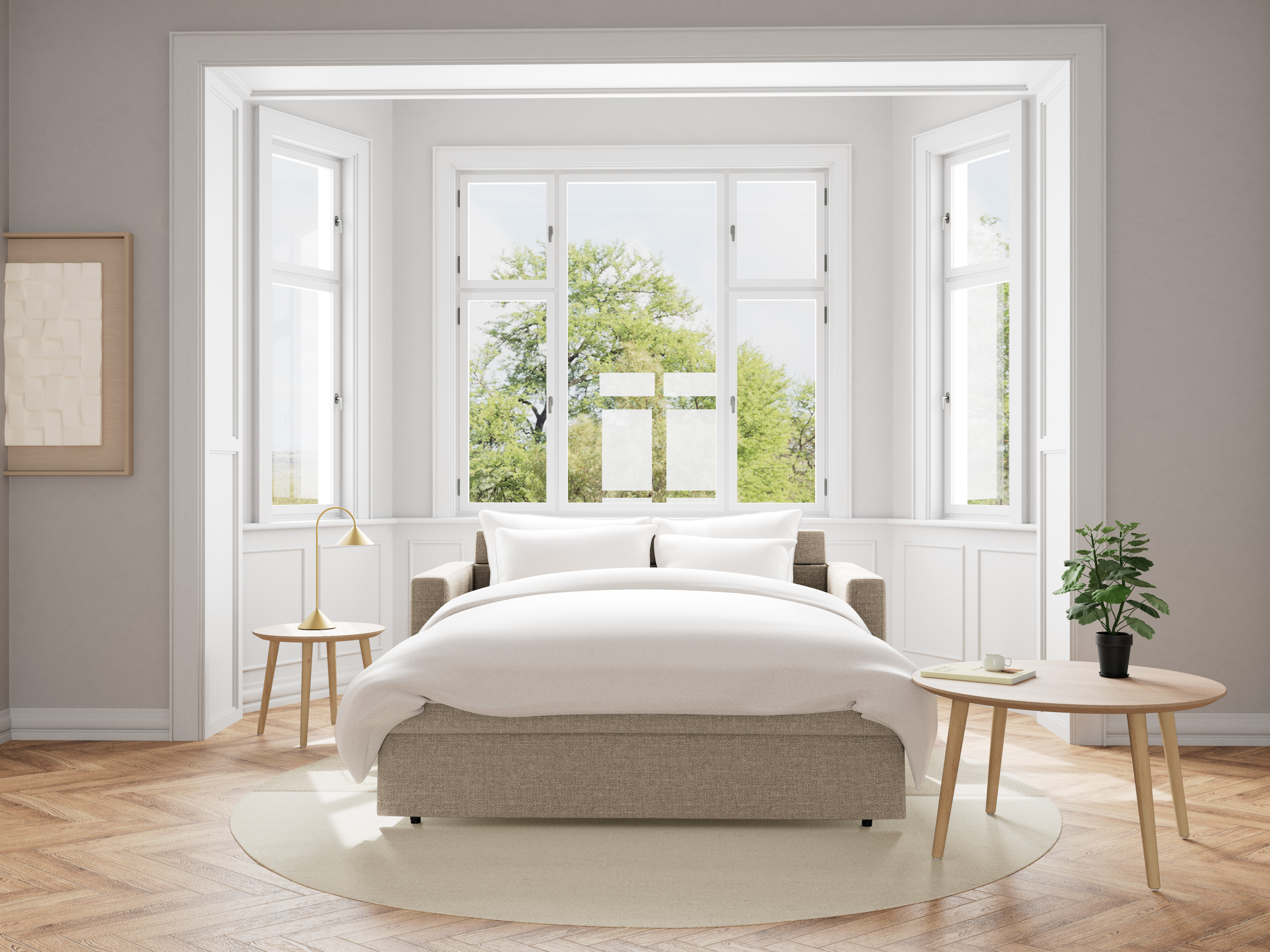 Ce canape-lit confortable dans un beige elegant allie a la perfection confort, fonctionnalite et design moderne.