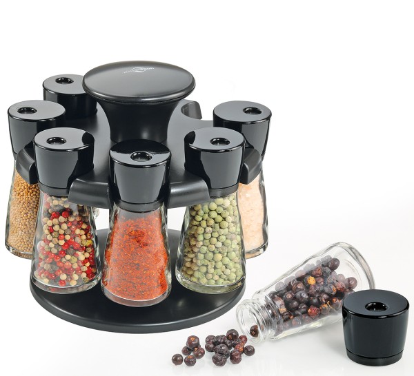 Poivre 5 baies, curry, origan séché, paprika en poudre & Cie … vous feront tourner la tête ! Au total, ce sont huit épices et herbes aromatiques qui trouveront leur place sur le carrousel à épices KÜCHENPROFI. Ils seront bien conservés dans les pots en verre ; les couvercles fermant hermétiquement avec dosage réglable sur 3 positions préserveront durablement les arômes. Et vous aurez ces exhausteurs de goût toujours sous la main en cuisinant. Le carrousel à épices est compact et peu encombrant sur le plan de travail.