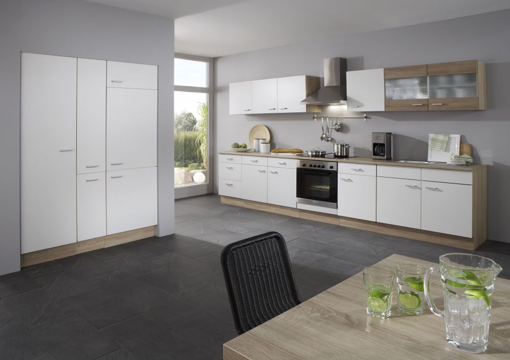 Issu de la jolie cuisine SONEA, voici : un casserolier dans un joli coloris : blanc/imitation chêne Sonoma avec trois tiroirs.
