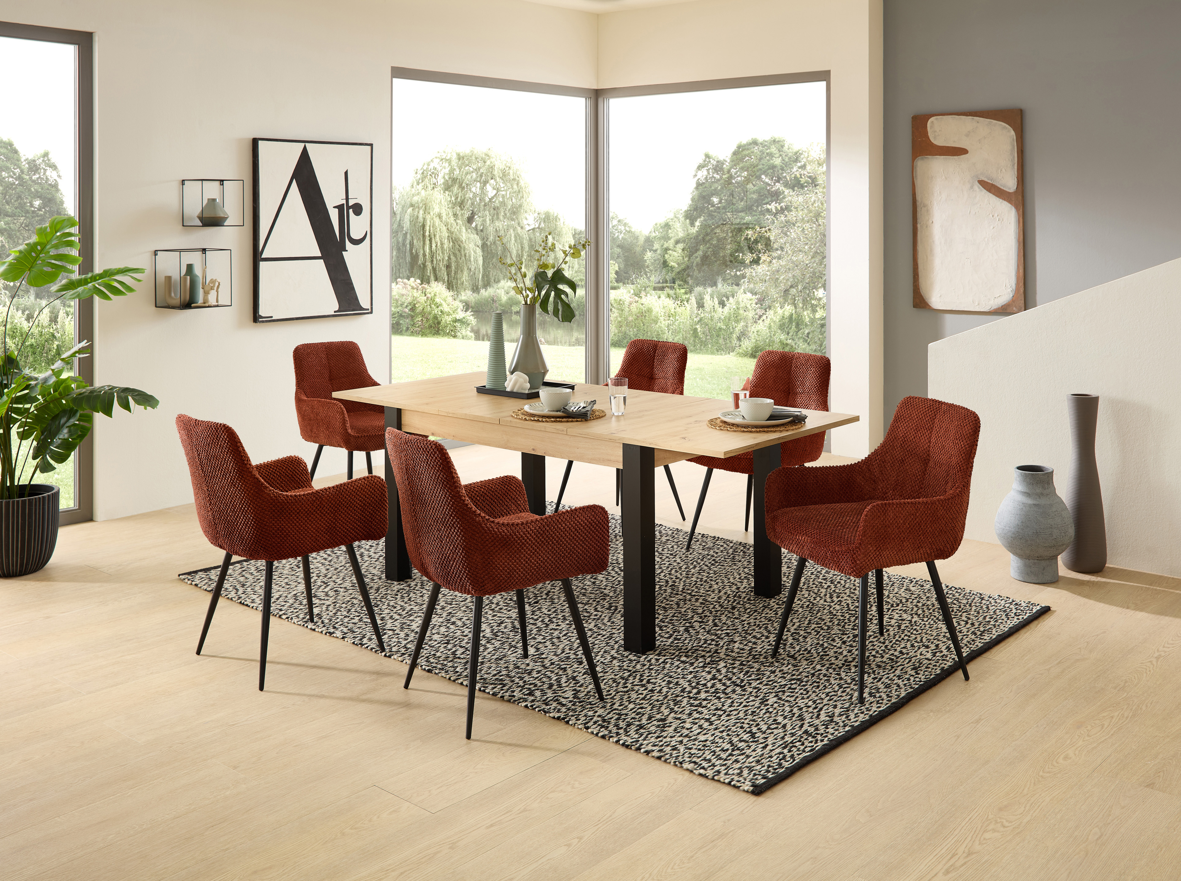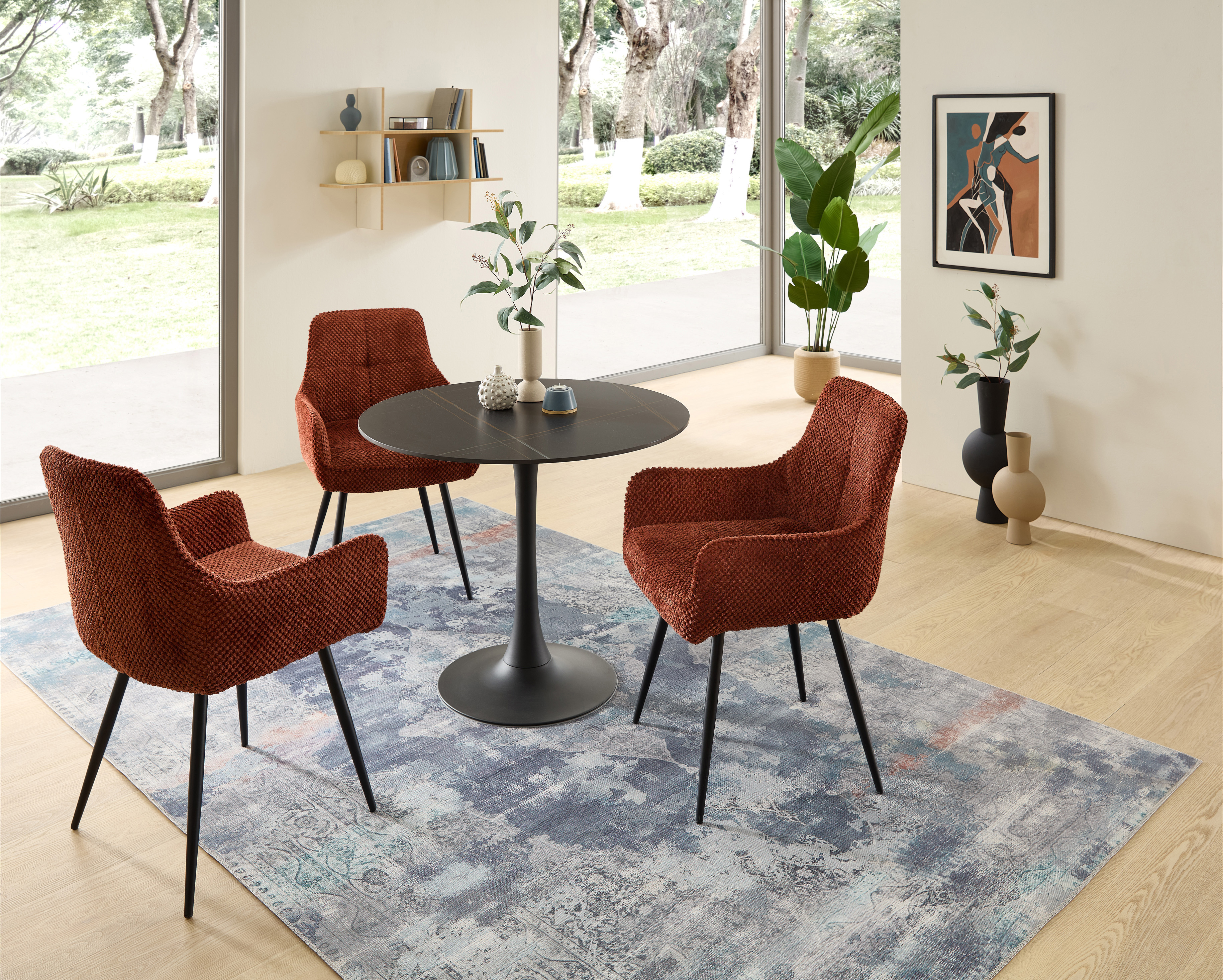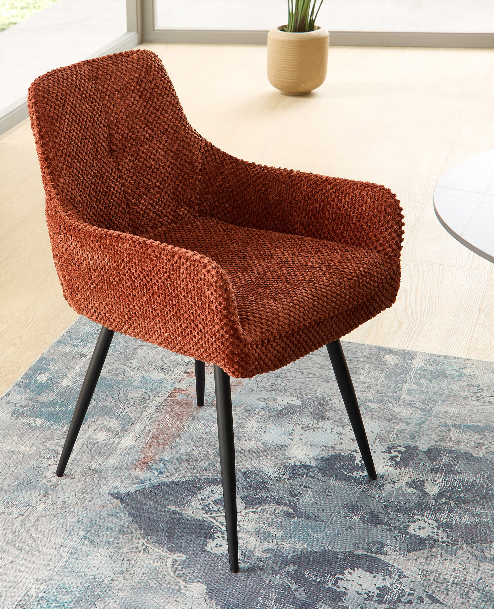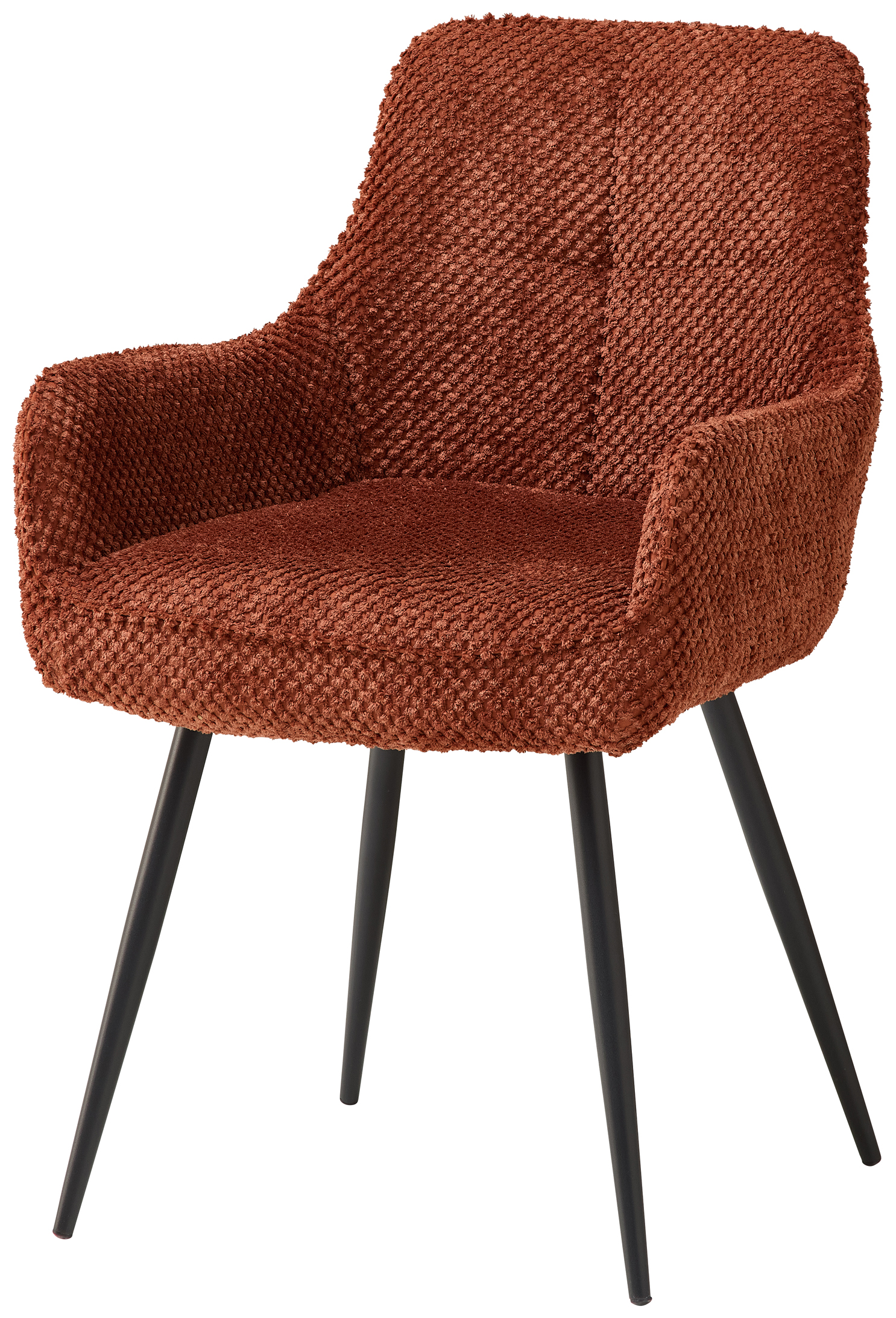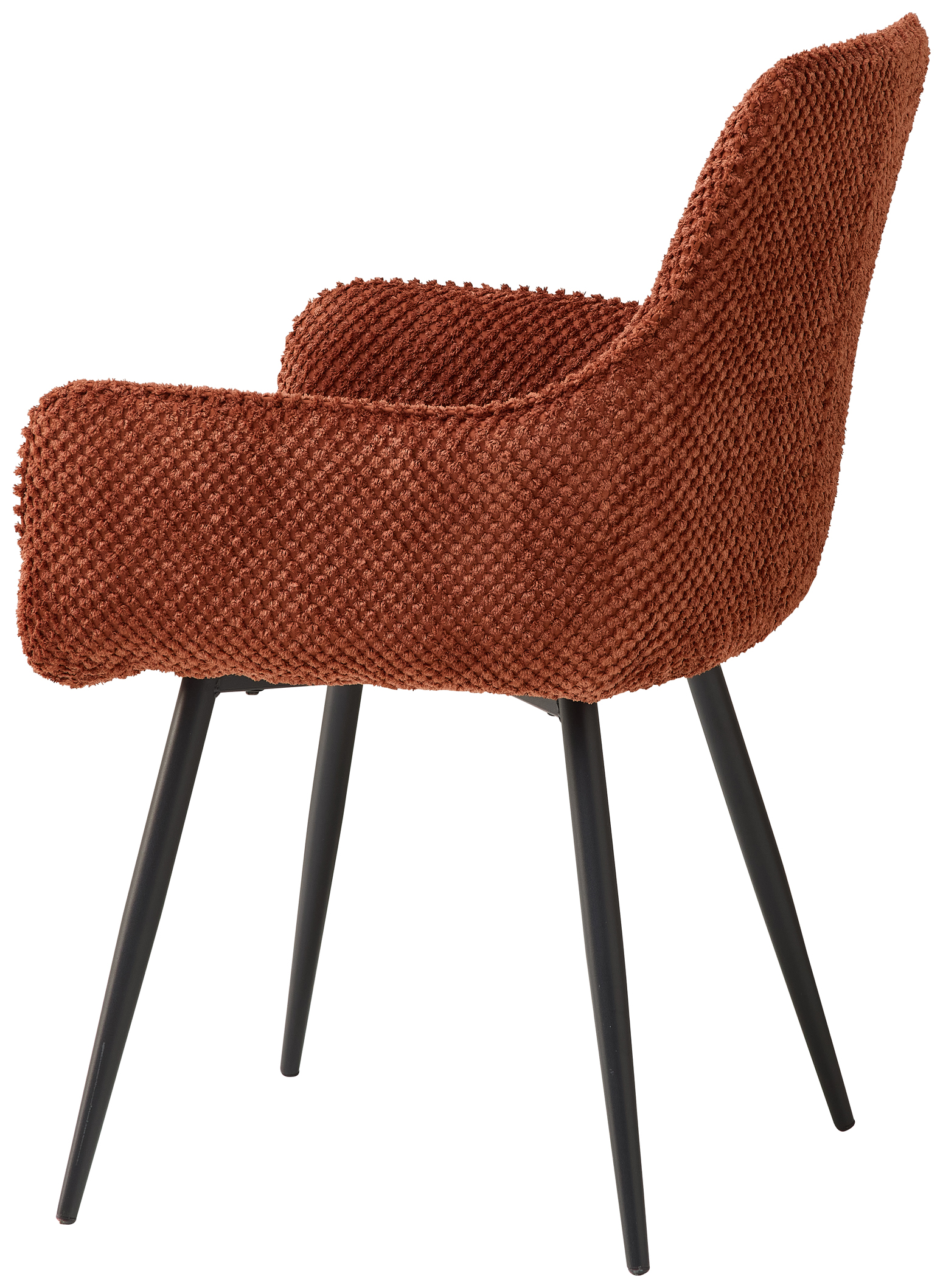 Le rembourrage ergonomique assure un confort durable, même lors de repas ou de conversations prolongés. La structure métallique stable à quatre pieds garantit une assise sûre et une grande longévité, tandis que le revêtement en velours de fibres facile à entretenir offre une agréable sensation au toucher.