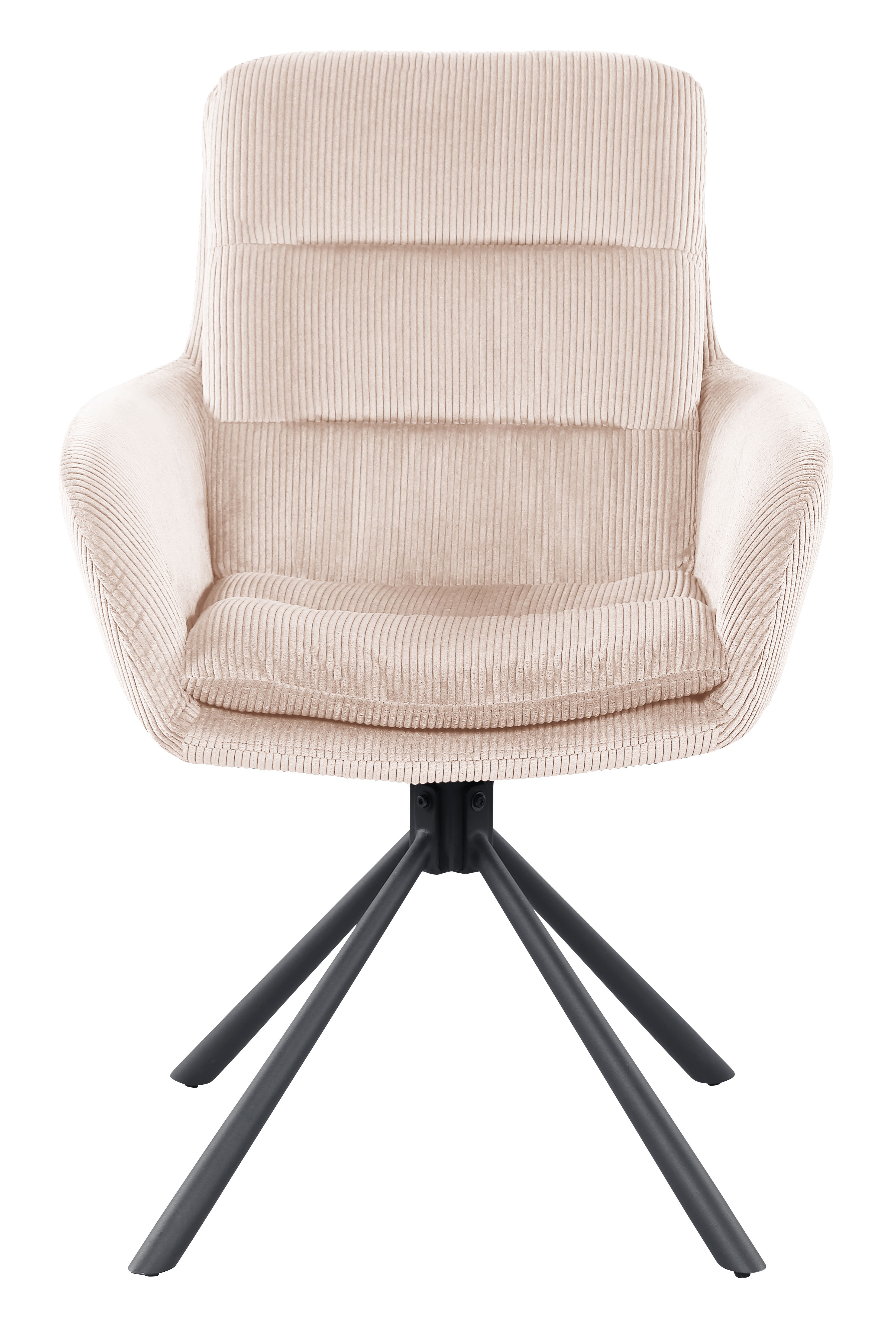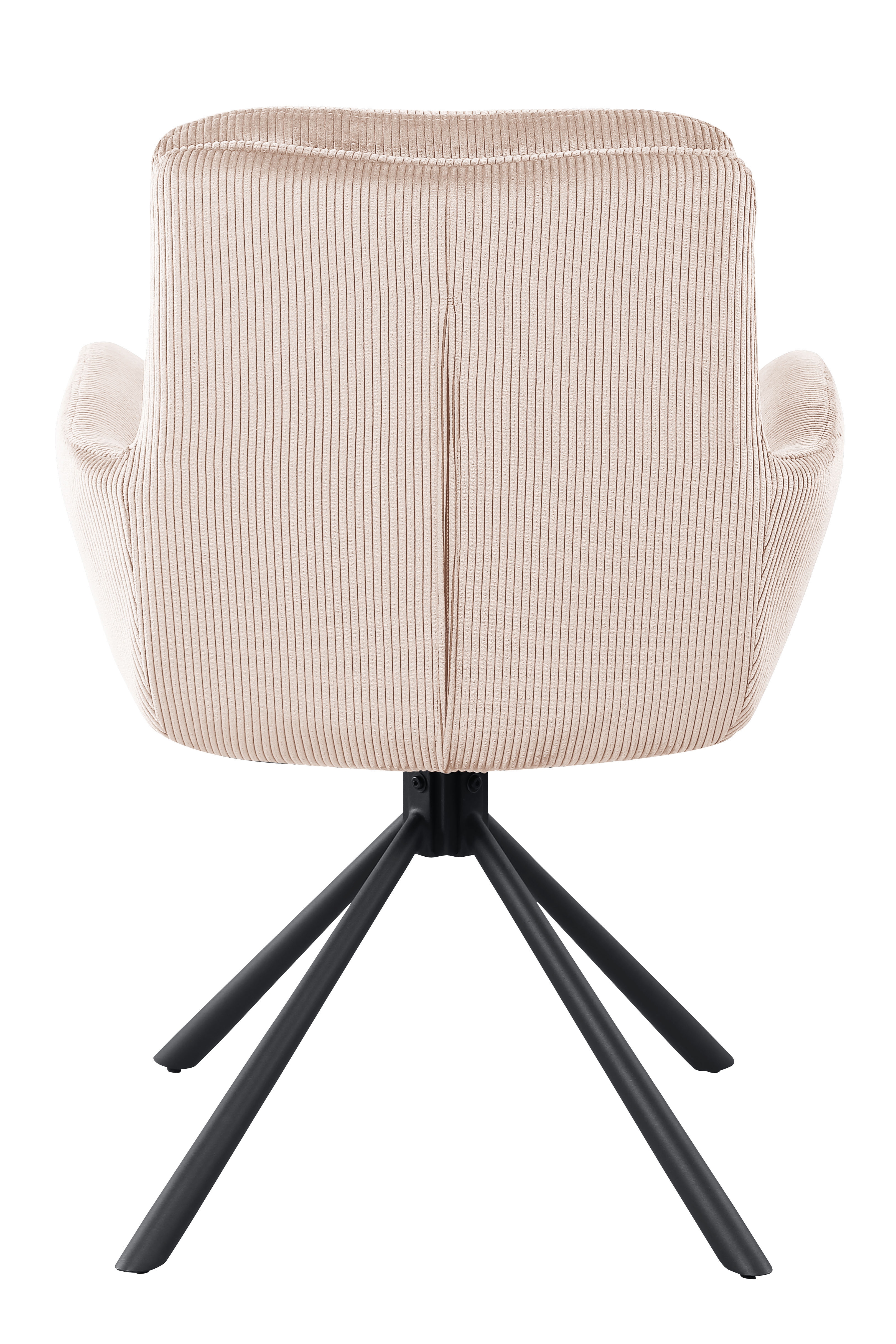 Cette chaise à accoudoirs tendance séduit par son revêtement en tissu aspect velours côtelé de grande qualité. Le piètement quadripode en métal finition époxy avec fonction pivotante à 360° offre une excellente stabilité et un fabuleux contraste avec le revêtement de la chaise. Grâce au rembourrage confortable, vous bénéficierez d'un excellent confort d'assise. Les surpiqûres horizontales du revêtement sont un point fort visuel. Avec son design stylé, cette chaise peut être placée dans un coin repas, une salle d'attente ou même une salle de réunion. Ce meuble attirera également tous les regards en guise de siège solo. Vos invités et vous-même allez adorer votre nouvelle chaise.