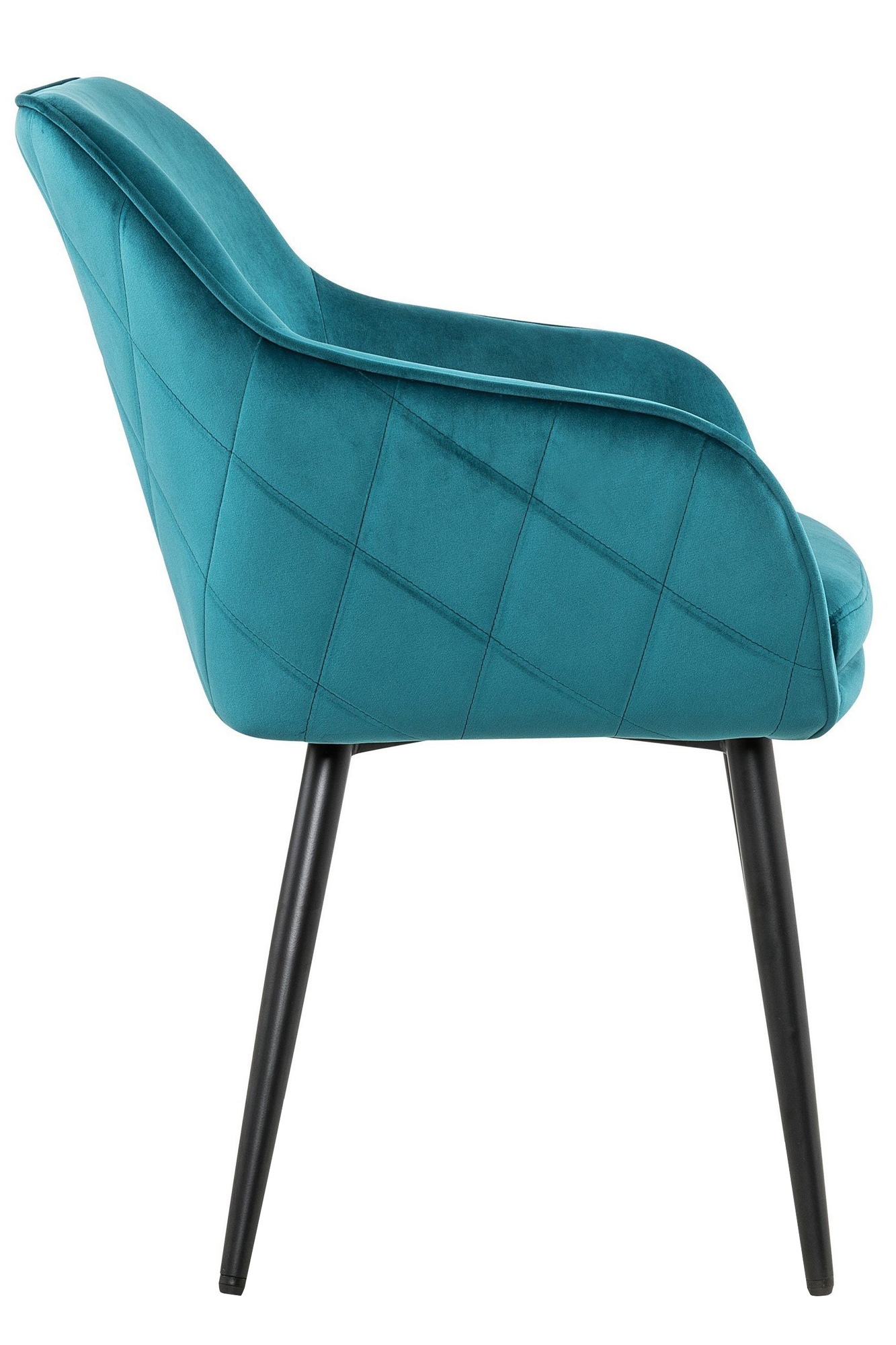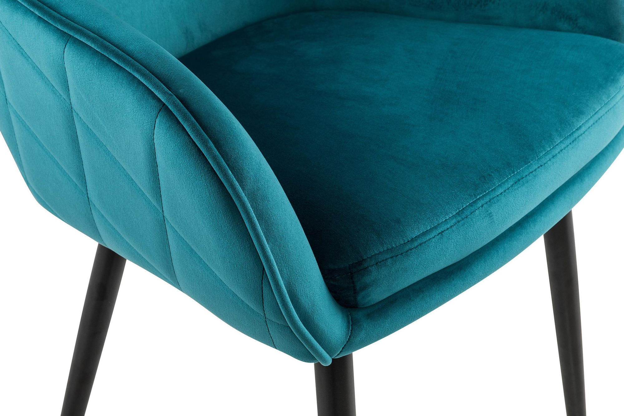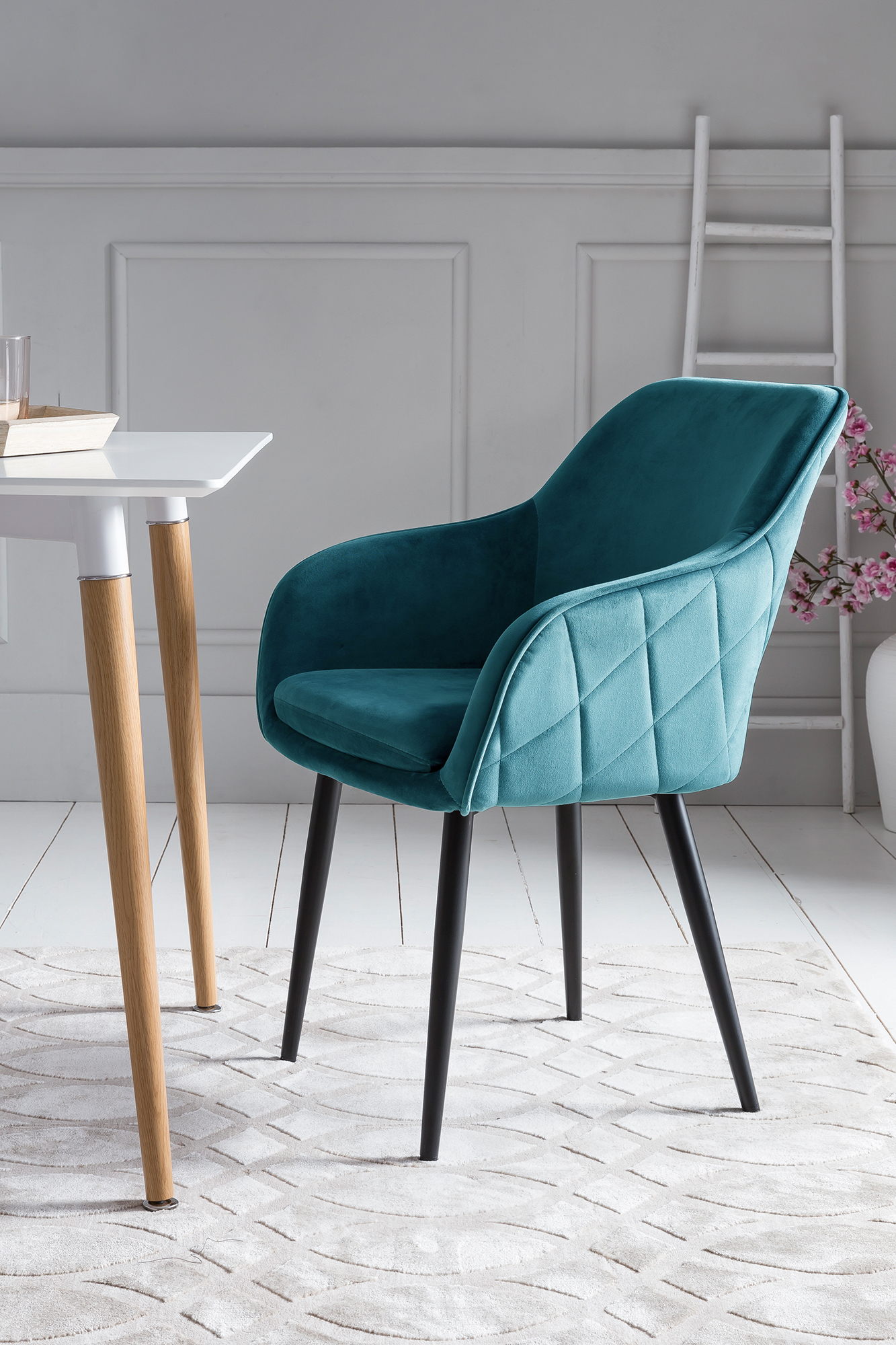 Cette chaise rembourrée tendance séduit par son revêtement en tissu aspect velours et par son rembourrage au niveau de l'assise et du dossier. Les 4 pieds légèrement en biais en métal noir garantissent une excellente stabilité tout en offrant un superbe contraste avec le revêtement de la chaise. Grâce au rembourrage confortable, au dossier et aux accoudoirs, vous bénéficierez d'un confort d'assise haut de gamme. Les surpiqûres en forme de losanges, qui s'étendent sur la partie extérieure de l'assise et du dossier, attirent tous les regards.