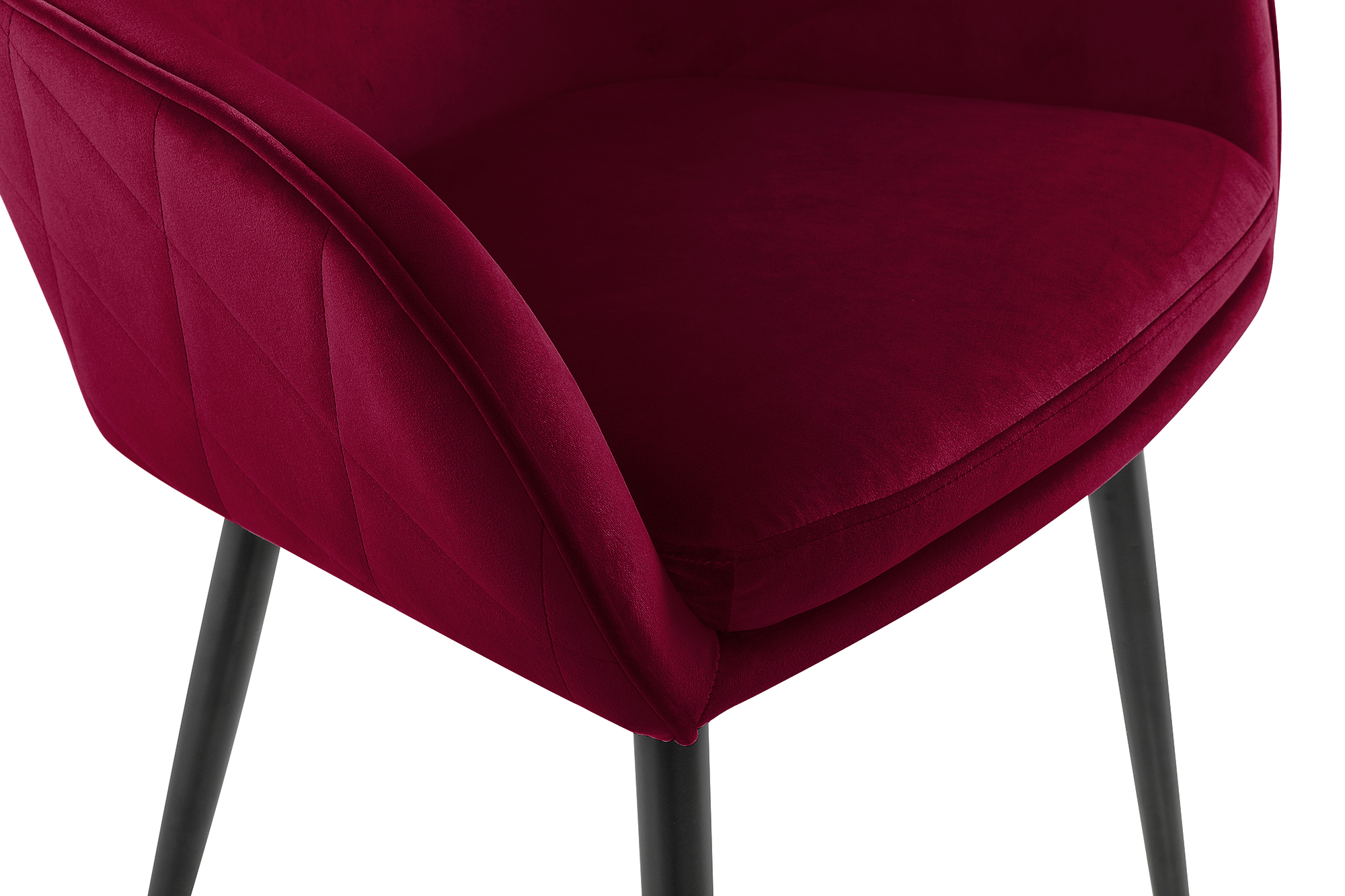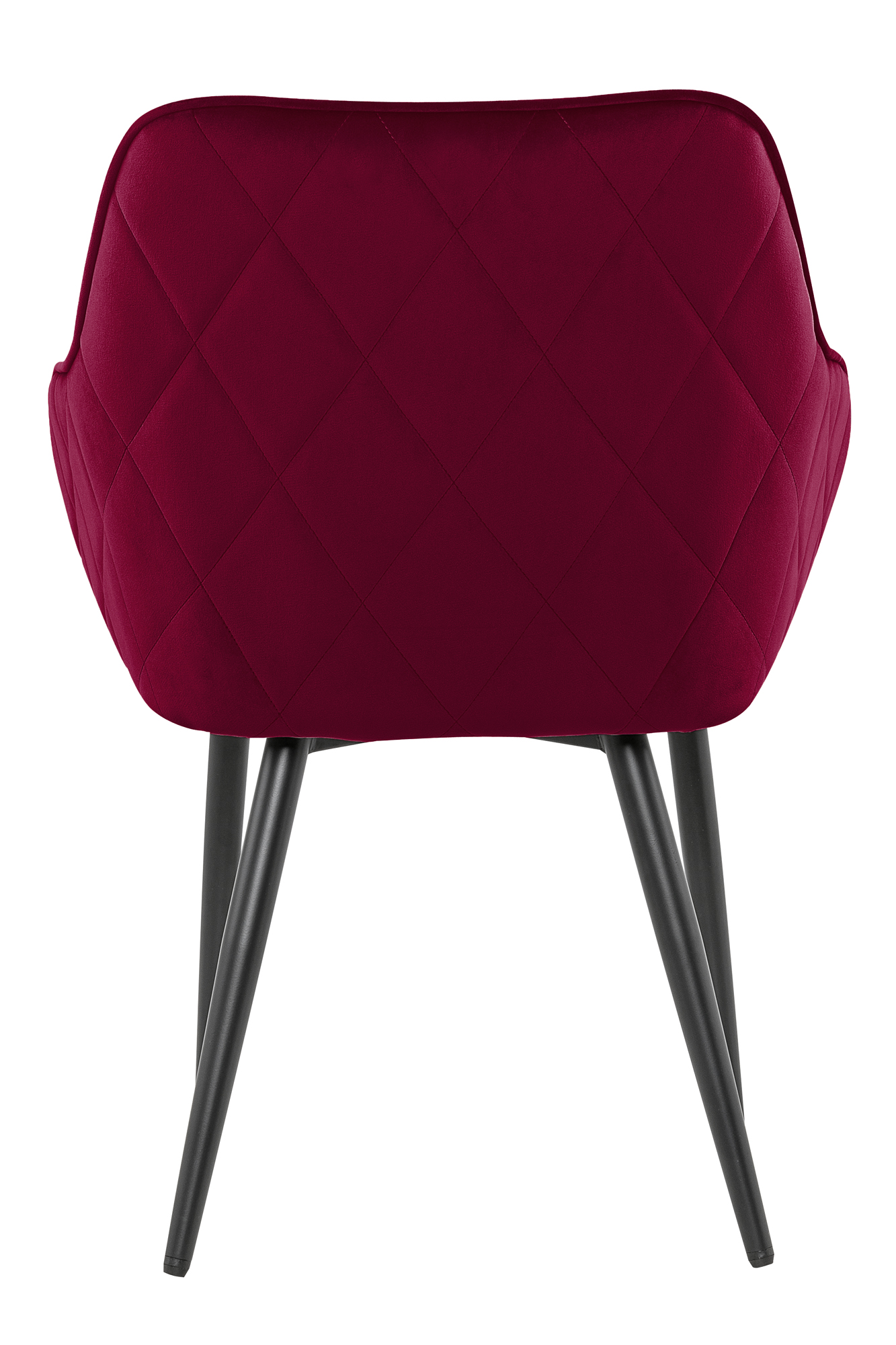 La chaise rembourrée moderne séduit par son revêtement en tissu aspect velours et par son rembourrage au niveau de l'assise et du dossier. Les 4 pieds légèrement en biais en métal noir garantissent une excellente stabilité tout en offrant un superbe contraste avec le revêtement de la chaise. Grâce au rembourrage confortable, au dossier et aux accoudoirs, vous bénéficierez d'un excellent confort d'assise. Les surpiqûres en forme de losanges qui s'étendent sur la partie extérieure de l'assise et du dossier attirent tous les regards.
