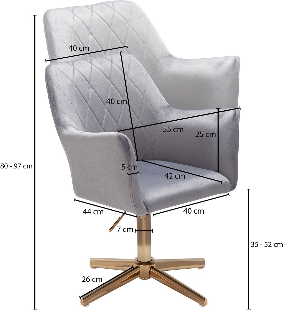 DIMENSIONS ✔ Hauteur : 80 - 97 cm // Largeur : 55 cm // Profondeur : 55 cm // Hauteur d'assise : 35 - 52 cm // Assise (L x P) : 40 x 42 cm // Hauteur des accoudoirs : 25 cm