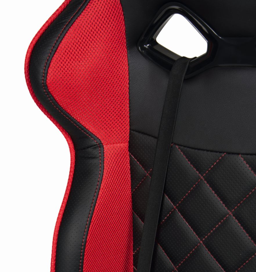 Revêtement : cuir synthétique ton noir 70 % polyuréthane, 25 % polyester et 5 % autres fibres et tissu résille ton rouge 100 % polyester
