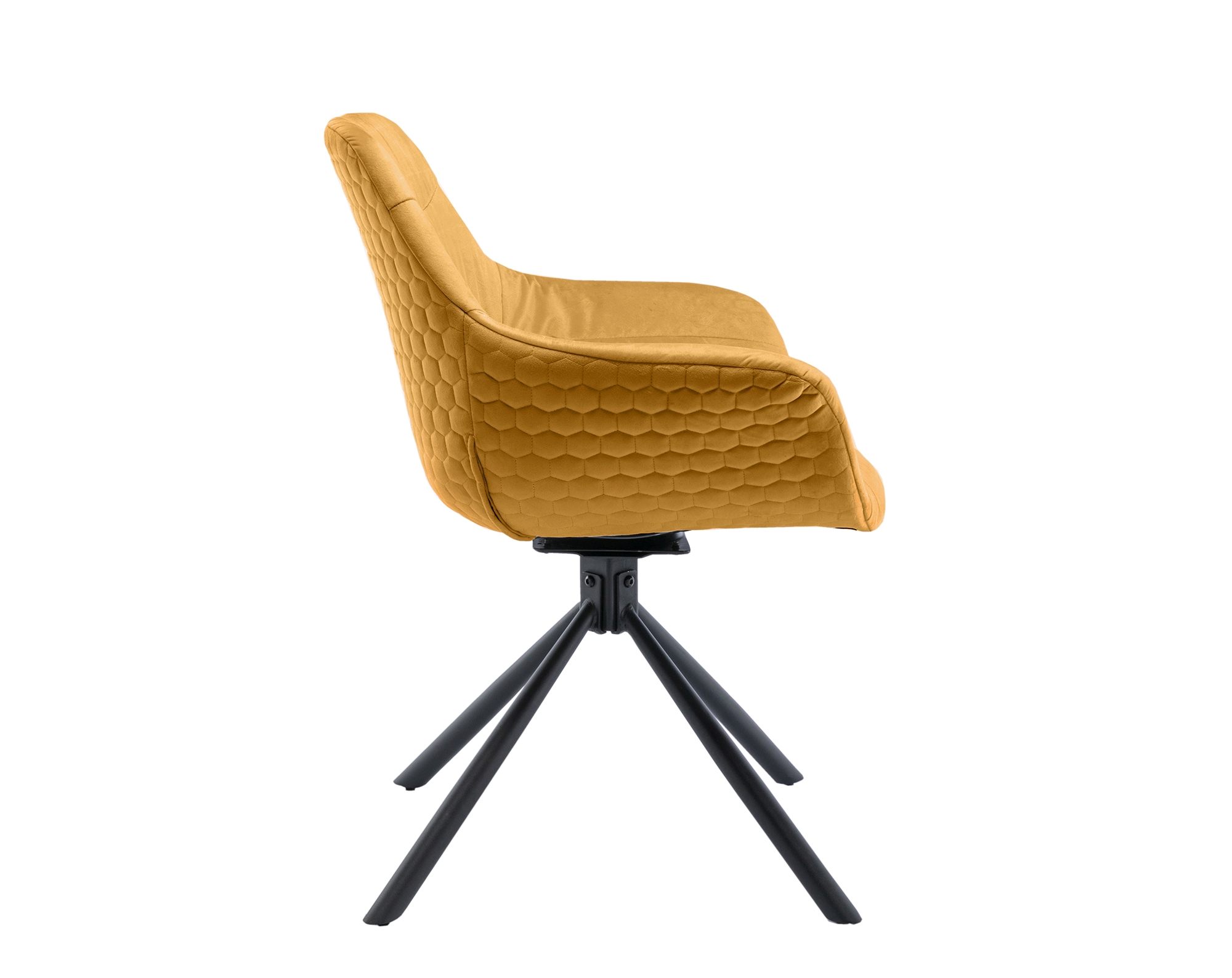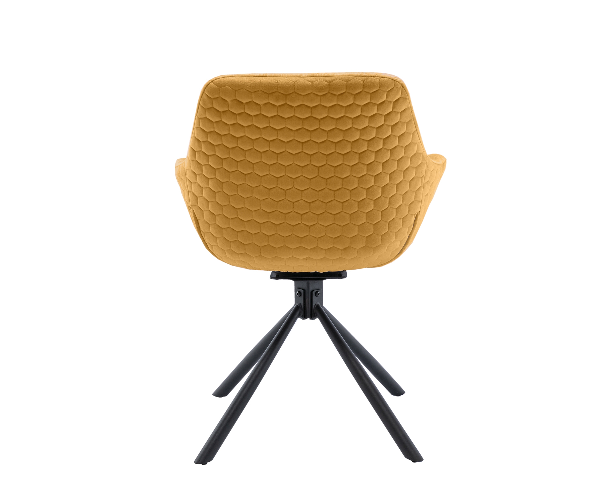 La chaise à accoudoirs tendance séduit par son revêtement en tissu aspect velours et son piètement avec fonction pivotante à 360° en métal finition époxy ton noir. Le piètement garantit une excellente stabilité et s’harmonise parfaitement avec le revêtement de la chaise. Grâce à la coque confortable et aux accoudoirs, vous bénéficierez d'un confort d'assise exceptionnel. Les surpiqûres horizontales au niveau de l'assise et du dossier ainsi que l'aspect nid d’abeilles dans le dos attireront tous les regards dans la pièce. Grâce à sa forme originale, cette chaise rembourrée peut aussi être utilisée comme chaise de réunion. Peu importe où il sera placé, vous allez adorer ce siège confortable… et vos invités aussi vont le plébisciter !