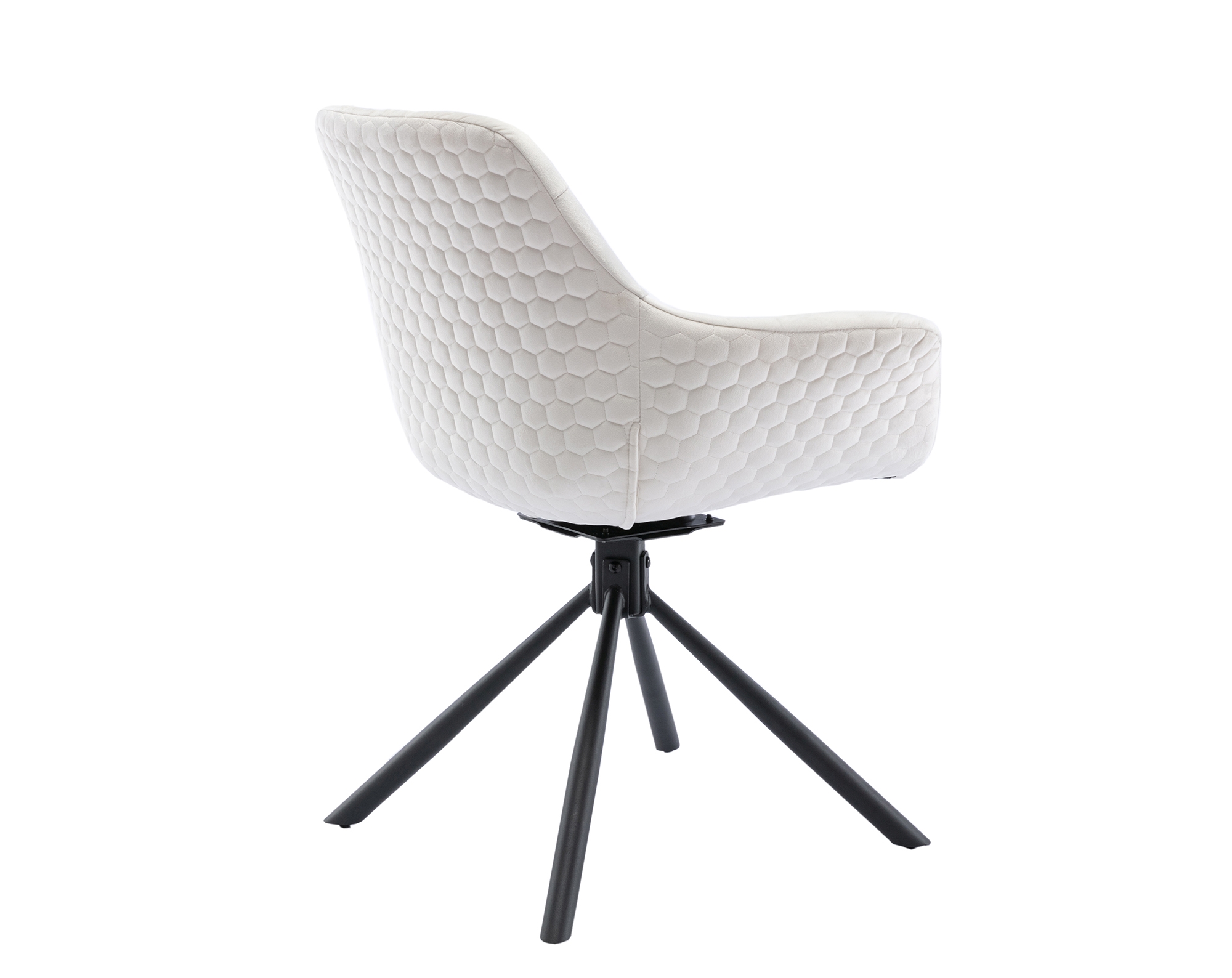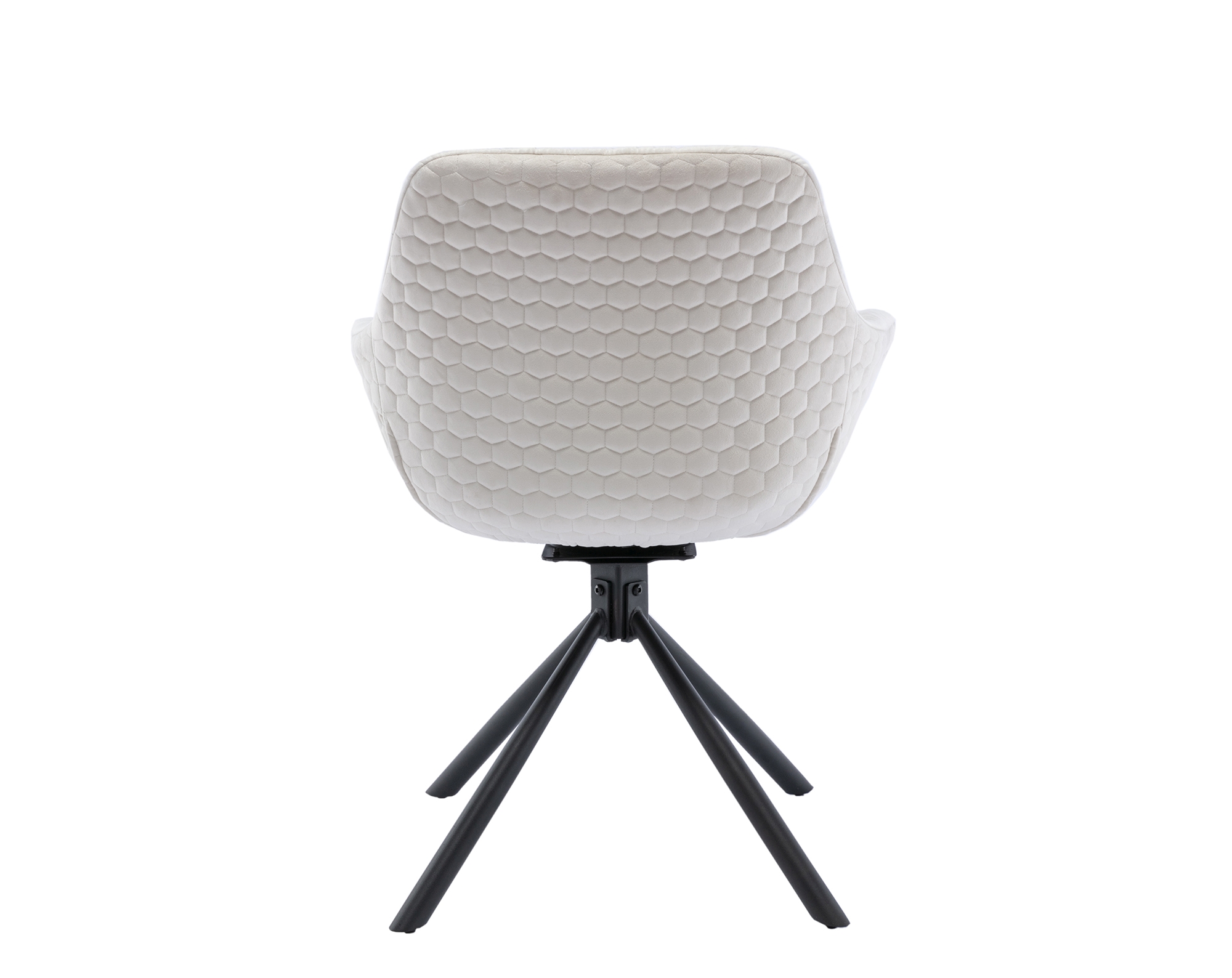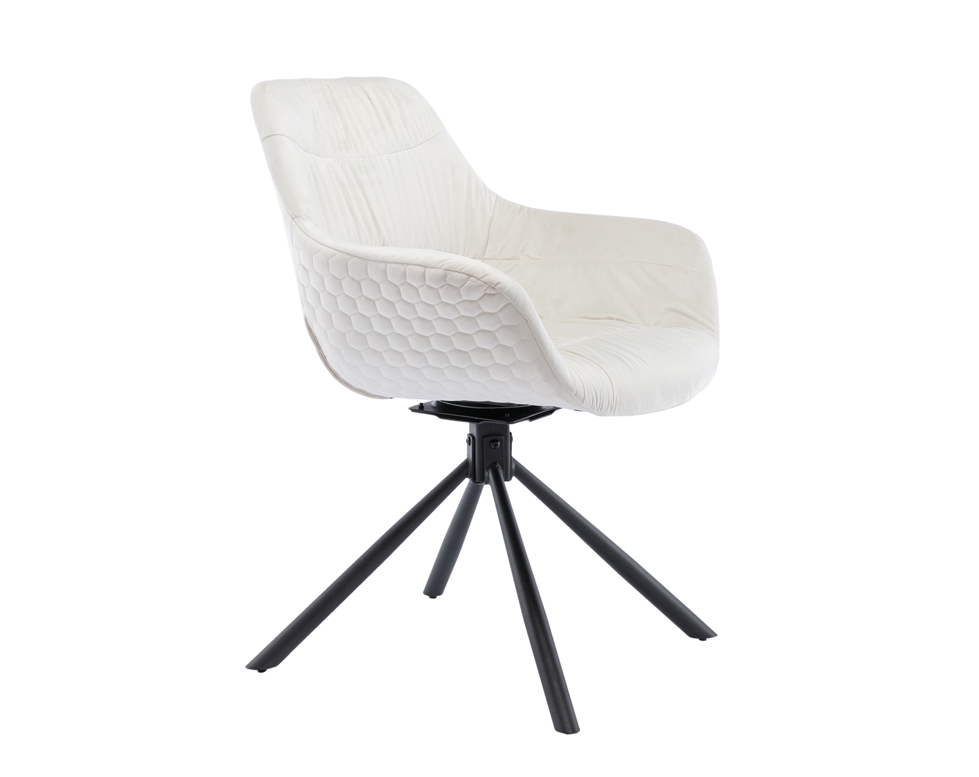 La chaise à accoudoirs tendance séduit par son revêtement en tissu aspect velours et son piètement avec fonction pivotante à 360° en métal finition époxy ton noir. Le piètement garantit une excellente stabilité et s’harmonise parfaitement avec le revêtement de la chaise. Grâce à la coque confortable et aux accoudoirs, vous bénéficierez d'un confort d'assise exceptionnel. Les surpiqûres horizontales au niveau de l'assise et du dossier ainsi que l'aspect nid d’abeilles dans le dos attireront tous les regards dans la pièce. Grâce à sa forme originale, cette chaise rembourrée peut aussi être utilisée comme chaise de réunion. Peu importe où il sera placé, vous allez adorer ce siège confortable… et vos invités aussi vont le plébisciter !