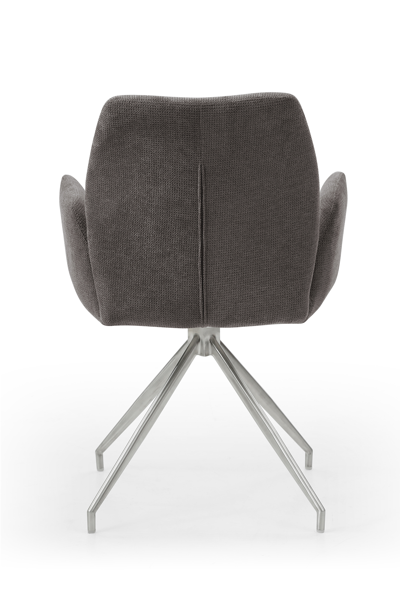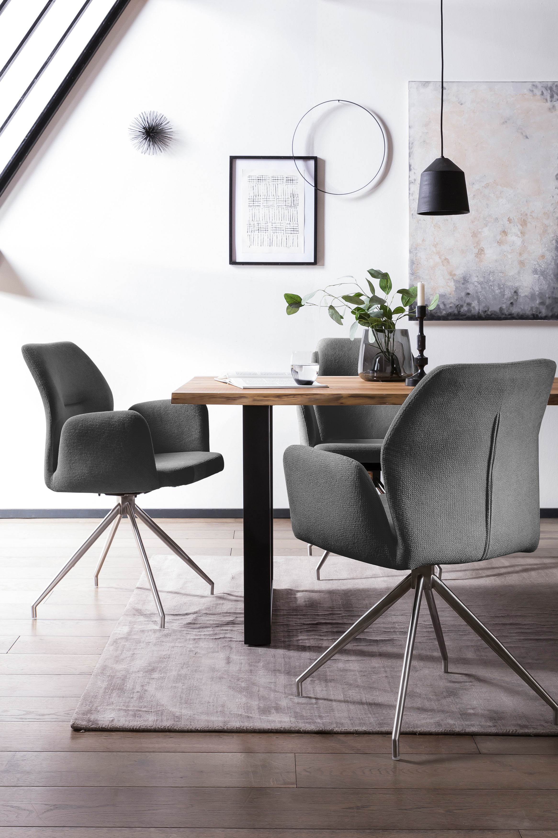 Un modèle qui séduit par son aspect tendance et l'excellente qualité des finitions : grâce à son design moderne, la chaise à accoudoirs pivotante à 180° s'intégrera facilement dans votre intérieur. Elle peut en effet s'utiliser de façon polyvalente comme chaise de salle à manger, pour la coiffeuse ou le télétravail. la chaise rembourrée séduit par ses formes tendance avec un dossier de forme ergonomique pourvue d'une couture décorative, une assise droite et des accoudoirs légèrement évasés. Elle dispose à chaque endroit d'un garnissage agréable pour un confort d'assise accrue. Le siège est revêtu d'un élégant tissu texturé robuste proposé dans de nombreux coloris unis au choix. Un autre point fort est le piètement design fin en acier inoxydable. Grâce au mécanisme pivotant intégré, le fauteuil permet une assise dynamique.