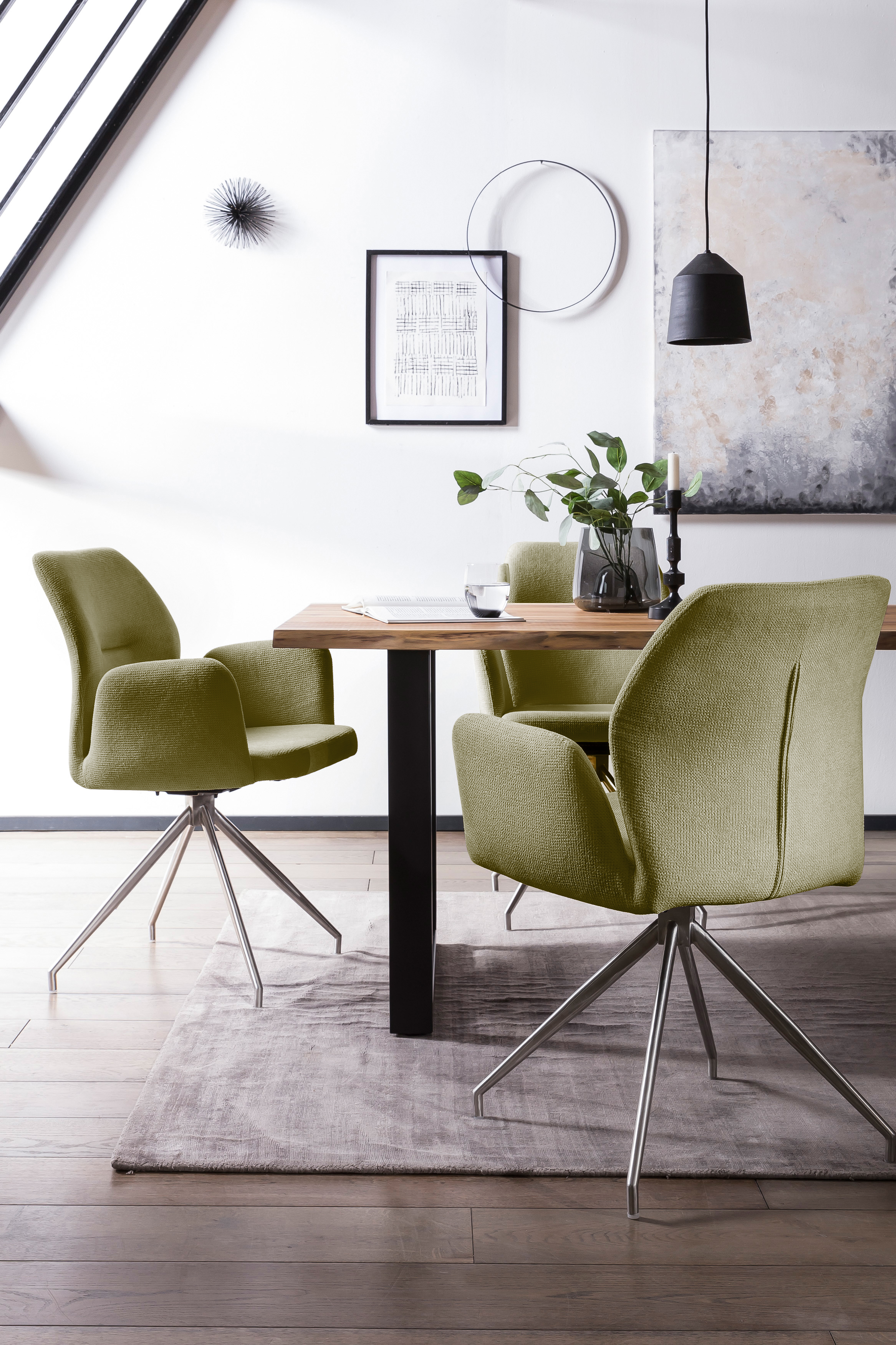 Un modèle qui séduit par son aspect tendance et l'excellente qualité des finitions : grâce à son design moderne, la chaise à accoudoirs pivotante à 180° s'intégrera facilement dans votre intérieur. Elle peut en effet s'utiliser de façon polyvalente comme chaise de salle à manger, pour la coiffeuse ou le télétravail. la chaise rembourrée séduit par ses formes tendance avec un dossier de forme ergonomique pourvue d'une couture décorative, une assise droite et des accoudoirs légèrement évasés. Elle dispose à chaque endroit d'un garnissage agréable pour un confort d'assise accrue. Le siège est revêtu d'un élégant tissu texturé robuste proposé dans de nombreux coloris unis au choix. Un autre point fort est le piètement design fin en acier inoxydable. Grâce au mécanisme pivotant intégré, le fauteuil permet une assise dynamique.