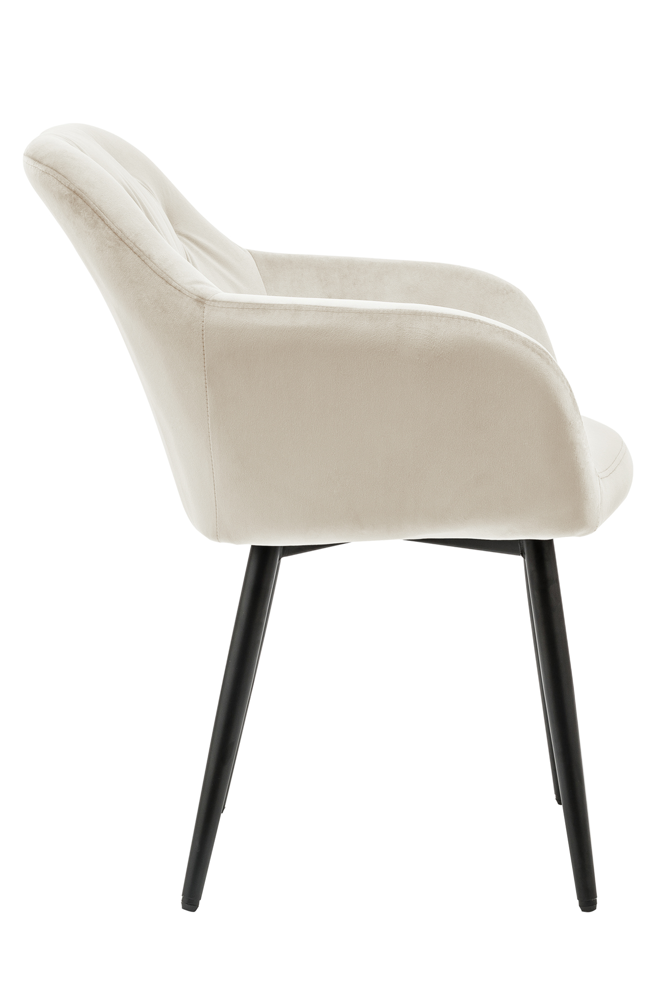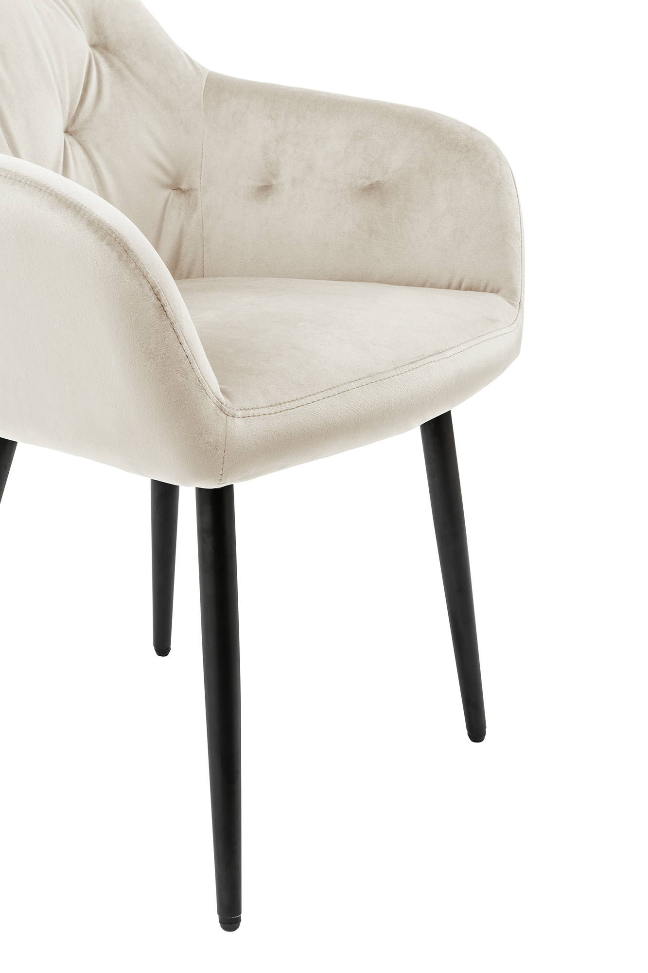 La chaise rembourrée moderne séduit par son revêtement en tissu aspect velours et par son rembourrage au niveau de l'assise et du dossier. Les 4 pieds en métal finition époxy ton noir garantissent une excellente stabilité tout en offrant un superbe contraste avec le revêtement de la chaise. Grâce au rembourrage confortable, au dossier et aux accoudoirs, vous bénéficierez d'un excellent confort d'assise. Le point fort visuel est le capitonnage qui s'étend sur la partie intérieure du dossier et des accoudoirs et qui contribue à une image d'ensemble harmonieuse.