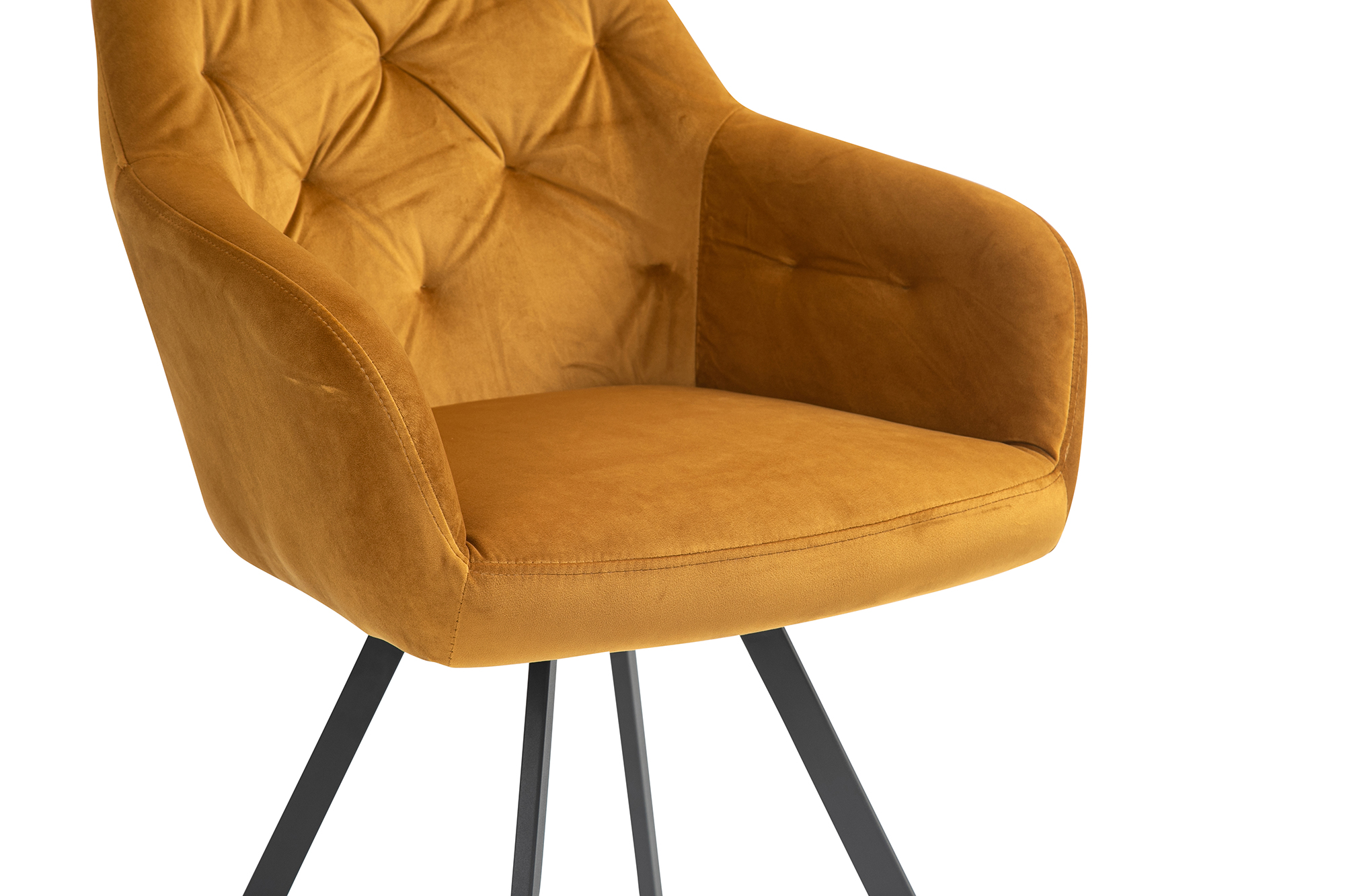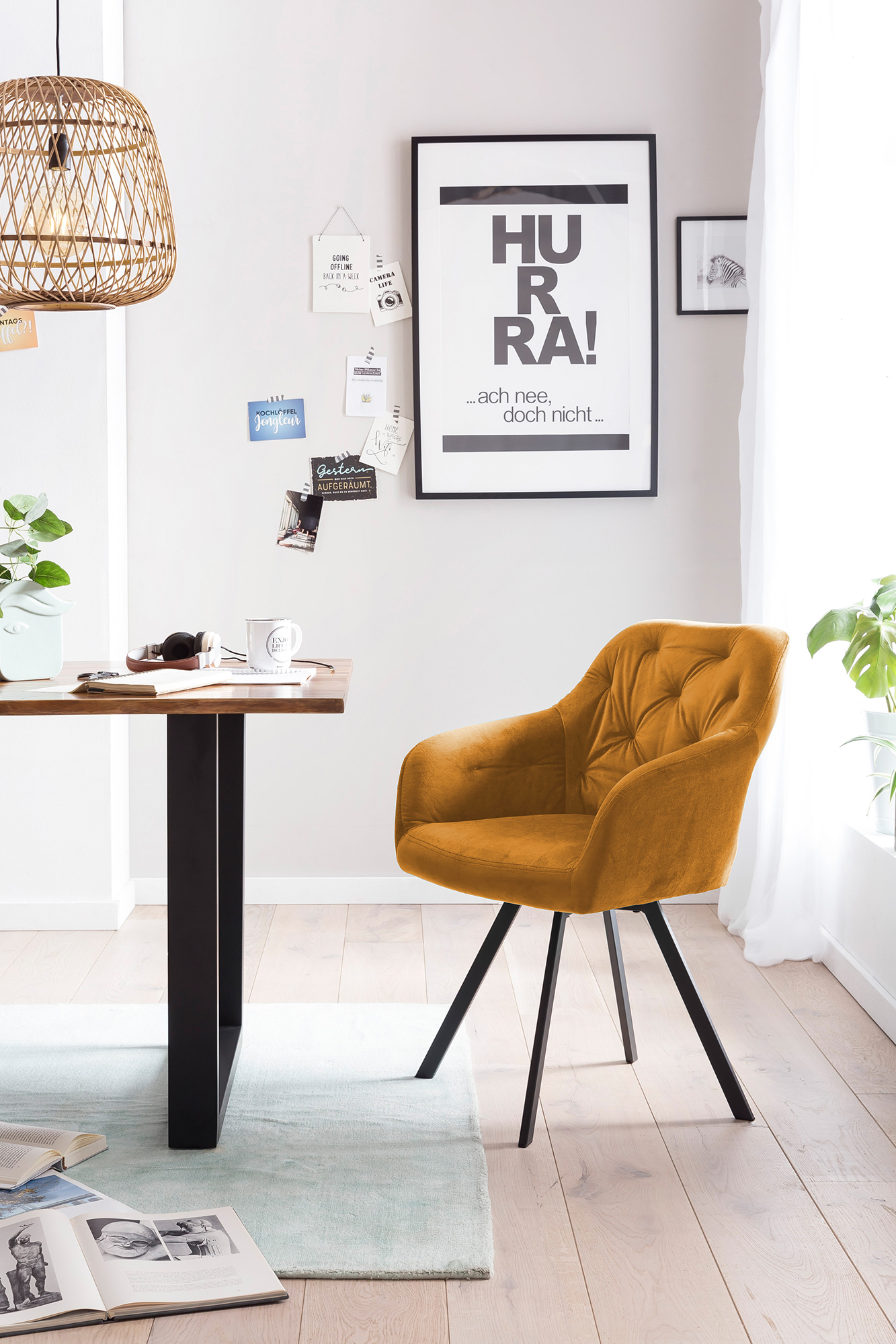 Pour un intérieur chic – Cette chaise à accoudoirs glamour aspect velours attirera tous les regards dans votre salle à manger. Le rembourrage généreux de l'assise et des accoudoirs garantit un confort optimal tandis que le dossier capitonné et le piètement robuste, composé de quatre pieds en biais façon tripode en métal finition époxy ton noir, apportent la touche finale pour un look exclusif. Cerise sur le gâteau : la fonction pivotante à 360° offrant confort et liberté de mouvement. La chaise ne sera pas seulement la solution optimale pour votre table de repas : elle sera également du plus bel effet près du bureau ou de la coiffeuse. Afin d'intégrer harmonieusement la chaise dans différents styles d'intérieur, elle est proposée dans divers coloris.