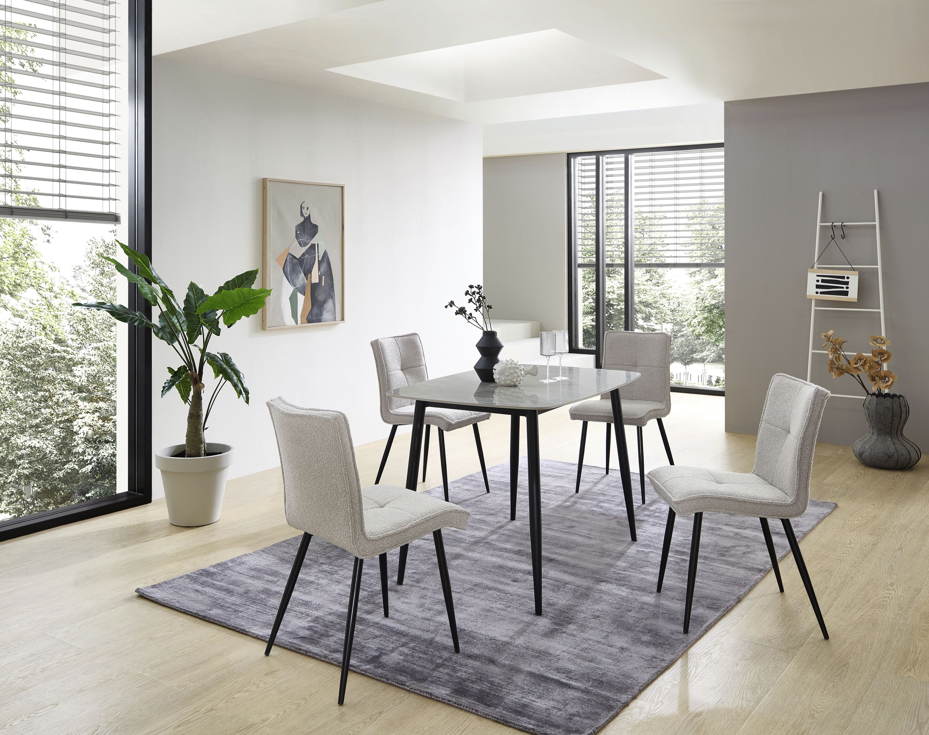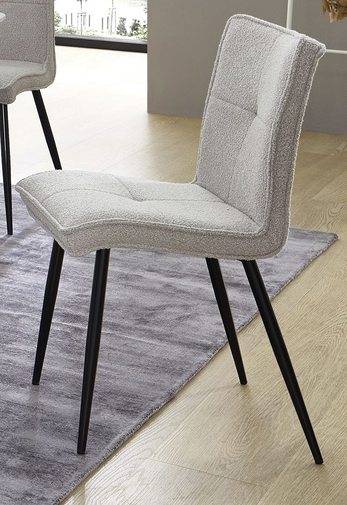 Cette chaise recouverte de tissu bouclé gris clair allie un look moderne à un confort d'assise pratique – idéale pour la salle à manger, la cuisine ou les espaces de réunion. Le revêtement 100 % polyester séduit par son toucher agréablement doux et sa grande résistance. Le matelassage décoratif du dossier et de l'assise lui confère un aspect attrayant. Le piètement en métal noir mat offre une grande stabilité et complète le design contemporain. Avec un poids d'environ 5 kg, cette chaise est facile à manipuler et polyvalente. Un siège fonctionnel à un prix raisonnable, adapté à un usage quotidien dans différentes pièces de la maison.