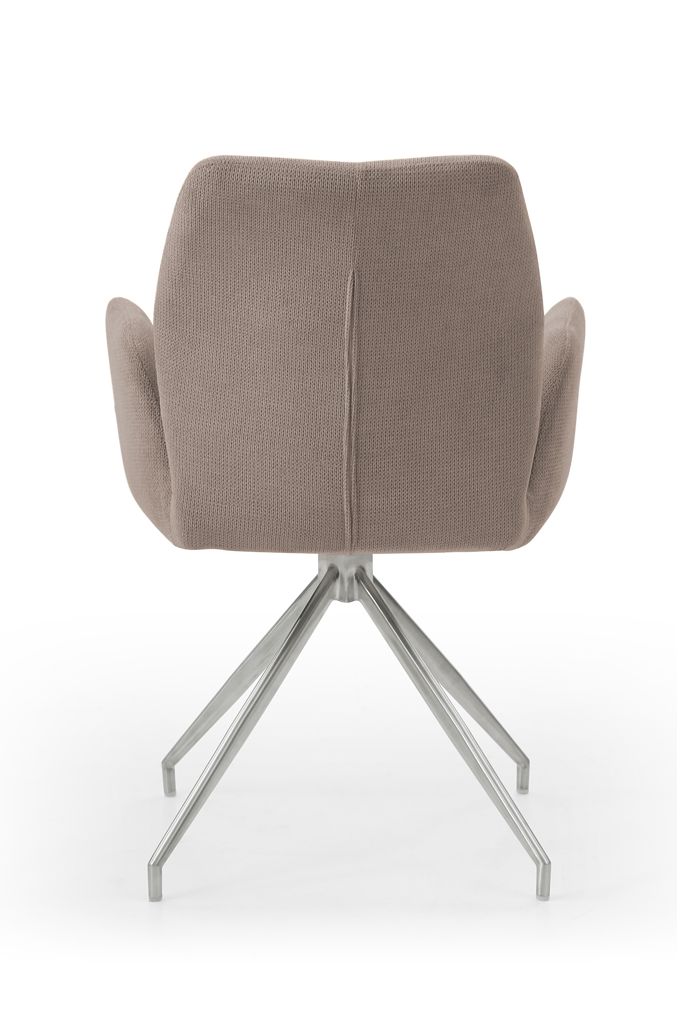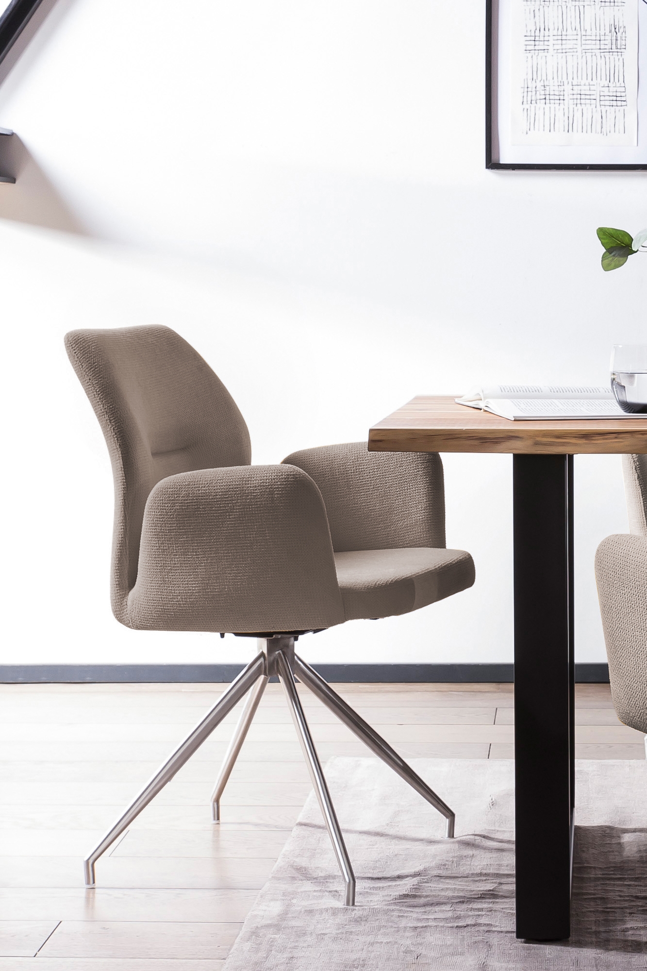 Un modèle qui séduit par son aspect tendance et l'excellente qualité des finitions : grâce à son design moderne, la chaise à accoudoirs pivotante à 180° s'intégrera facilement dans votre intérieur. Elle peut en effet s'utiliser de façon polyvalente comme chaise de salle à manger, pour la coiffeuse ou le télétravail. La chaise rembourrée séduit par ses formes tendance avec un dossier ergonomique pourvu d'une couture décorative, une assise droite et des accoudoirs légèrement évasés. Elle dispose d'un garnissage agréable pour un confort d'assise accru. Le siège est revêtu d'un élégant tissu texturé robuste proposé dans de nombreux coloris unis au choix. Un autre point fort est le piètement au design tout en finesse en acier inoxydable. Grâce au mécanisme pivotant intégré, le fauteuil permet une assise dynamique.