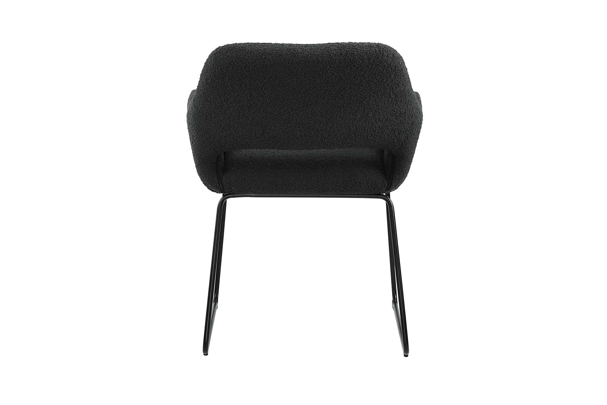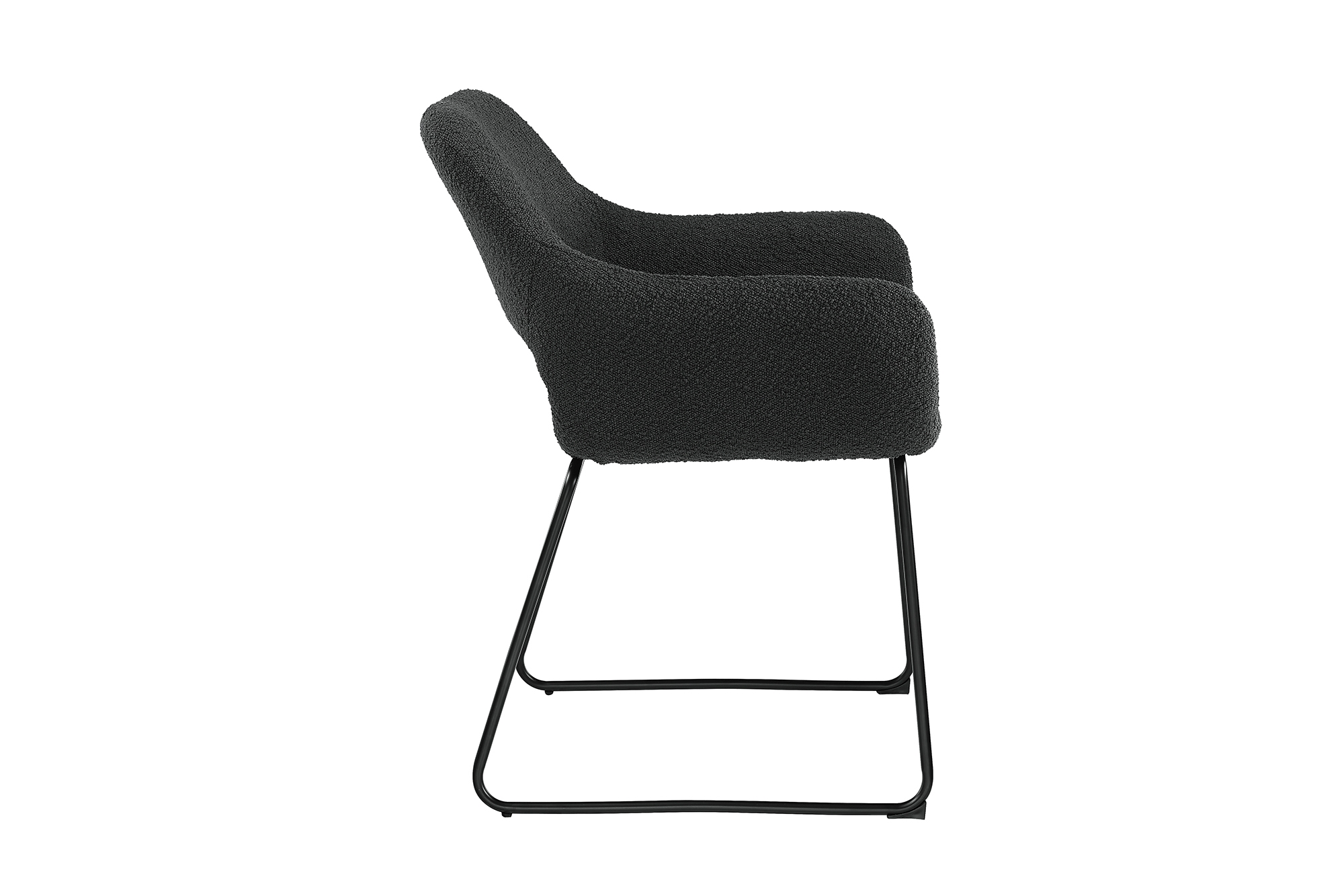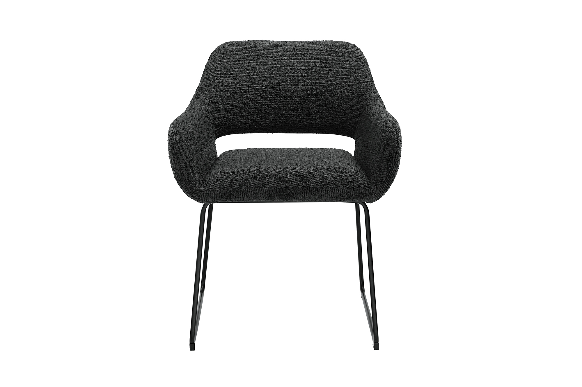 Avec cette chaise à accoudoirs au dossier original ajouré, vous ferez entrer dans votre intérieur un compagnon design et tendance ultra confortable. Le revêtement en tissu bouclette à la texture épaisse est vraiment d’actualité : il n’est pas seulement confortable mais marque également des points par sa robustesse. Les accoudoirs hauts rembourrés apportent la touche finale au confort d’assise de cette chaise. Le piètement traîneau en métal finition époxy ton noir mat souligne son look tendance. Utilisée comme chaise de salle à manger, pour la coiffeuse ou le coin lecture : cette chaise à accoudoirs en tissu bouclette sera du plus bel effet à beaucoup d’endroits