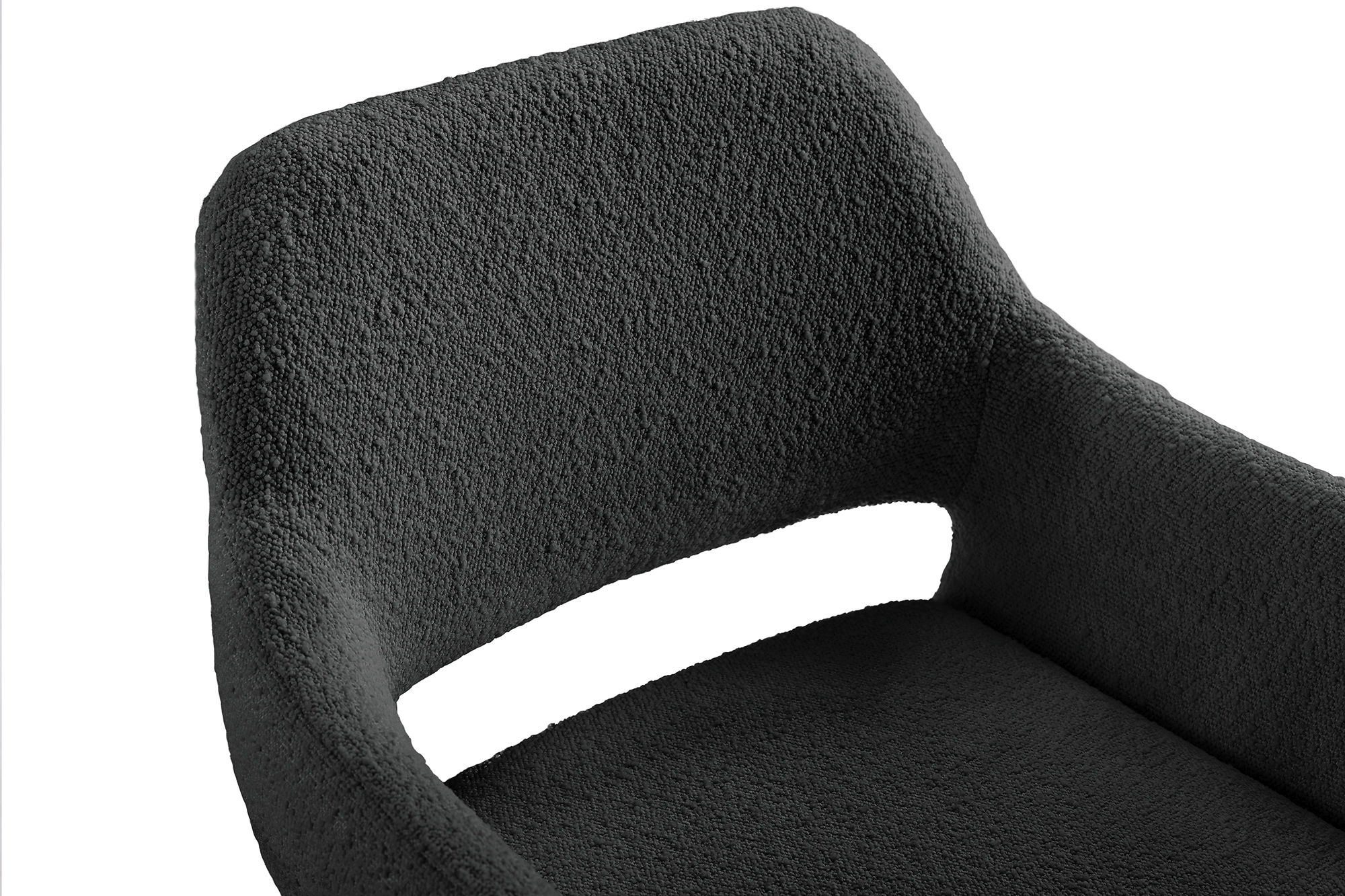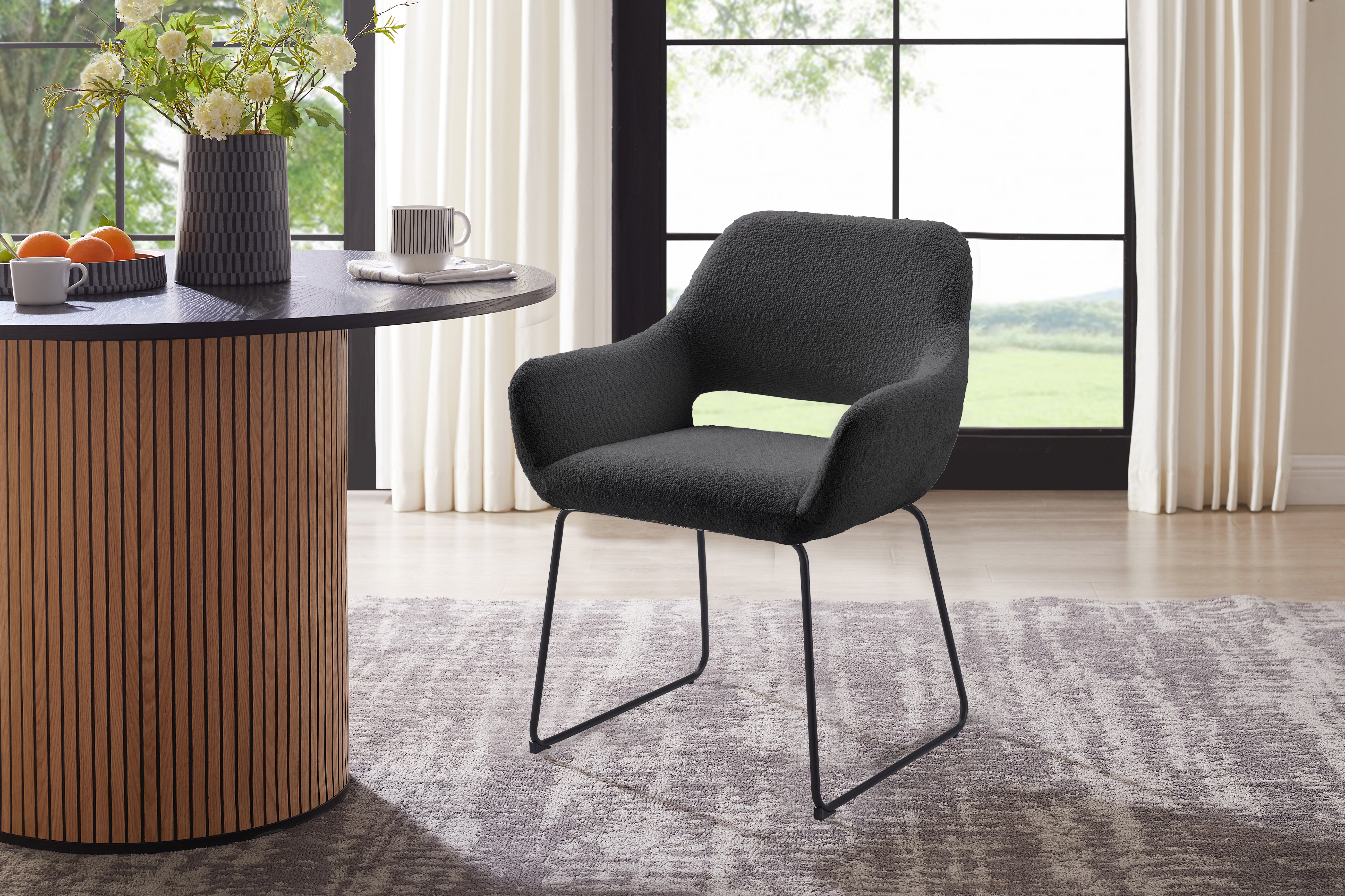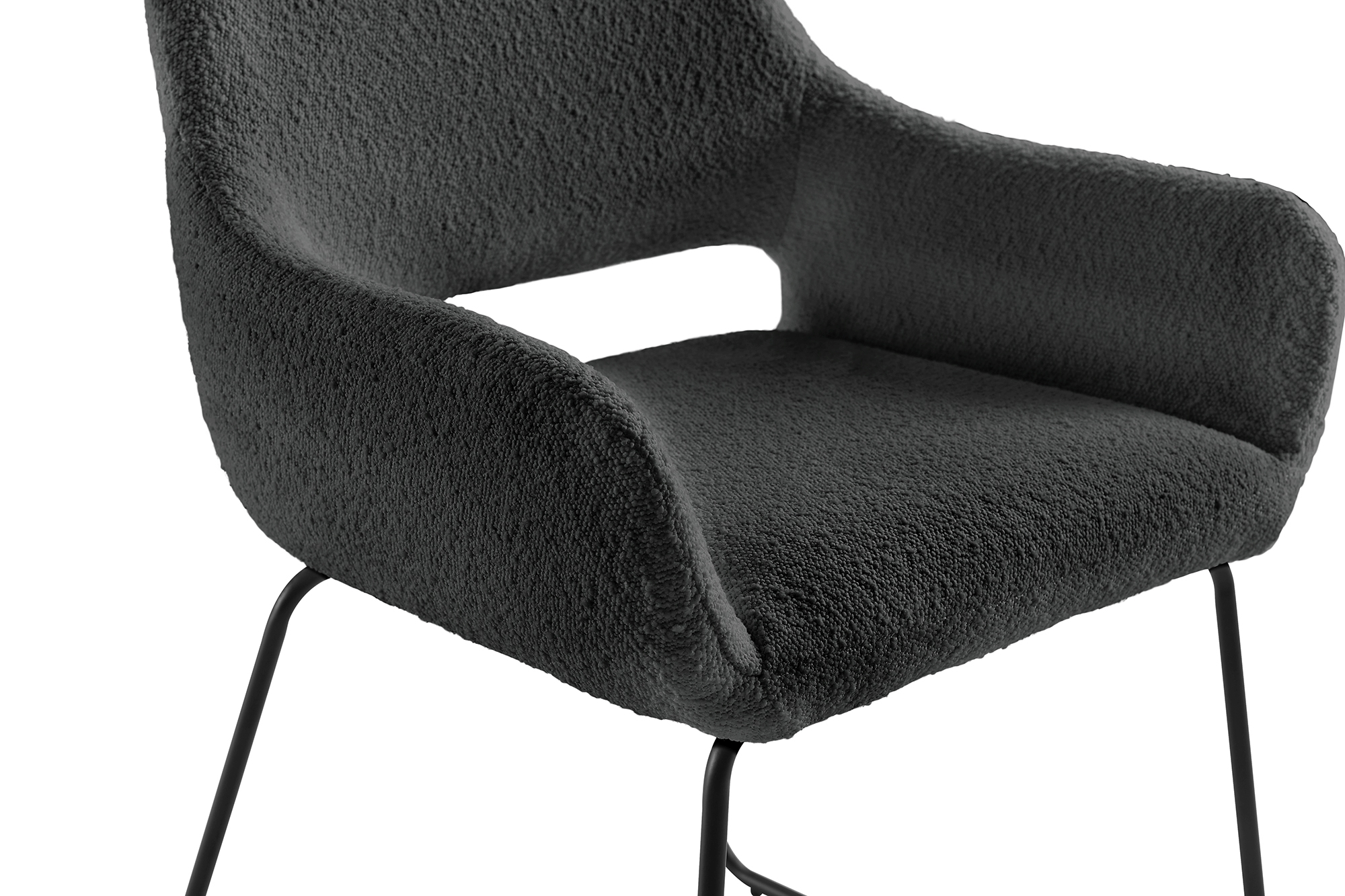 Avec cette chaise à accoudoirs au dossier original ajouré, vous ferez entrer dans votre intérieur un compagnon design et tendance ultra confortable. Le revêtement en tissu bouclette à la texture épaisse est vraiment d’actualité : il n’est pas seulement confortable mais marque également des points par sa robustesse. Les accoudoirs hauts rembourrés apportent la touche finale au confort d’assise de cette chaise. Le piètement traîneau en métal finition époxy ton noir mat souligne son look tendance. Utilisée comme chaise de salle à manger, pour la coiffeuse ou le coin lecture : cette chaise à accoudoirs en tissu bouclette sera du plus bel effet à beaucoup d’endroits