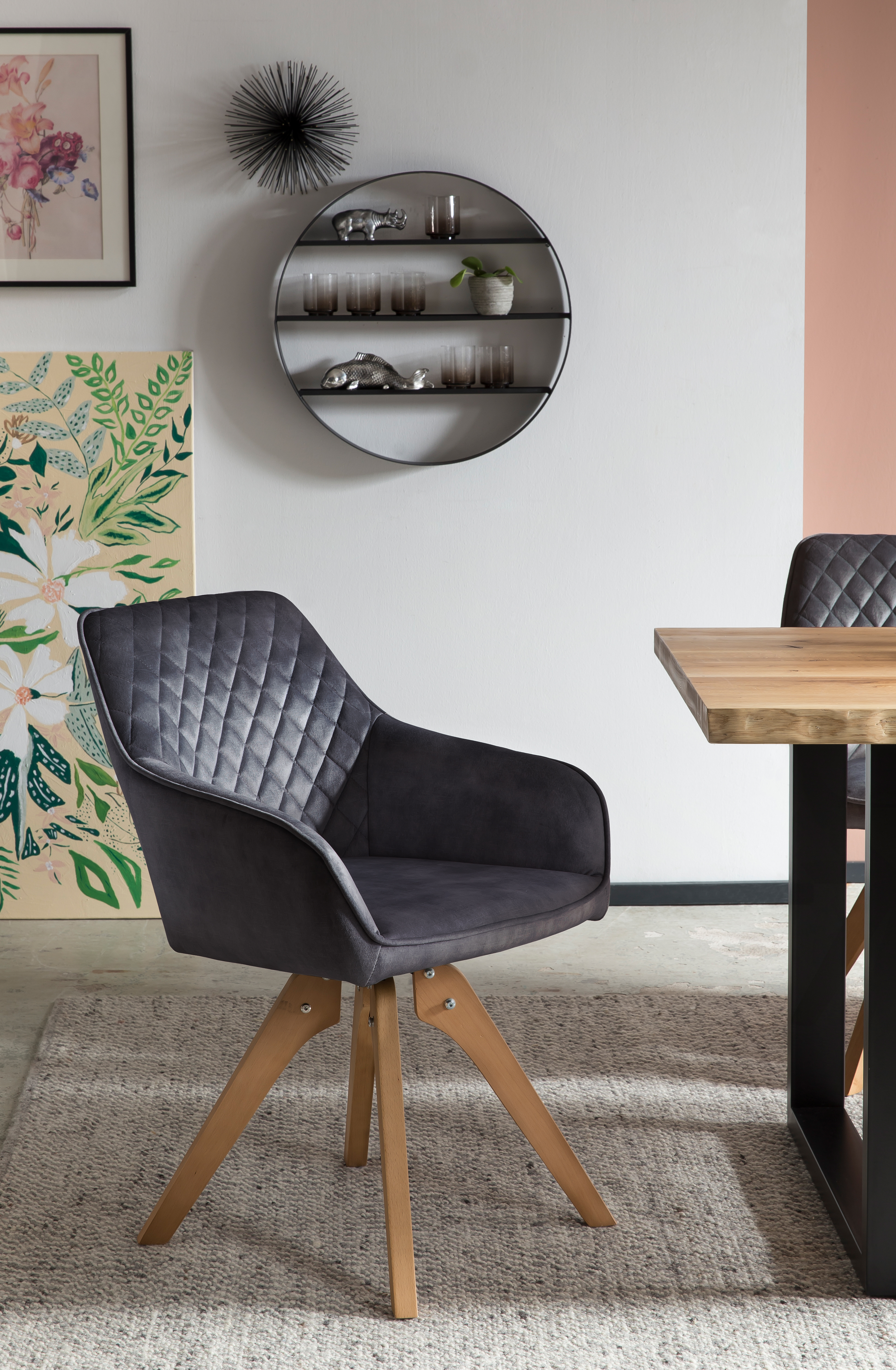 Un souffle vintage pour votre séjour ! L'élégante chaise en velours s'intègrera parfaitement dans votre intérieur. Le revêtement de qualité en tissu velours gris aspect brillant est indémodable. La partie dossier et accoudoirs est arrondie et le dossier pourvu de surpiqûres en losanges attire tous les regards. Le piètement design des pieds en bois massif ton naturel garantit une excellente stabilité et un confort d'assise élevé. Le plateau pivotant à 180° sous l'assise est le vrai point fort de ce modèle. Cette chaise embellira votre salle à manger et peut aussi mettre en valeur votre salon. Le confort d'assise est indescriptible ! Ce meuble attirera également tous les regards une fois placé librement dans la pièce en guise de fauteuil solo.