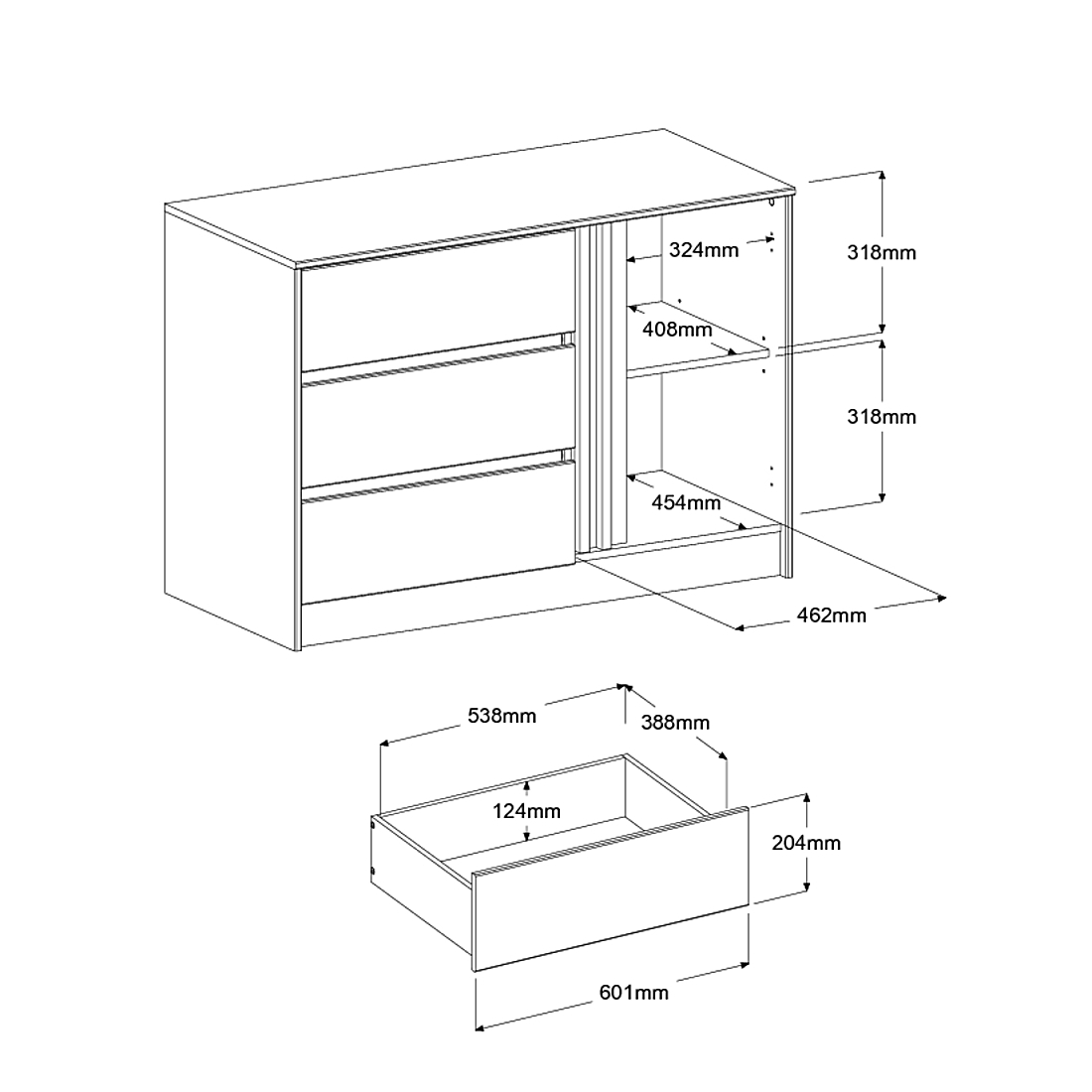 Inserts pivotants au niveau du bahut ou de l’armoire à vêtements : décor chêne du Japon ou ton blanc