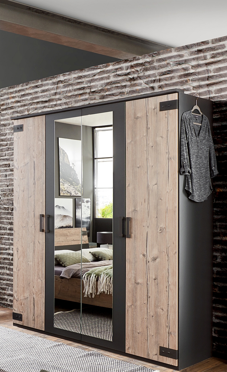 1 armoire 4 portes battantes (dont 2 portes miroir au centre) avec 2 tablettes et 2 barres de penderie