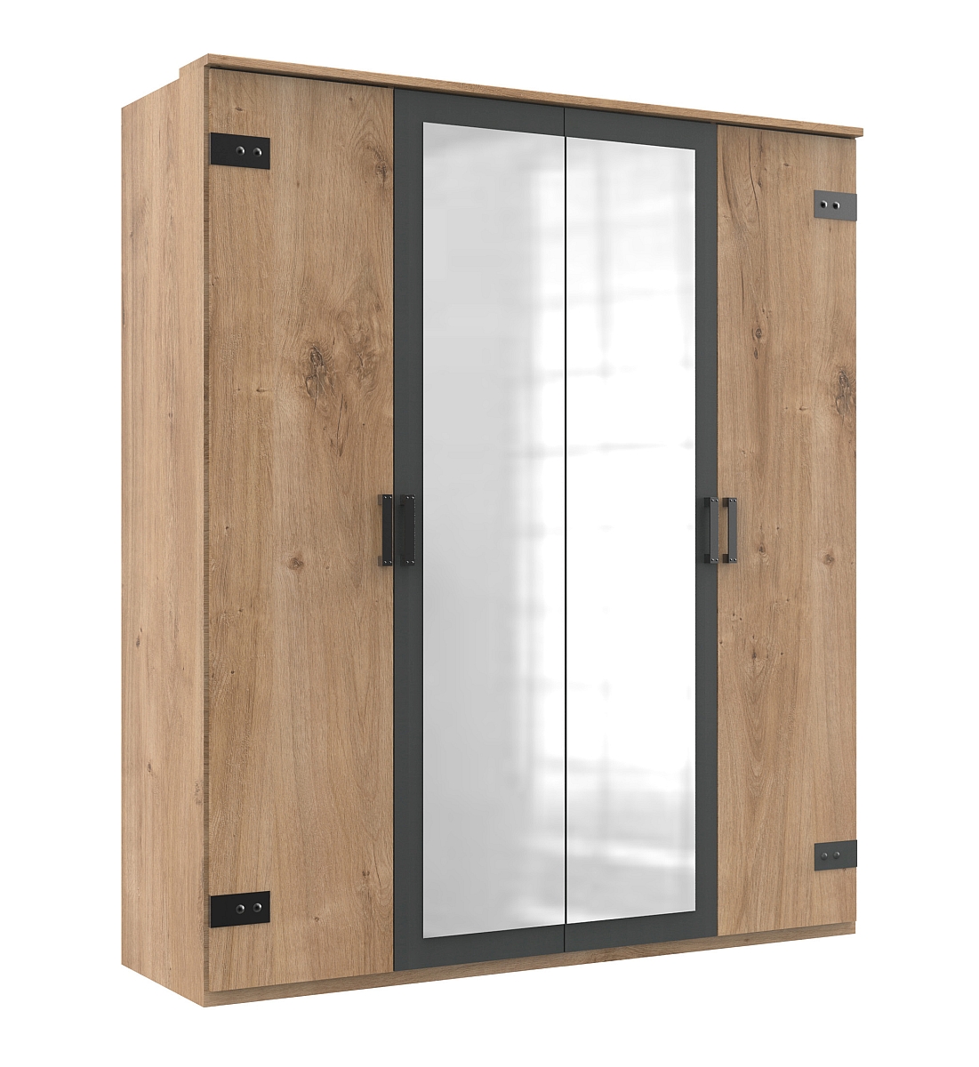 1 armoire 4 portes battantes (dont 2 portes au centre avec miroir), 2 tablettes et 2 barres de penderie