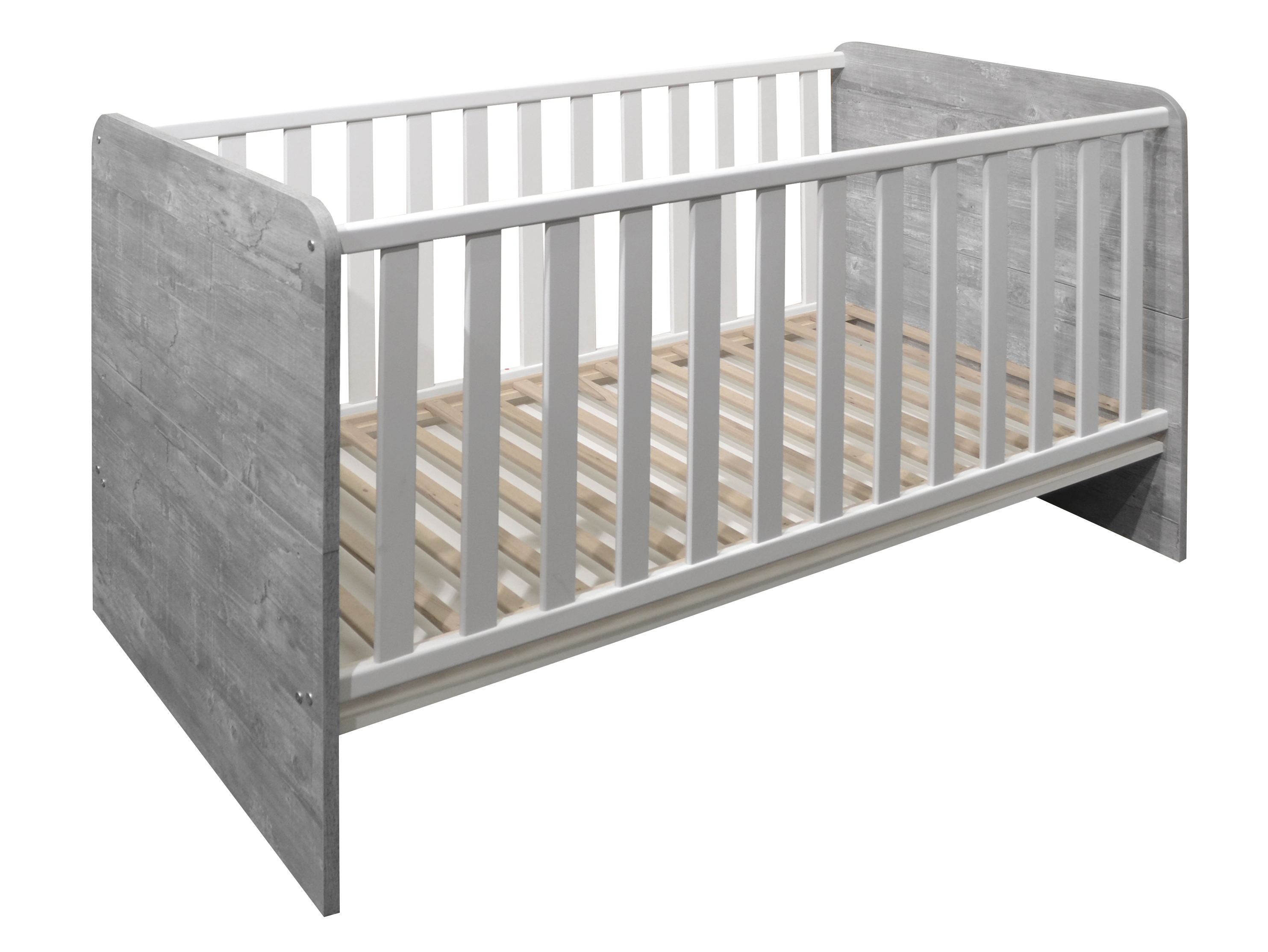 1 lit bébé avec sommier à lattes réglable en hauteur sur 3 niveaux ; barrières latérales à barreaux plats, dont une avec 3 barreaux amovibles