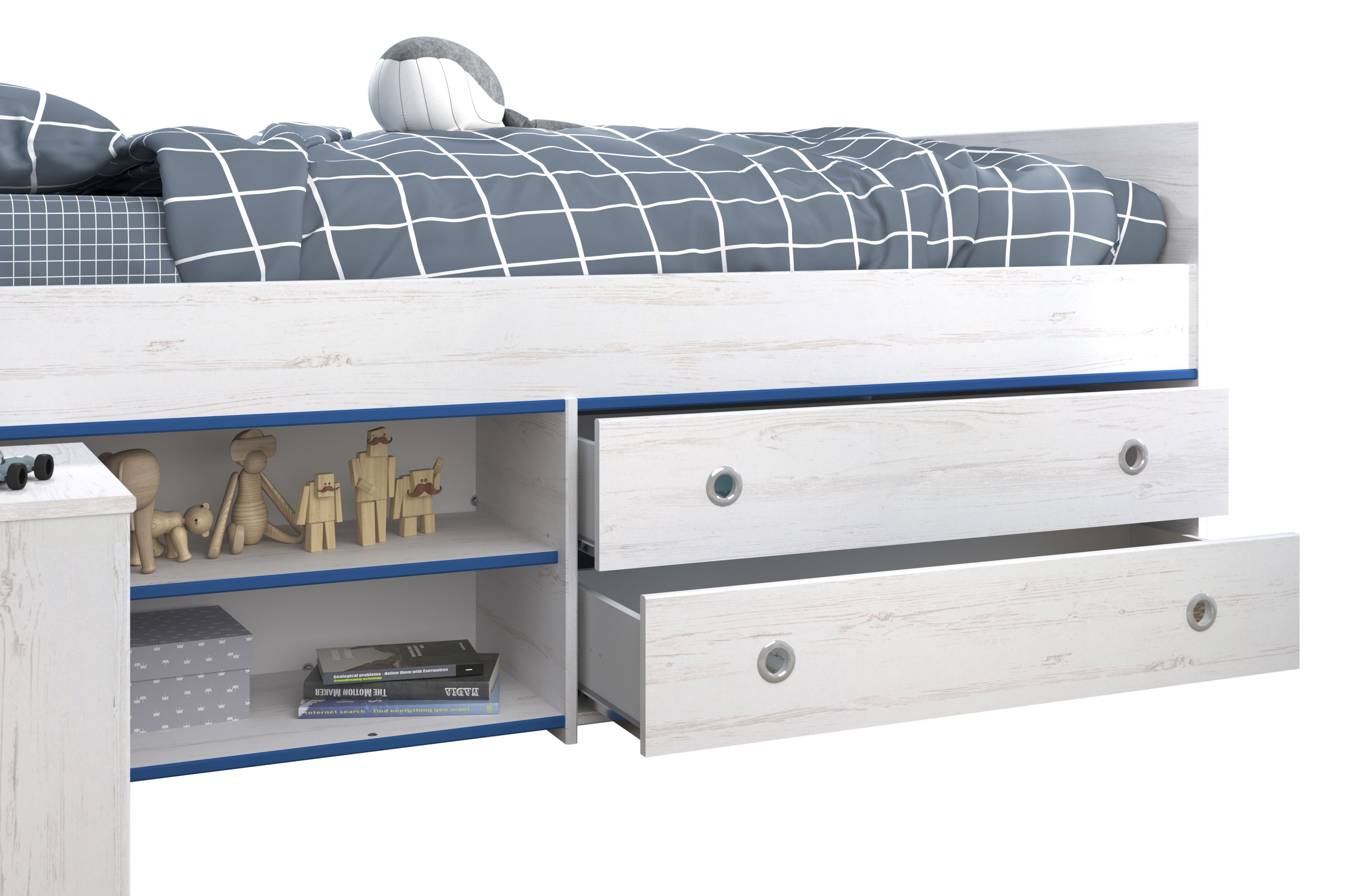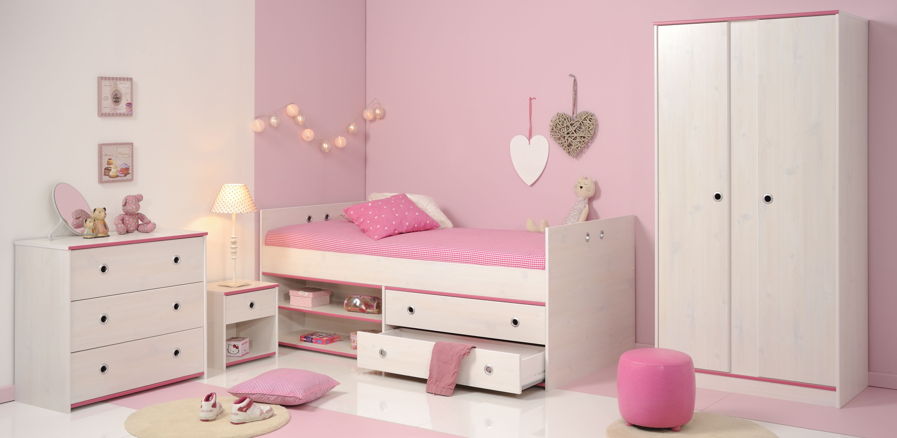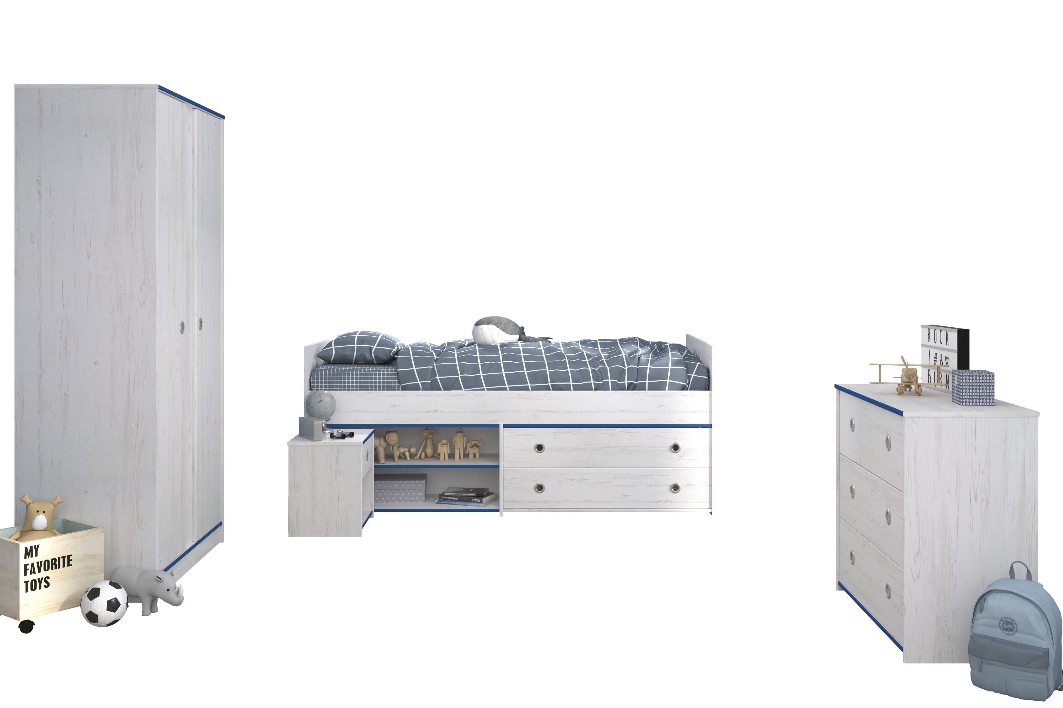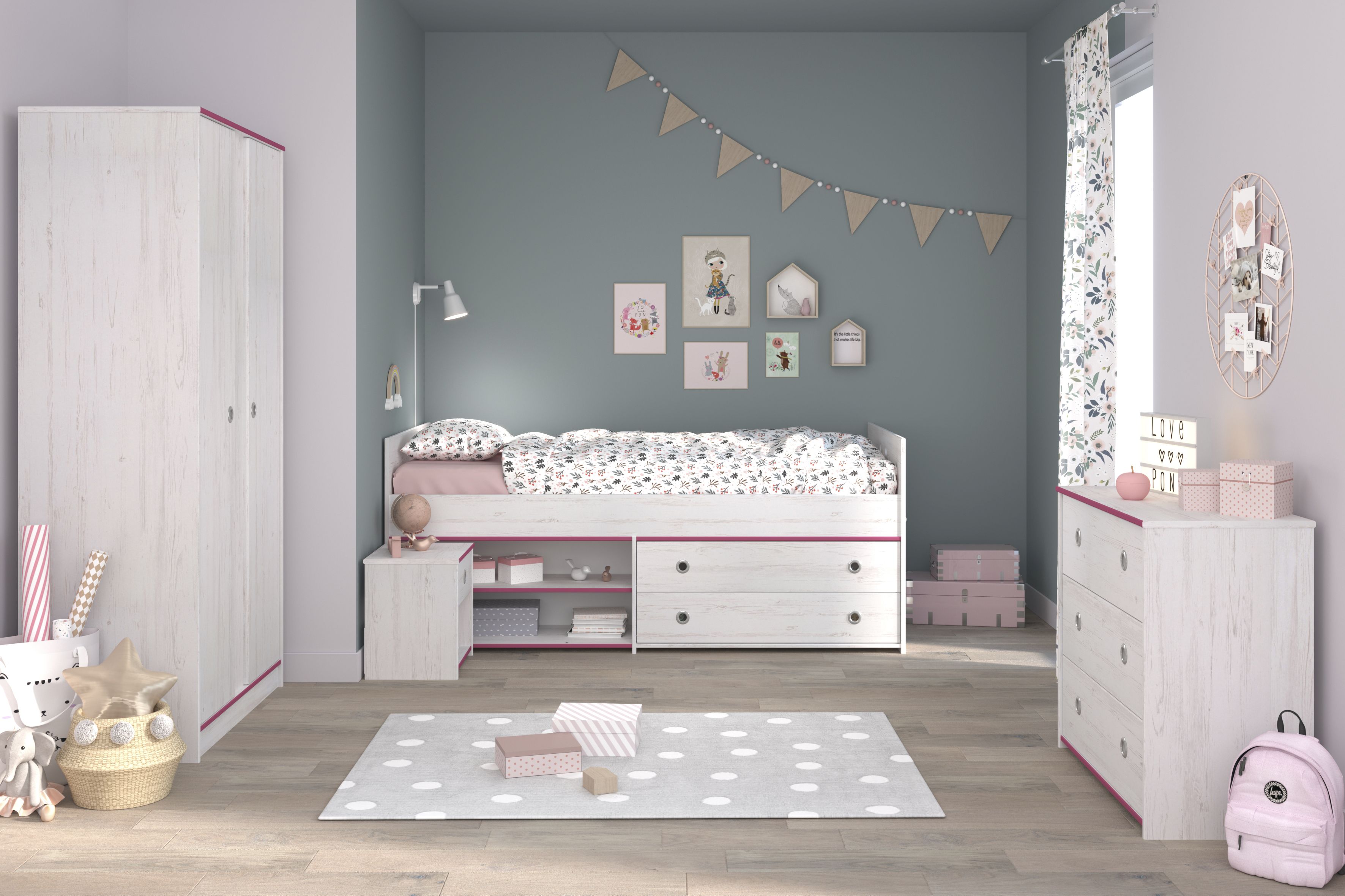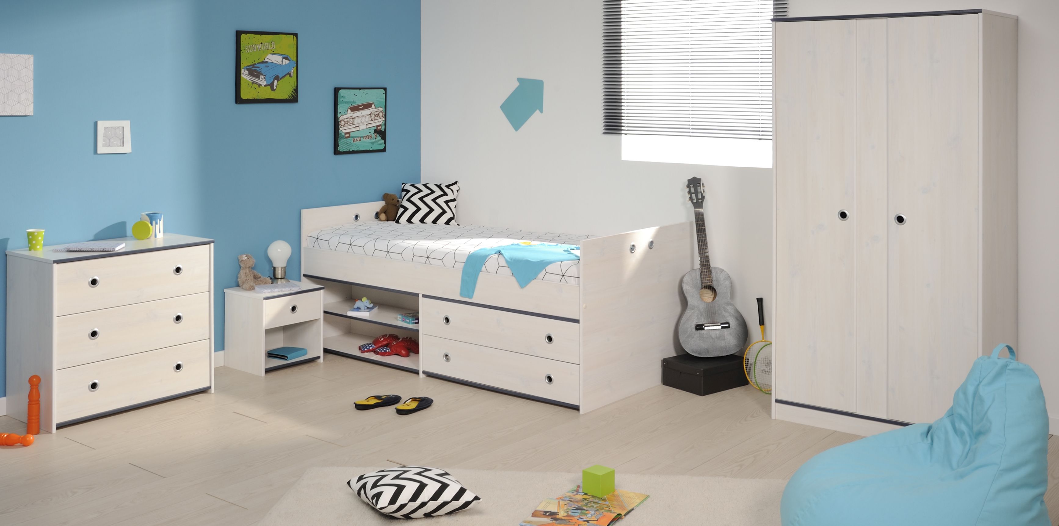 Cette chambre d'ado 4 éléments est proposée dans un coloris clair et créera une ambiance conviviale pour se sentir bien. Les chants ton rose ou bleu lui confèrent un aspect tendance. Le lit confortable avec ses grands tiroirs offre beaucoup de place pour les jouets, les livres et bien plus encore. Un chevet à côté du lit avec un tiroir très pratique permet de faire régner l'ordre. Dans l'armoire à portes battantes, on peut ranger vêtements et accessoires de façon ordonnée. La commode comprise dans l'ensemble, avec ses 3 tiroirs ultra pratiques, offre un espace de rangement supplémentaire.