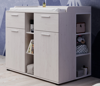 1 commode avec plan à langer, 2 tiroirs et 2 portes (derrière lesquelles se trouve 1 tablette) et un casier ouvert