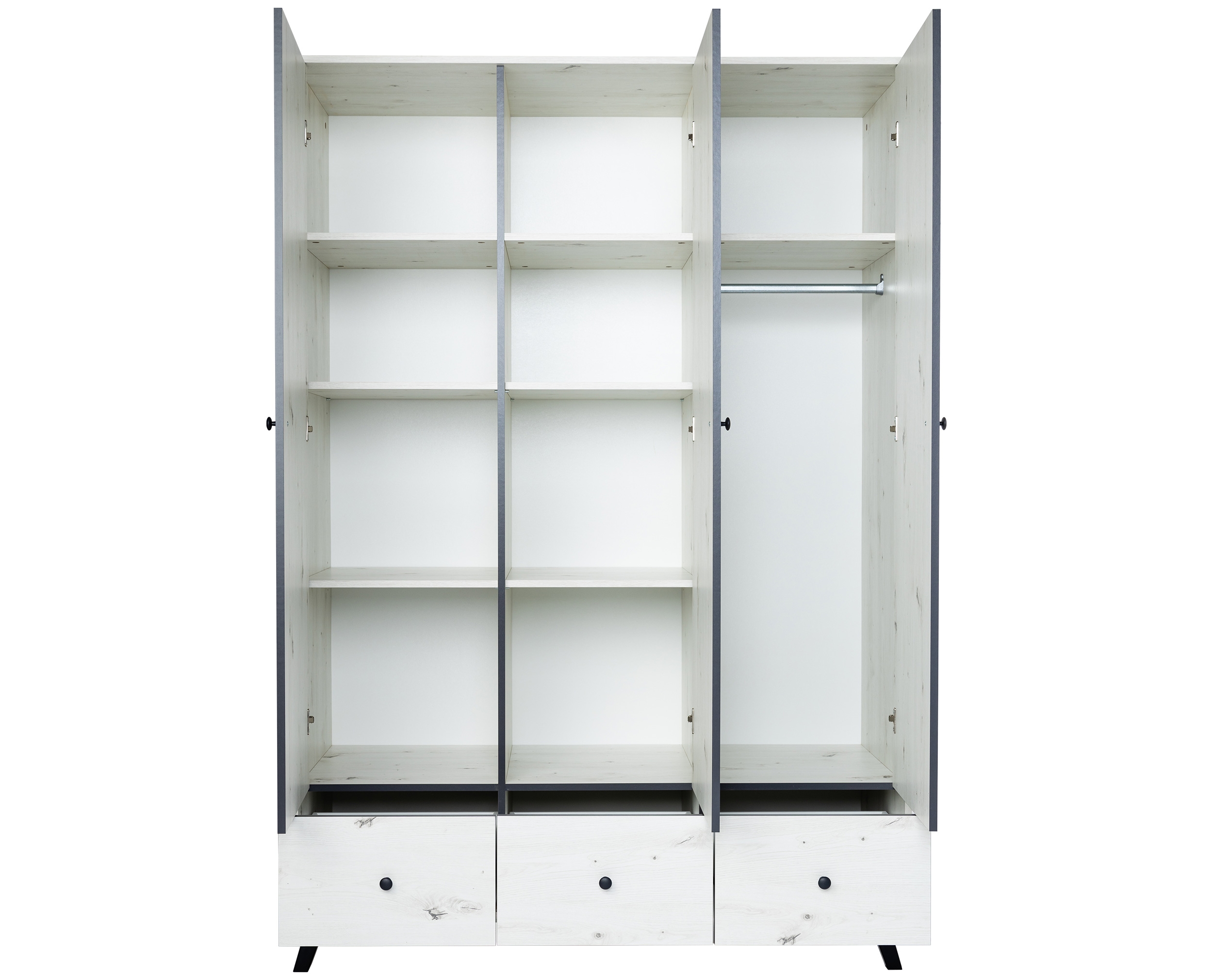 À gauche et au centre : à chaque fois, 3 tablettes amovibles et 1 tiroir