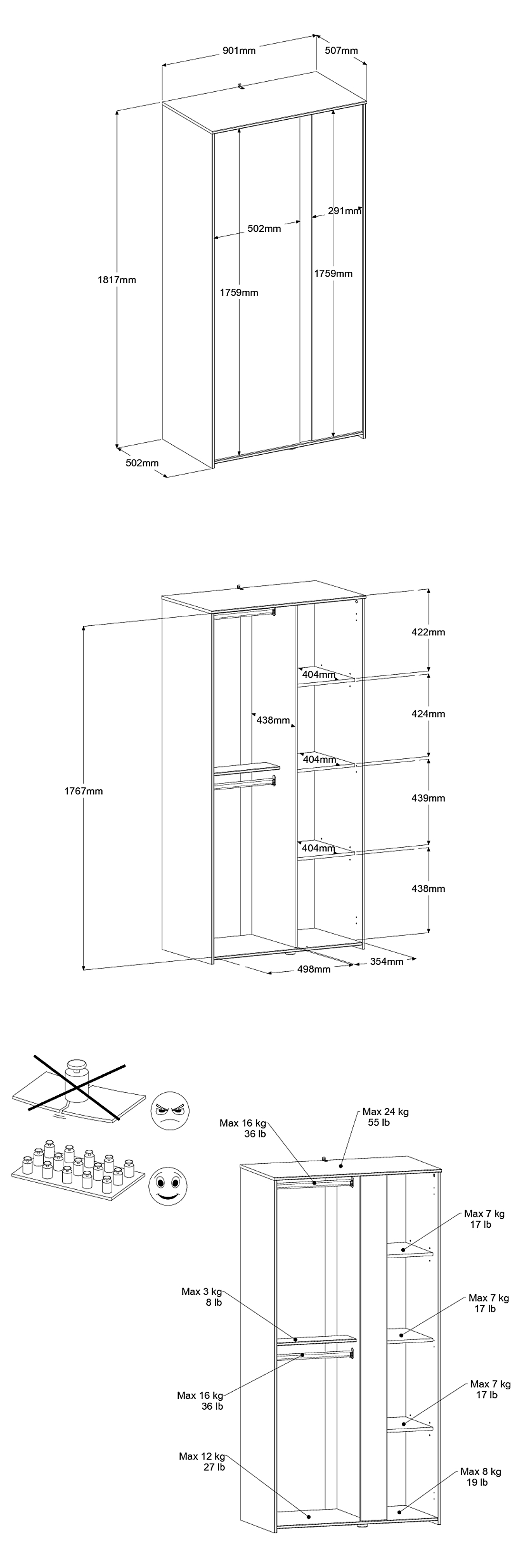 à gauche : 2 barres de penderie et 1 tablette au centre