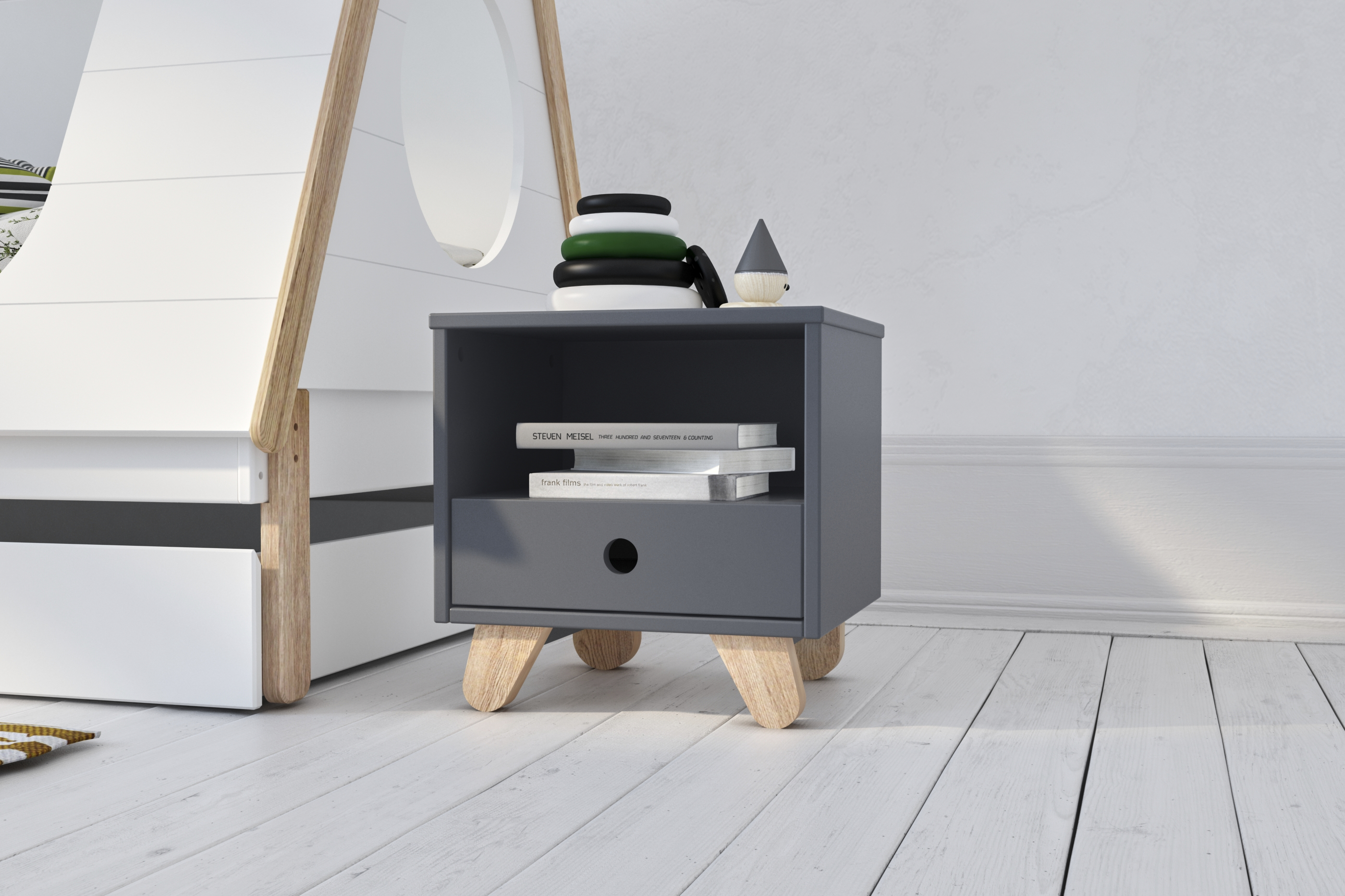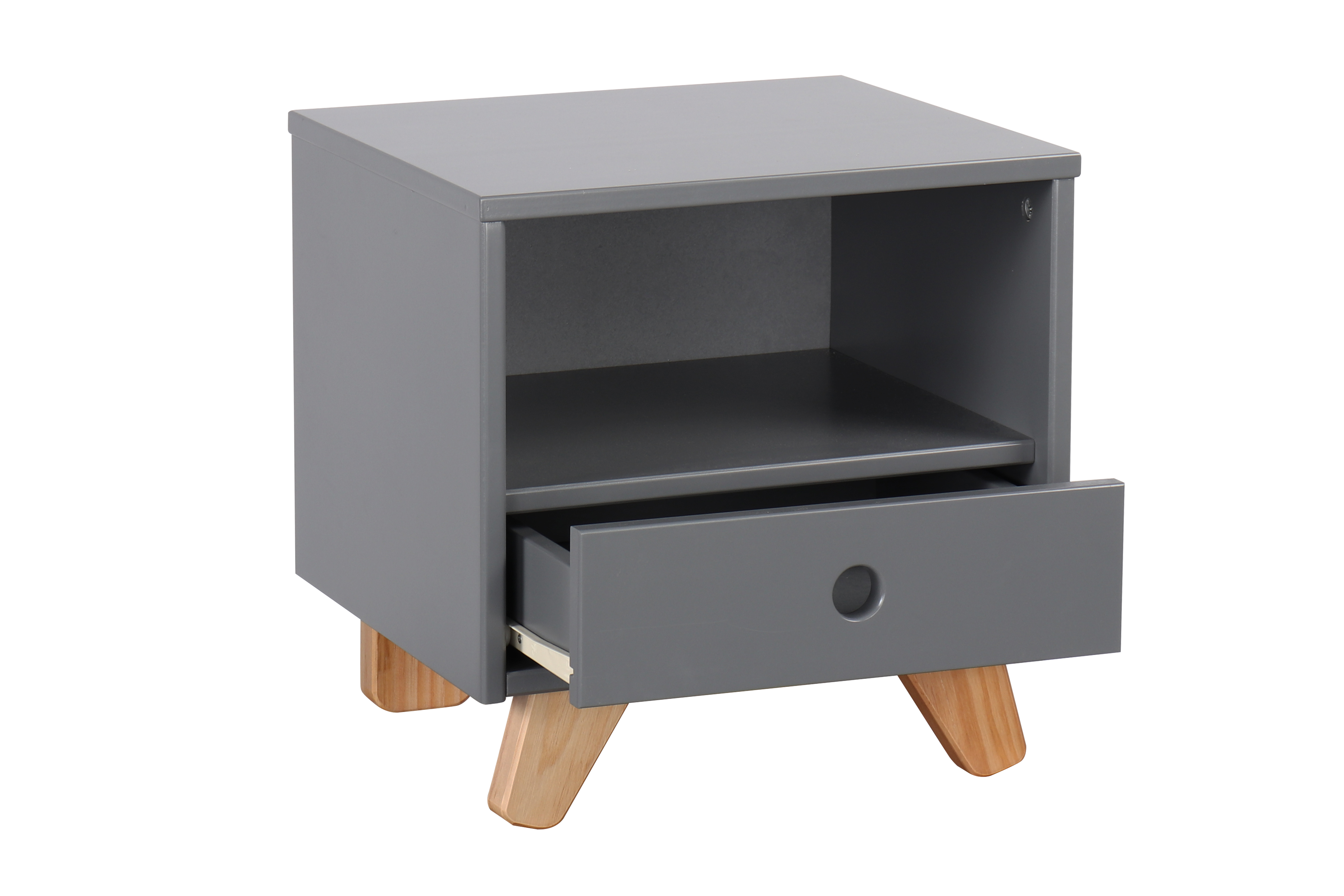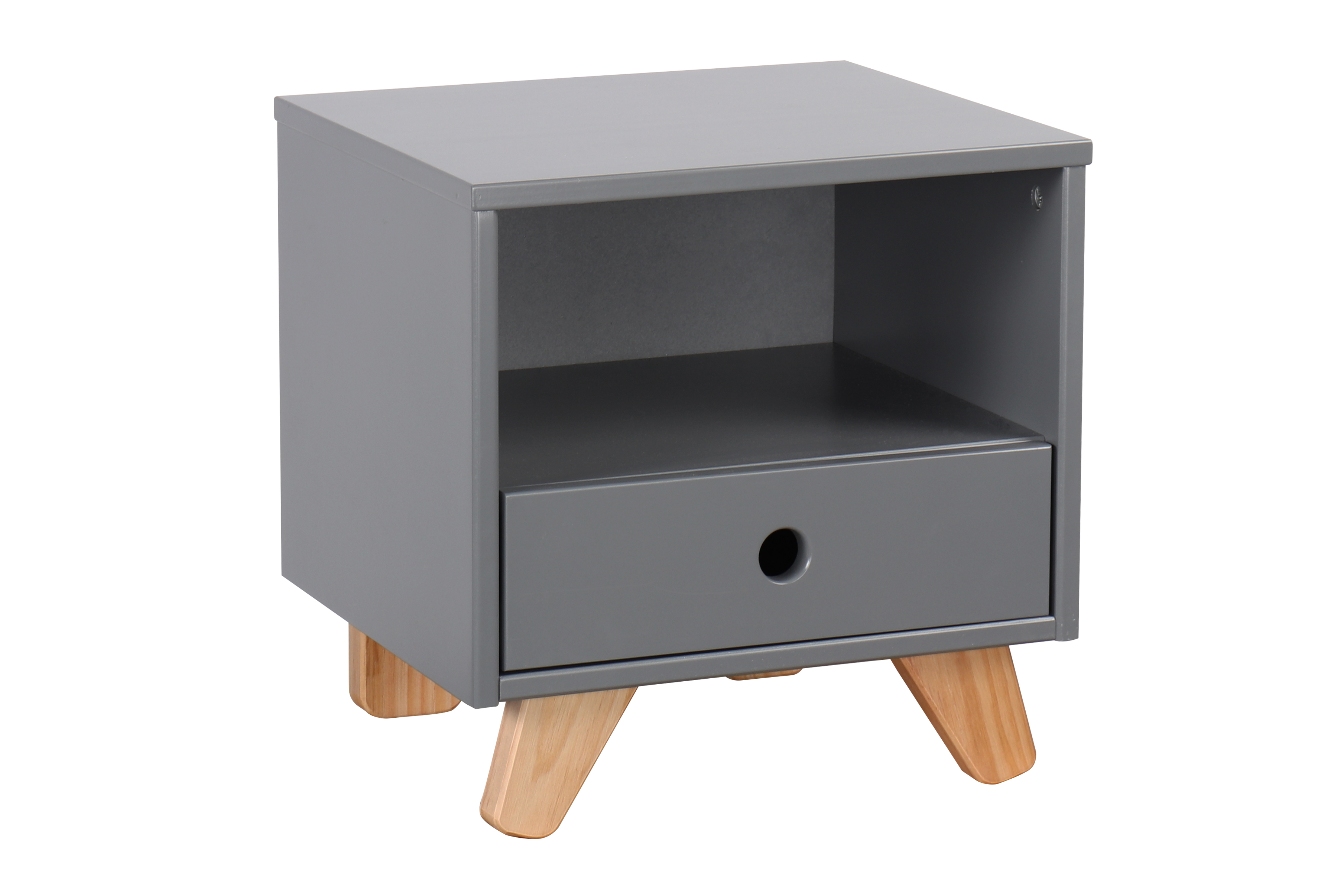 Ce chevet dans un design scandinave classique permet de poser la lampe de chevet et les livres ; il dispose d'un casier ouvert pour un accès facile et d'un tiroir pour un espace de rangement supplémentaire. Le mix nordique et moderne entre les différentes teintes - avec le caisson laqué ton gris et le bois laissé à l'état naturel - attire tous les regards vers cette table de chevet. La sobriété est soulignée par le design sans poignée avec une encoche de forme ronde. Les pieds en biais en bois de pin confèrent à ce chevet un look particulièrement tendance.