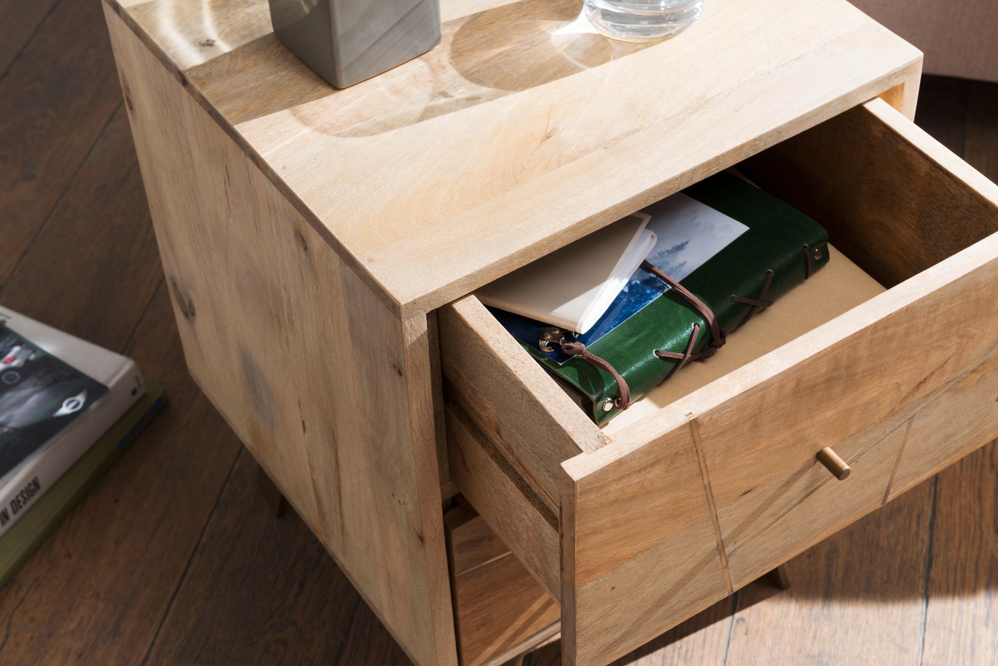- NOTE RUSTIQUE ✔ Faites entrer la nature dans votre chambre à coucher ! Cette table de nuit en bois de manguier dans un style campagne rustique exhale un charme particulier qui investira votre intérieur. De fines bandes métalliques décorent les façades des deux tiroirs et s'harmonisent avec le veinage naturel du bois. Ce chevet est porté par quatre pieds résistants en fer.