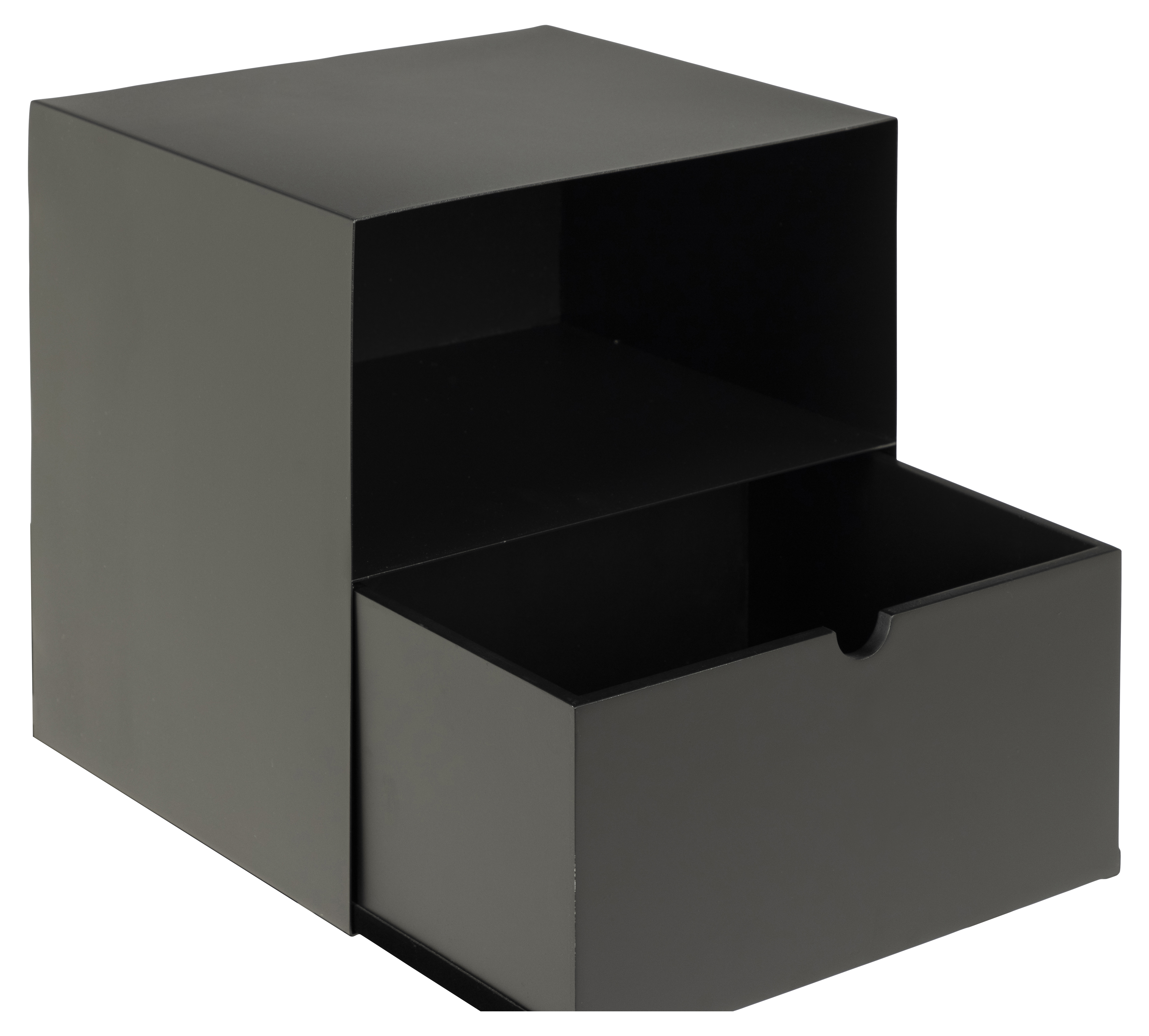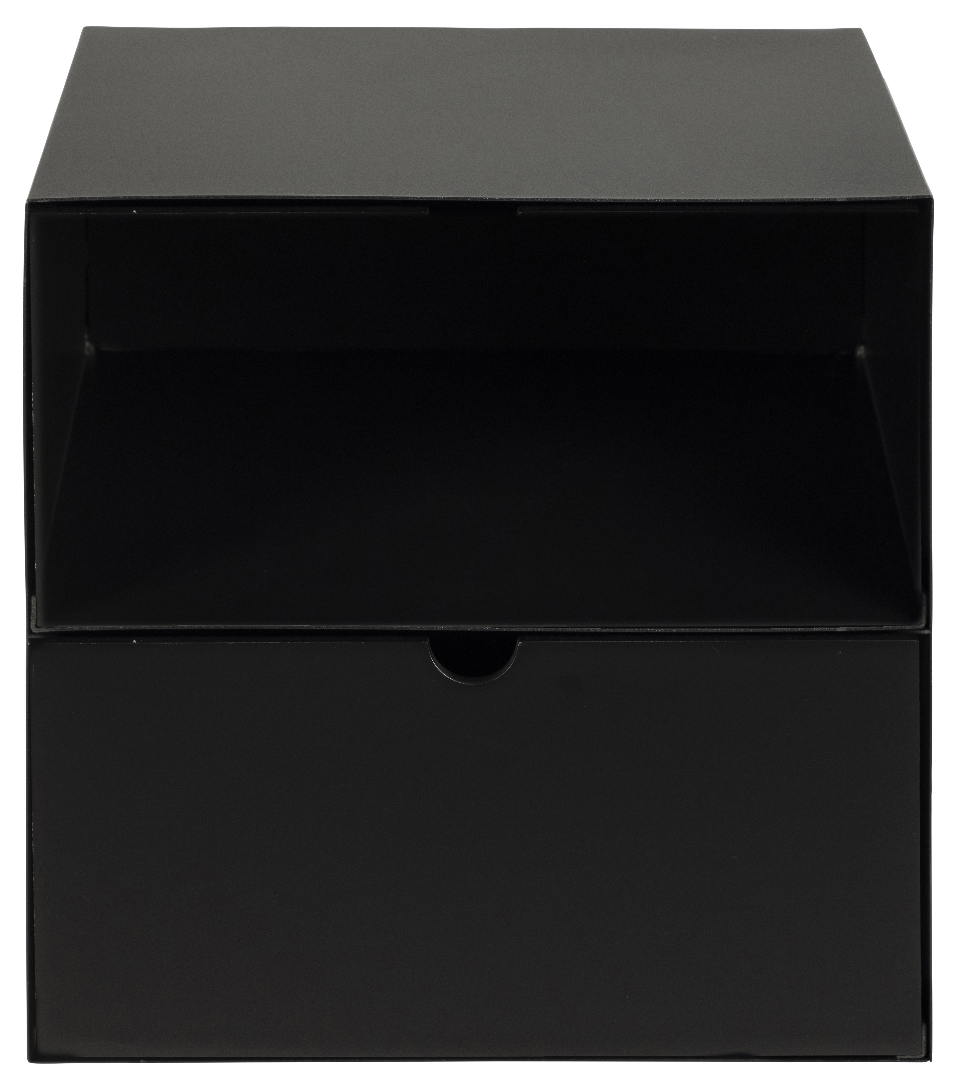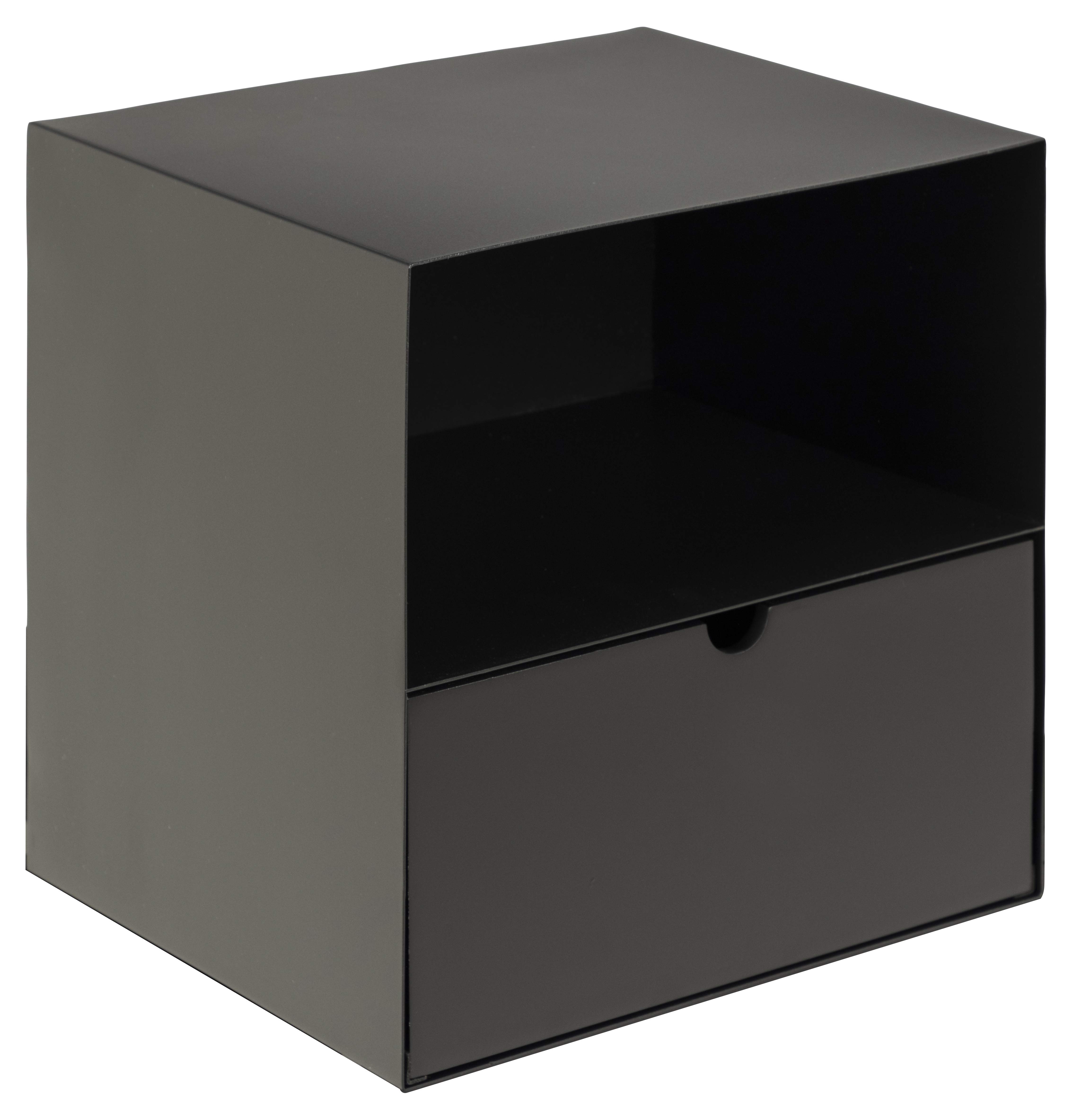 Caisson et façade : métal finition époxy aspect rugueux ton noir mat et un tiroir en MDF (panneau de fibres de bois de densité moyenne) ton noir