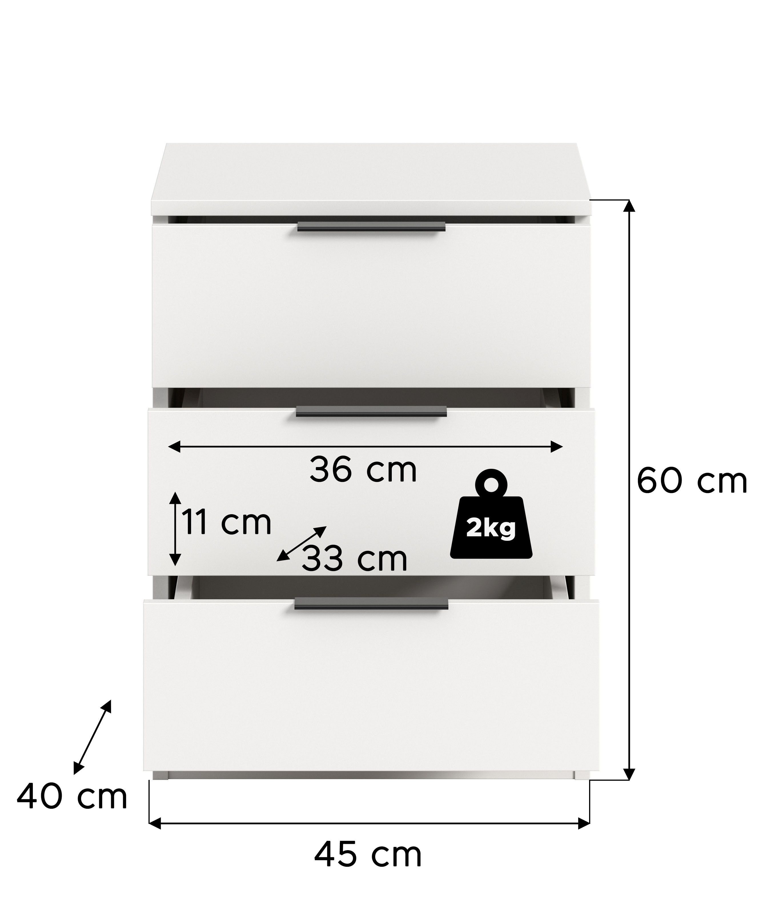 Ce chevet vous offrira un espace de rangement pratique directement à côté du lit, tout en contribuant à faire régner l’ordre dans votre chambre. Avec son design épuré, il aide à créer une atmosphère calme et propice à la détente. Les trois tiroirs à sortie totale permettent d’accéder facilement à vos effets personnels, tandis que les surfaces faciles d’entretien garantissent un nettoyage aisé. Avec ses dimensions compactes (45 x 60 x 40 cm), ce chevet convient également aux petits espaces et s’intègre harmonieusement dans différents styles d’intérieur. Que ce soit pour vos livres, vos lunettes ou votre crème de nuit préférée, ce chevet sera le compagnon idéal de votre routine du soir. Faites confiance à une fabrication de qualité et à des matériaux durables pour profiter longtemps de ce joli meuble. Faites entrer l’ordre et le style dans votre chambre à coucher en commandant dès maintenant votre nouveau chevet !