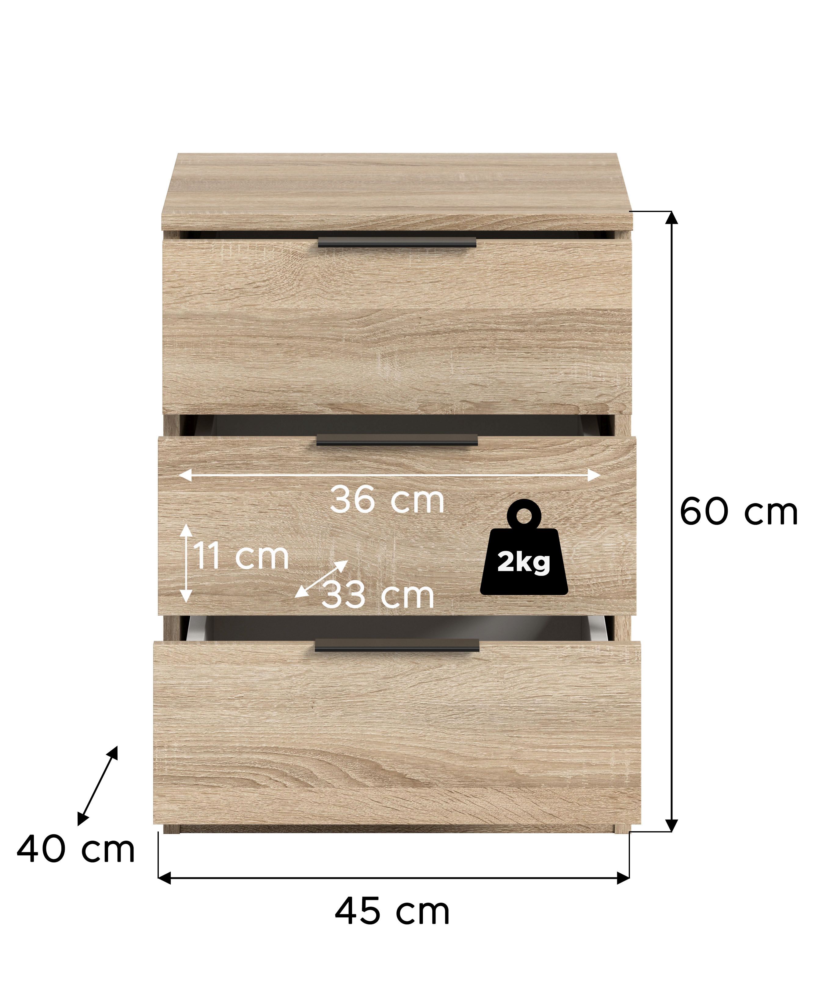 Ce chevet vous offrira un espace de rangement pratique directement à côté du lit, tout en contribuant à faire régner l’ordre dans votre chambre. Avec son design épuré, il aide à créer une atmosphère calme et propice à la détente. Les trois tiroirs à sortie totale permettent d’accéder facilement à vos effets personnels, tandis que les surfaces faciles d’entretien garantissent un nettoyage aisé. Avec ses dimensions compactes (45 x 60 x 40 cm), ce chevet convient également aux petits espaces et s’intègre harmonieusement dans différents styles d’intérieur. Que ce soit pour vos livres, vos lunettes ou votre crème de nuit préférée, ce chevet sera le compagnon idéal de votre routine du soir. Faites confiance à une fabrication de qualité et à des matériaux durables pour profiter longtemps de ce joli meuble. Faites entrer l’ordre et le style dans votre chambre à coucher en commandant dès maintenant votre nouveau chevet !