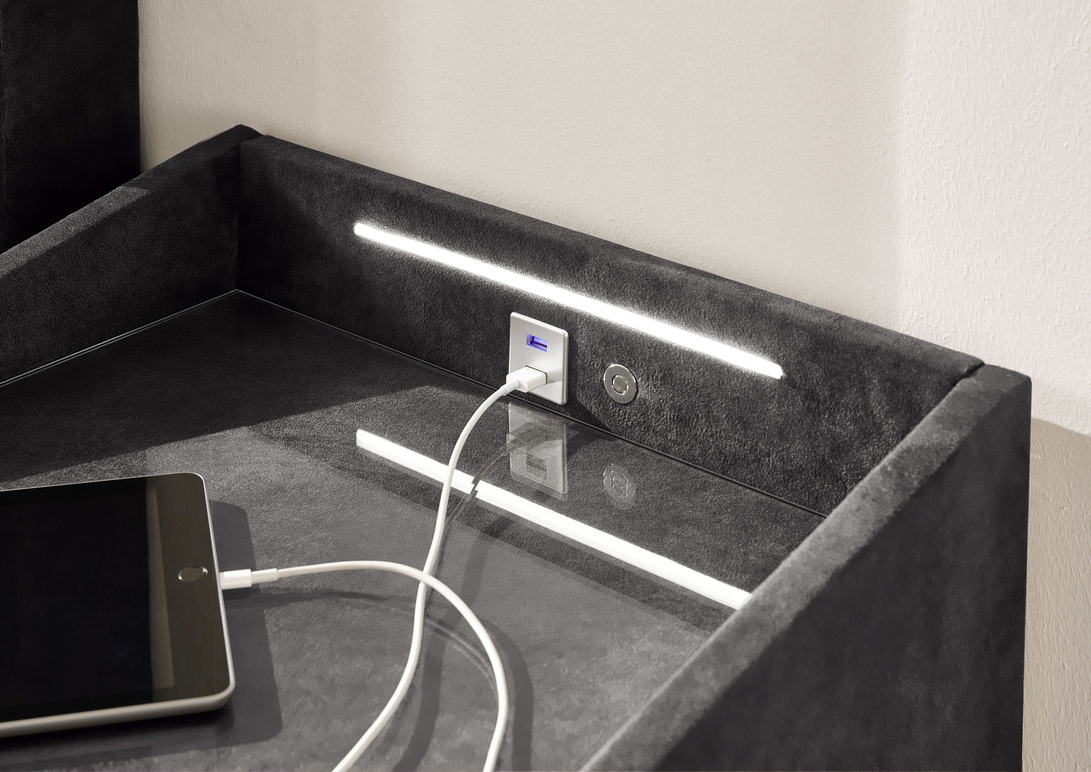 | Ausstattung Kommoden Phono Büro Regal: | Plateau en verre, Tiroirs, avec port USB, incl. éclairage | ||